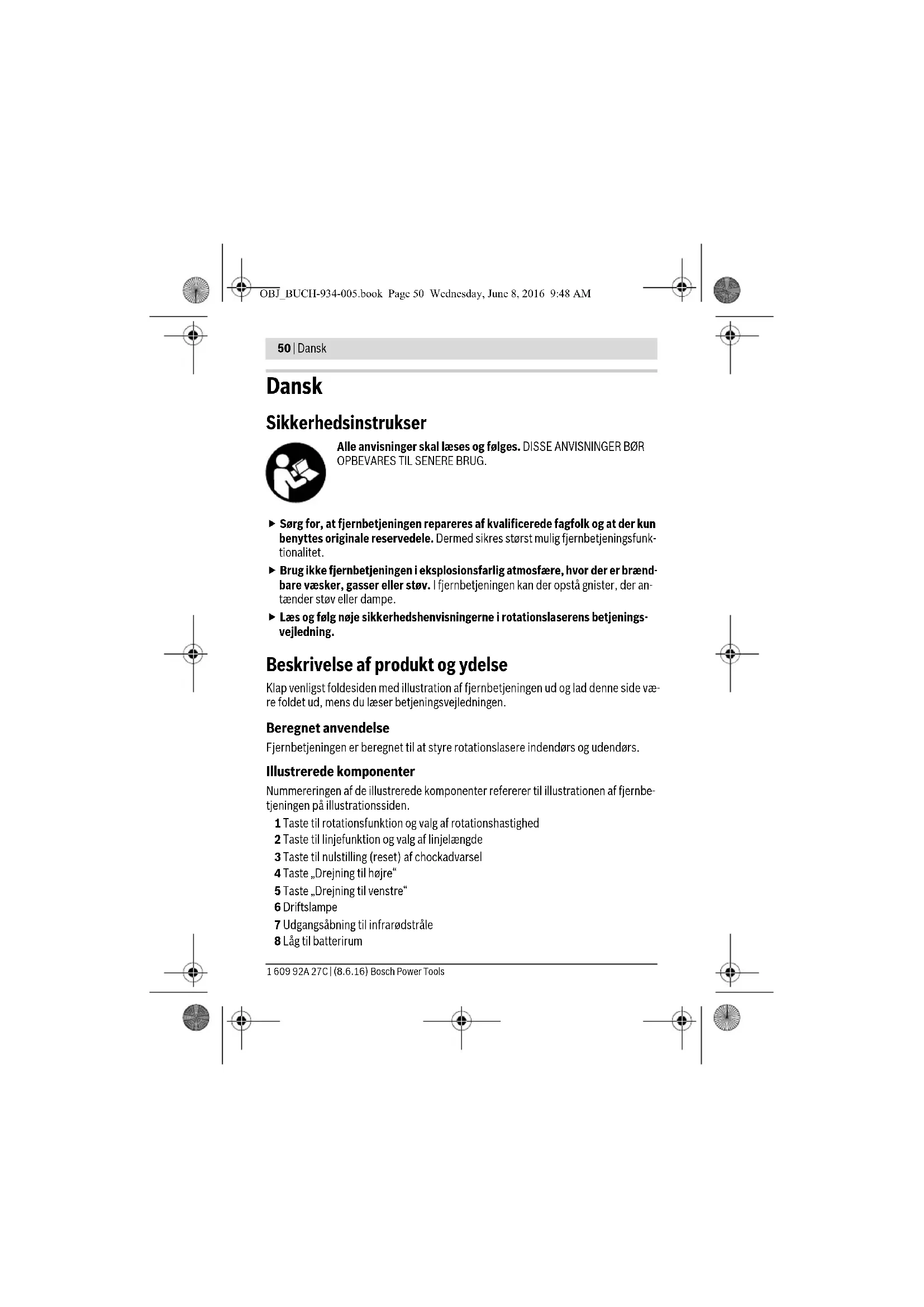 Din fjernbetjening identificeres entydigt vha. serienummeret 10 på typeskiltet. OBJ_BUCH-934-005.book Page 51 Wednesday, June 8, 2016 9:48 AM52 | Dansk 1 609 92A 27C | (8.6.16) Bosch Power Tools Opstil rotationslaseren på en sådan måde, at fjernbetjeningens signaler i direkte ret- ning når en af modtagelinserne på rotationslaser (se rotationslaserens betjeningsvej- ledning). Kan fjernbetjeningen ikke rettes direkte på en modtagelinse, forringes ar- bejdsområdet. Ved signalets refleksioner (f.eks. på vægge) kan rækkevidden også forbedres igen ved indirekte signal. Når der trykkes på en taste på fjernbetjeningen, gør en lysende driftslampe 6 op- mærksom på, at der er blevet sendt et signal. Det er ikke muligt at tænde/slukke for rotationslaseren med fjernbetjeningen. Funktioner Detaljerede informationer vedr. rotationslaserens funktioner findes i rotationslase- rens betjeningsvejledning. Rotationsfunktion (150/300/600 min