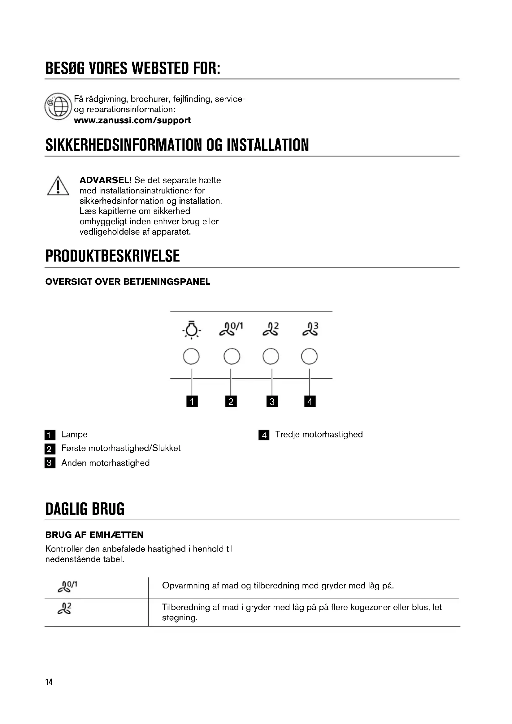 ADVARSEL! Se det separate hæfte med installationsinstruktioner for sikkerhedsinformation og installation. Læs kapitlerne om sikkerhed omhyggeligt inden enhver brug eller vedligeholdelse af apparatet. PRODUKTBESKRIVELSE