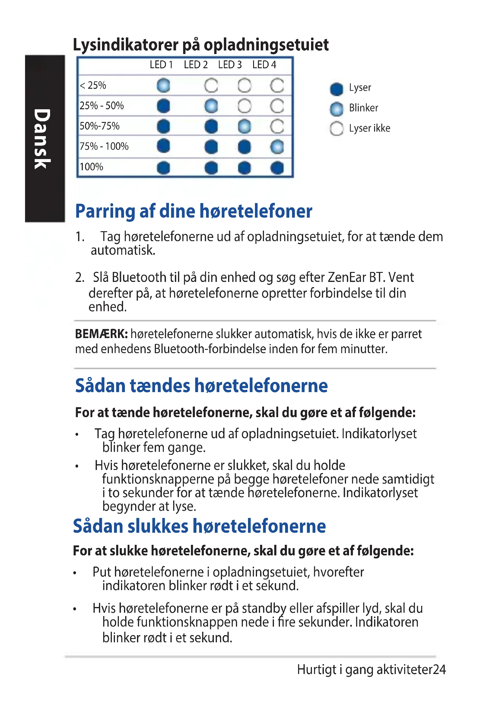 automatisk. 2.SlåBluetoothtilpådinenhedogsøgefterZenEarBT.Vent derefterpå,athøretelefonerneopretterforbindelsetildin enhed. BEMÆRK: høretelefonerneslukkerautomatisk,hvisdeikkeerparret medenhedensBluetooth-forbindelseindenforfemminutter. Sådan tændes høretelefonerne For at tænde høretelefonerne, skal du gøre et af følgende:
