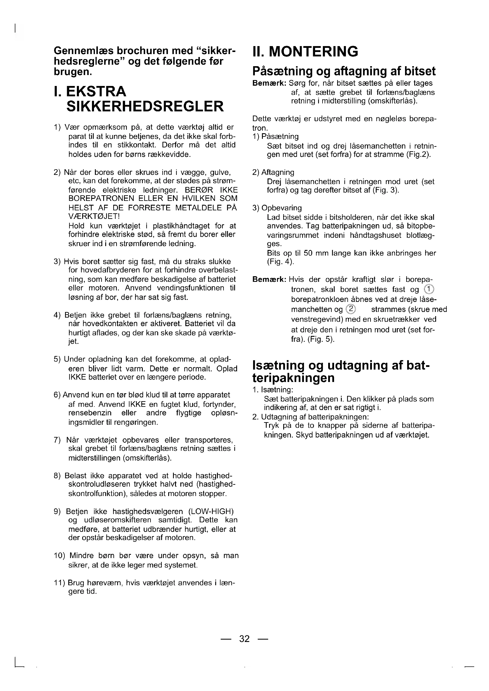 Påsætning og aftagning af bitset Bemærk: Sørg for, når bitset sættes på eller tagesaf, at sætte grebet til forlæns/baglænsretning i midterstilling (omskifterlås).Dette værktøj er udstyret med en nøgleløs borepa-tron.1) PåsætningSæt bitset ind og drej låsemanchetten i retnin-gen med uret (set forfra) for at stramme (Fig.2).2) AftagningDrej låsemanchetten i retningen mod uret (setforfra) og tag derefter bitset af (Fig. 3).3) OpbevaringLad bitset sidde i bitsholderen, når det ikke skalanvendes. Tag batteripakningen ud, så bitopbe-varingsrummet indeni håndtagshuset blotlæg- ges. Bits op til 50 mm lange kan ikke anbringes her(Fig. 4).Bemærk: Hvis der opstår kraftigt slør i borepa-tronen, skal boret sættes fast og borepatronkloen åbnes ved at dreje låse-manchetten og strammes (skrue medvenstregevind) med en skruetrækker vedat dreje den i retningen mod uret (set for-fra). (Fig. 5). Isætning og udtagning af bat- teripakningen 1. Isætning:Sæt batteripakningen i. Den klikker på plads somindikering af, at den er sat rigtigt i.2. Udtagning af batteripakningen:Tryk på de to knapper på siderne af batteripa-kningen. Skyd batteripakningen ud af værktøjet.