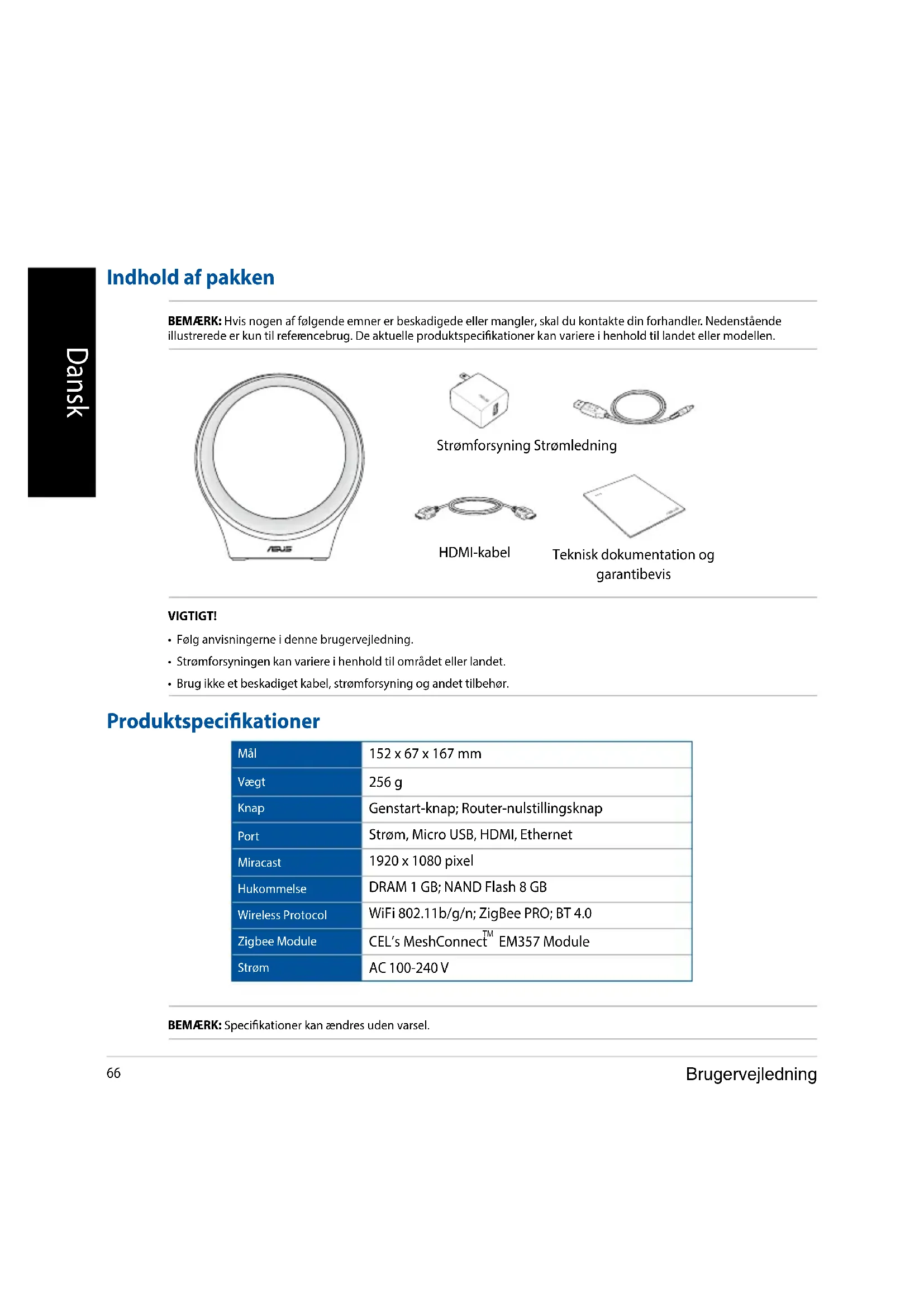 - Brug ikke et beskadiget kabel, strømforsyning og andet tilbehør. Indhold af pakken BEMÆRK: Hvis nogen af følgende emner er beskadigede eller mangler, skal du kontakte din forhandler. Nedenstående illustrerede er kun til referencebrug. De aktuelle produktspecikationer kan variere i henhold til landet eller modellen. Produktspecikationer Mål 152 x 67 x 167 mm Vægt 256 g Knap Genstart-knap; Router-nulstillingsknap Port Strøm, Micro USB, HDMI, Ethernet Miracast 1920 x 1080 pixel Hukommelse DRAM 1 GB; NAND Flash 8 GB Wireless Protocol WiFi 802.11b/g/n; ZigBee PRO; BT 4.0 Zigbee Module CEL’s MeshConnect