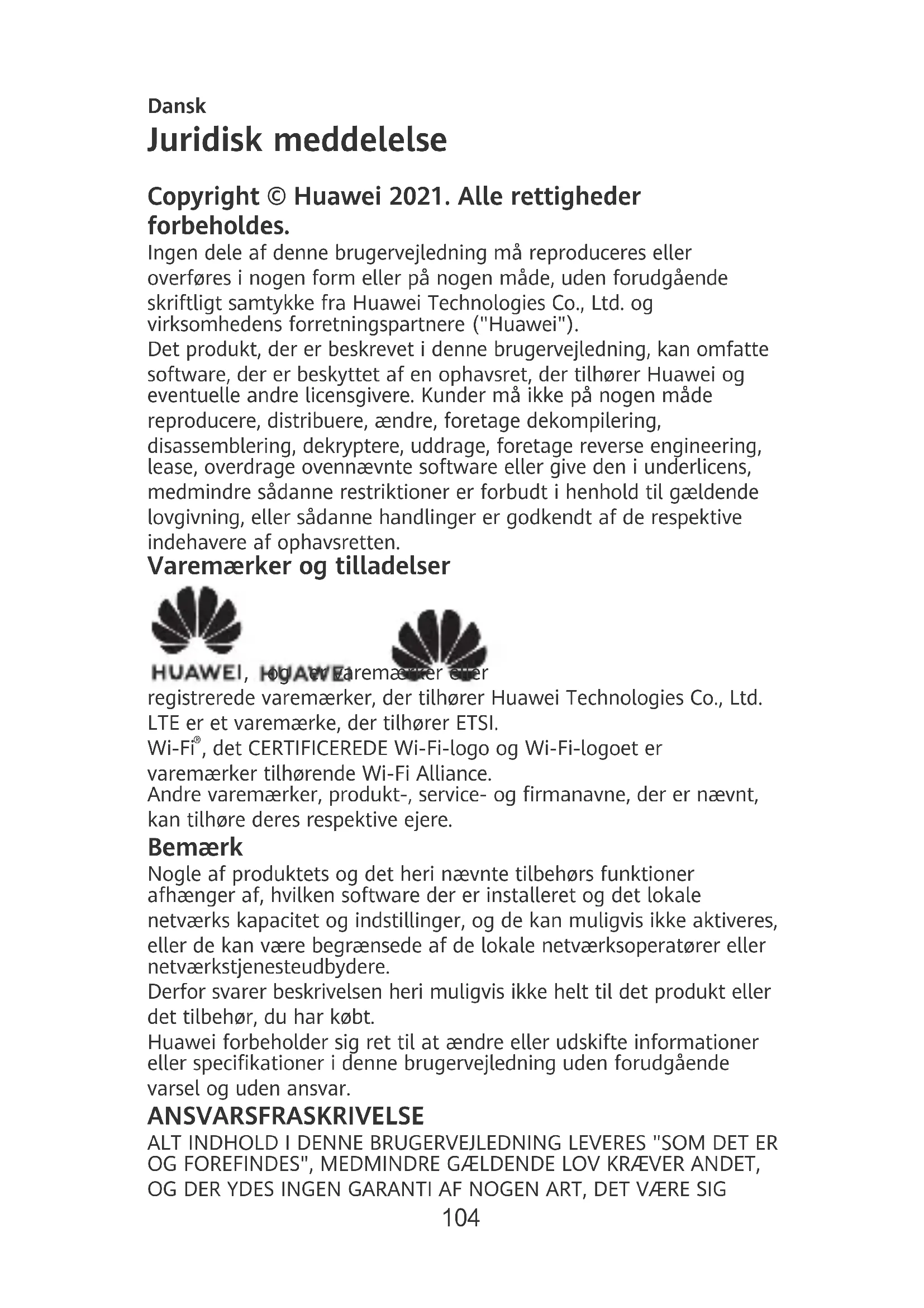 , det CERTIFICEREDE Wi-Fi-logo og Wi-Fi-logoet er varemærker tilhørende Wi-Fi Alliance. Andre varemærker, produkt-, service- og rmanavne, der er nævnt, kan tilhøre deres respektive ejere. Bemærk Nogle af produktets og det heri nævnte tilbehørs funktioner afhænger af, hvilken software der er installeret og det lokale netværks kapacitet og indstillinger, og de kan muligvis ikke aktiveres, eller de kan være begrænsede af de lokale netværksoperatører eller netværkstjenesteudbydere. Derfor svarer beskrivelsen heri muligvis ikke helt til det produkt eller det tilbehør, du har købt. Huawei forbeholder sig ret til at ændre eller udskifte informationer eller specikationer i denne brugervejledning uden forudgående varsel og uden ansvar. ANSVARSFRASKRIVELSE ALT INDHOLD I DENNE BRUGERVEJLEDNING LEVERES "SOM DET ER OG FOREFINDES", MEDMINDRE GÆLDENDE LOV KRÆVER ANDET, OG DER YDES INGEN GARANTI AF NOGEN ART, DET VÆRE SIG 104UDTRYKKELIGT ELLER IMPLICIT, HERUNDER MEN IKKE BEGRÆNSET TIL UNDERFORSTÅET GARANTI FOR SALGBARHED ELLER EGNETHED TIL ET BESTEMT FORMÅL, MED HENSYN TIL NØJAGTIGHED, PÅLIDELIGHED ELLER INDHOLDET I DENNE BRUGERVEJLEDNING. I DET OMFANG GÆLDENDE LOV TILLADER, KAN HUAWEI UNDER INGEN OMSTÆNDIGHEDER HOLDES ANSVARLIG FOR SÆRLIGE, TILFÆLDIGE, INDIREKTE ELLER FØLGESKADER, ELLER TAB AF FORTJENESTE, HANDEL, INDTJENING, DATA, GOODWILL,