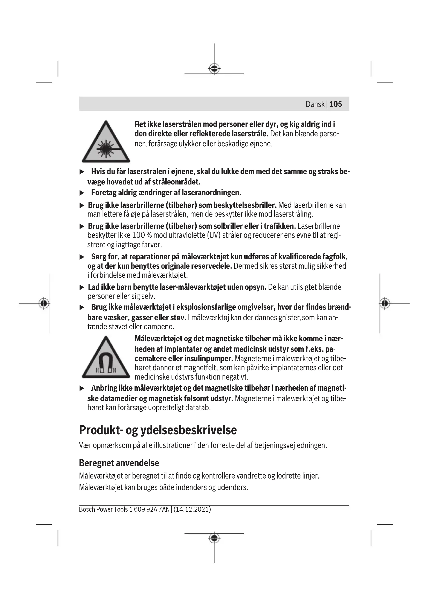 Laserklasse 2 Lasertype 630-650nm, <1mW C₆ 1 Divergens 0,5mrad (360°-vinkel) Stativholder 1/4"; 5/8" Batterier 3×1,5VLR6(AA) Driftstid ved driftstilstand – Krydslinjedrift 9t – Linjedrift 17t Vægt iht. EPTA-Procedure01:2014 0,49kg Mål (længde× bredde× højde) 112×55×106mm Kapslingsklasse IP54 (støv - og stænkvands- beskyttet) A) Arbejdsområdet kan forringes af ugunstige omgivelsesbetingelser (f.eks. direkte sollys). B) Der forekommer kun en ikke-ledende tilsmudsning, idet der dog lejlighedsvis må forventes en midlertidig ledeevne forårsaget af tildugning. Serienummeret (10) på typeskiltet bruges til entydig identifikation af måleværktøjet. Bosch Power Tools 1 609 92A 7AN | (14.12.2021)108 | Dansk Montering Isætning/skift af batterier Det anbefales at bruge alkaliske manganbatterier til måleværktøjet. Låget til batterirummet(11) åbnes ved at trykke på låsen(12) og tage låget til batte- rirummet af. Isæt batterierne. Sørg i den forbindelse for, at polerne vender rigtigt som vist på indersiden af batterirum- met. Hvis batterierne er svage, blinker statusvisningen(7). Måleværktøjet kan stadig bruges i ca. 1 t efter den første blinken. Udskift altid alle batterier samtidig. Brug kun batterier fra en og samme producent og med samme kapacitet. u Tag batterierne ud af måleværktøjet, hvis det ikke skal bruges i længere tid. Bat- terierne kan korrodere og aflade sig selv, hvis de bliver siddende i længere tid. Arbejde med drejeholderRM1 (sebilledeA–B) Ved hjælp af drejeholderen(13) kan du dreje måleværktøjet 360°. Derved kan laser- linjerne justeres præcist uden at ændre måleværktøjets position. Sæt måleværktøjet med styrenoten (17) på styreskinnen (14) på drejeholderen (13), og skub måleværktøjet på platformen til anslag. Træk måleværktøjet af drejeholderen i modsat retning for at skære. Positioneringsmuligheder for drejeholderen: – Stående på en jævn flade, – skruet fast på en lodret flade, – i forbindelse med loftsklemmen (18) på metalliske loftslister, – ved hjælp af magneterne(16) på metalliske overflader. u Berør ikke bagsiden af det magnetiske tilbehør, når du fastgør tilbehøret til overflader. Magneternes stærke trækkraft kan resultere i, at dine fingre bliver klemt fast. Brug Ibrugtagning u Beskyt måleværktøjet mod fugt og direkte sollys. 1 609 92A 7AN | (14.12.2021) Bosch Power ToolsDansk | 109 u Udsæt ikke måleværktøjet for ekstreme temperaturer eller temperatursvingnin- ger. Lad det f.eks. ikke ligge i længere tid i bilen. Ved større temperatursvingninger skal måleværktøjets temperatur først tilpasse sig, og før du fortsætter arbejdet, skal der altid udføres en nøjagtighedskontrol (se "Nøjagtighedskontrol af måleværktøjet", Side111). Ved ekstreme temperaturer eller temperatursvingninger kan måleværktøjets præci- sion påvirkes. u Undgå, at måleværktøjet udsættes for kraftige stød eller tabes. Hvis måleværktø- jet har været udsat for kraftig ydre påvirkning, skal du foretage en nøjagtighedskontrol af det, før du fortsætter arbejdet (se "Nøjagtighedskontrol af måleværktøjet", Si- de111). u Sluk måleværktøjet, når du transporterer det. Ved slukning låses pendulenheden, som ellers kan beskadiges ved kraftige bevægelser. Tænd/sluk Hvis du vil tænde måleværktøjet, skal du skubbe tænd/sluk-knappen(2) til positionen " On" (for arbejde med pendullås) eller til positionen " On" (for arbejde med automa- tisk nivellering). Statusvisningen(7) lyser. Straks efter tænding udsender måleværktøjet laserlinjer fra udgangsåbningerne(1). u Ret ikke laserstrålen mod personer eller dyr og ret ikke blikket ind i laserstrålen, heller ikke fra stor afstand. Hvis du vil slukke måleværktøjet, skal du skubbe tænd/sluk-knappen (2) til positionen "Off". Statusvisningen(7) slukker. Ved stop låses pendulenheden. u Lad ikke det tændte måleværktøj være uden opsyn, og sluk måleværktøjet efter brug. Andre personer kan blive blændet af laserstrålen. Ved overskridelse af den maks. tilladte driftstemperatur på 50°C slukkes måleværktøjet for at beskytte laserdioden. Efter afkøling er måleværktøjet igen klar til brug og kan tæn- des på ny. Automatisk slukning Hvis der ikke trykkes på en knap på måleværktøjet i ca. 120min, slukkes måleværktøjet automatisk for at skåne batterierne. For at tænde måleværktøjet igen efter automatisk slukning kan du enten først skubbe tænd/sluk-knappen(2) til positionen "Off" og derefter tænde måleværktøjet igen, eller du kan trykke én gang på knappen til lodret drift(5) eller knappen til vandret drift(6). Hvis du vil deaktivere automatisk slukning, skal du holde knappen til vandret drift(6) in- de i mindst 3 s (mens måleværktøjet er tændt). Hvis automatisk slukning er deaktiveret, blinker laserlinjerne kort som bekræftelse. Bosch Power Tools 1 609 92A 7AN | (14.12.2021)110 | Dansk Bemærk: Overskrider driftstemperaturen 45°C, kan frakoblingsautomatikken ikke mere deaktiveres. For at aktivere den automatiske frakobling skal du slukke måleværktøjet og tænde det igen. Driftstilstande Måleværktøjet har flere driftsmåder, som du altid kan skifte imellem: – Krydslinjetilstand (se billedeC): Viser en vandret og en lodret laserlinje. – Horisontal tilstand (se billedeD): Viser en vandret laserlinje. – Vertikal tilstand (se billedeE): Viser en lodret laserlinje. Måleværktøjet befinder sig i krydslinjedrift, når det tændes. Med knappen til vandret drift(6) og lodret drift(5) kan du tænde og slukke for de vandrette og lodrette laserlinjer uafhængigt af hinanden. Alle driftstilstande kan vælges såvel med automatisk nivellering som med pendullås. Nivelleringsautomatik Arbejde med automatisk nivellering Stil måleværktøjet på et fast, vandret underlag, eller fastgør det på drejeholderen(13) eller stativet(23). Skub tænd/sluk-kontakten (2) til positionen " On" for at arbejde med