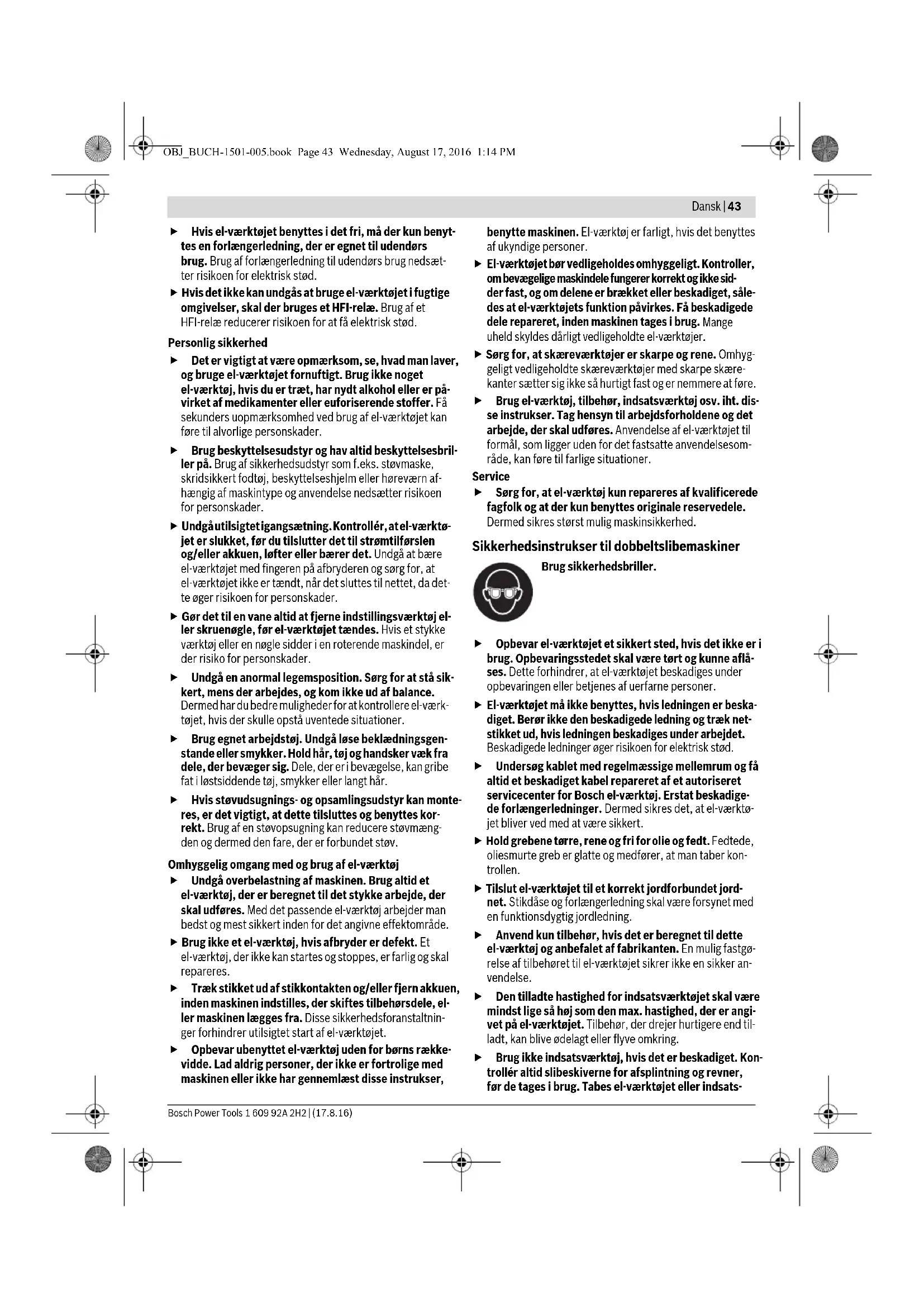 Maskinen må ikke udsættes for regn eller fugt. Indtræng- ning af vand i et el-værktøj øger risikoen for elektrisk stød. Brug ikke ledningen til formål, den ikke er beregnet til (f.eks. må man aldrig bære el-værktøjet i ledningen, hænge el-værktøjet op i ledningen eller rykke i lednin- gen for at trække stikket ud af kontakten). Beskyt led- ningen mod varme, olie, skarpe kanter eller maskinde- le, der er i bevægelse. Beskadigede eller indviklede ledninger øger risikoen for elektrisk stød. PAS PÅ OBJ_BUCH-1501-005.book Page 42 Wednesday, August 17, 2016 1:14 PMDansk | 43 Bosch Power Tools 1 609 92A 2H2 | (17.8.16) Hvis el-værktøjet benyttes i det fri, må der kun benyt- tes en forlængerledning, der er egnet til udendørs brug. Brug af forlængerledning til udendørs brug nedsæt- ter risikoen for elektrisk stød. Hvis det ikke kan undgås at bruge el-værktøjet i fugtige omgivelser, skal der bruges et HFI-relæ. Brug af et HFI-relæ reducerer risikoen for at få elektrisk stød. Personlig sikkerhed Det er vigtigt at være opmærksom, se, hvad man laver, og bruge el-værktøjet fornuftigt. Brug ikke noget el-værktøj, hvis du er træt, har nydt alkohol eller er på- virket af medikamenter eller euforiserende stoffer. Få sekunders uopmærksomhed ved brug af el-værktøjet kan føre til alvorlige personskader. Brug beskyttelsesudstyr og hav altid beskyttelsesbril- ler på. Brug af sikkerhedsudstyr som f.eks. støvmaske, skridsikkert fodtøj, beskyttelseshjelm eller høreværn af- hængig af maskintype og anvendelse nedsætter risikoen for personskader. Undgå utilsigtet igangsætning. Kontrollér, at el-værktø- jet er slukket, før du tilslutter det til strømtilførslen og/eller akkuen, løfter eller bærer det. Undgå at bære el-værktøjet med fingeren på afbryderen og sørg for, at el-værktøjet ikke er tændt, når det sluttes til nettet, da det- te øger risikoen for personskader. Gør det til en vane altid at fjerne indstillingsværktøj el- ler skruenøgle, før el-værktøjet tændes. Hvis et stykke værktøj eller en nøgle sidder i en roterende maskindel, er der risiko for personskader. Undgå en anormal legemsposition. Sørg for at stå sik- kert, mens der arbejdes, og kom ikke ud af balance. Dermed har du bedre muligheder for at kontrollere el-værk- tøjet, hvis der skulle opstå uventede situationer. Brug egnet arbejdstøj. Undgå løse beklædningsgen- stande eller smykker. Hold hår, tøj og handsker væk fra dele, der bevæger sig. Dele, der er i bevægelse, kan gribe fat i løstsiddende tøj, smykker eller langt hår. Hvis støvudsugnings- og opsamlingsudstyr kan monte- res, er det vigtigt, at dette tilsluttes og benyttes kor- rekt. Brug af en støvopsugning kan reducere støvmæng- den og dermed den fare, der er forbundet støv. Omhyggelig omgang med og brug af el-værktøj Undgå overbelastning af maskinen. Brug altid et el-værktøj, der er beregnet til det stykke arbejde, der skal udføres. Med det passende el-værktøj arbejder man bedst og mest sikkert inden for det angivne effektområde. Brug ikke et el-værktøj, hvis afbryder er defekt. Et el-værktøj, der ikke kan startes og stoppes, er farlig og skal repareres. Træk stikket ud af stikkontakten og/eller fjern akkuen, inden maskinen indstilles, der skiftes tilbehørsdele, el- ler maskinen lægges fra. Disse sikkerhedsforanstaltnin- ger forhindrer utilsigtet start af el-værktøjet. Opbevar ubenyttet el-værktøj uden for børns række- vidde. Lad aldrig personer, der ikke er fortrolige med maskinen eller ikke har gennemlæst disse instrukser, benytte maskinen. El-værktøj er farligt, hvis det benyttes af ukyndige personer.