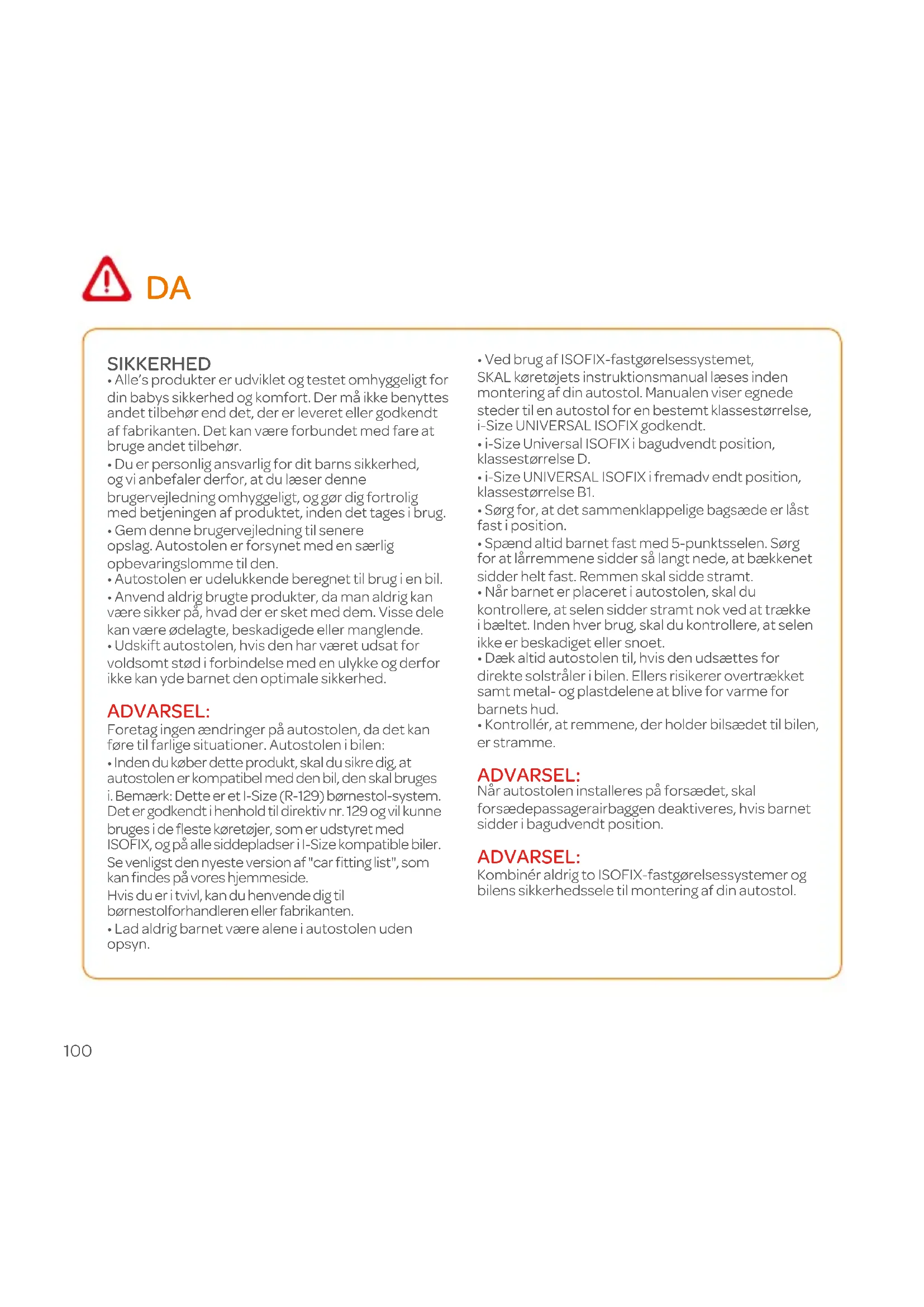 - Ved brug af ISOFIX-fastgørelsessystemet, SKAL køretøjets instruktionsmanual læses inden montering af din autostol. Manualen viser egnede steder til en autostol for en bestemt klassestørrelse, i-Size UNIVERSAL ISOFIX godkendt.