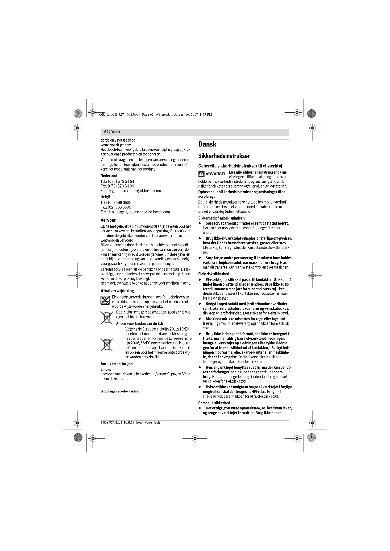 Det svingningsniveau, der er angivet i nærværende instruktio- ner, er blevet målt iht. en standardiseret måleproces i EN 60745, og kan bruges til at sammenligne el-værktøjer. Det er også egnet til en foreløbig vurdering af svingningsbelast- ningen. Det angivede svingningsniveau repræsenterer de væsentlige anvendelser af el-værktøjet. Hvis el-værktøjet dog anvendes til andre formål, med forskellige tilbehørsdele, med afvigende indsatsværktøj eller utilstrækkelig vedligeholdelse, kan sving- ningsniveauet afvige. Dette kan føre til en betydelig forøgelse af svingningsbelastningen i hele arbejdstidsrummet. Til en nøjagtig vurdering af svingningsbelastningen bør der også tages højde for de tider, i hvilke værktøjet er slukket eller godt nok kører, men rent faktisk ikke anvendes. Dette kan fø- re til en betydelig reduktion af svingningsbelastningen i hele arbejdstidsrummet. Fastlæg ekstra sikkerhedsforanstaltninger til beskyttelse af brugeren mod svingningers virkning som f.eks.: Vedligehol- delse af el-værktøj og indsatsværktøj, holde hænder varme, organisation af arbejdsforløb. Montering Opladning af akku Brug kun de ladeaggregater, der findes på tilbehørssi- den. Kun disse ladeaggregater er afstemt i forhold til den Li-ion-akku, der bruges på dit el-værktøj. Bemærk: Akkuen er til dels oplades ved udleveringen. For at sikre at akkuen fungerer 100 % oplades akkuen helt før første ibrugtagning. Li-ion-akkuen kan oplades til enhver tid, uden at levetiden for- kortes. En afbrydelse af opladningen beskadiger ikke akkuen. Li-ion-akkuen er beskyttet mod afladning med „Electronic Cell Protection (ECP)“. Er akkuen afladet, slukkes el-værktøjet med en beskyttelseskontakt: Indsatsværktøjet bevæger sig ikke mere. Tryk ikke videre på start-stop-kontakten efter automa- tisk slukning af el-værktøjet. Akkuen kan blive beskadi- get. Læs og overhold henvisningerne mhr. bortskaffelse. Akku tages ud Akkuen 6 har to låsetrin, der forhindrer, at akkuen falder ud, hvis man skulle komme til at trykke på akku-udløserknappen 5 ved et tilfælde. Så længe akkuen sidder i el-værktøjet, hol- des den i position af en fjeder. Til udtagning af akkuen 6: – Tryk akkuen mod el-værktøjets fod (1.) samtidigt med at der trykkes på udløserknappen 5 (2.). – Træk akkuen ud af el-værktøjet, til en rød strimmel kom- mer til syne (3.). – Tryk en gang til på udløserknappen 5 og træk akkuen helt ud. Akku-ladetilstandsindikator (se Fig. B) De tre grønne LED-lamper på akku-ladetilstandsindikatoren 27 viser akkuens ladetilstand 6. Af sikkerhedstekniske grun- de kan ladetilstanden kun kontrolleres, når el-værktøjet står stille. Tryk på tasten 26 for at få vist ladetilstanden (også muligt, hvis akkuen er taget af). Ladetilstandsindikatoren slukker automatisk efter ca. 5 sekunder. Lyser der ikke nogen LED, når der trykkes på tasten 26, er ak- kuen defekt og skal skiftes. Under opladningen lyser og slukker akkuens tre grønne LED- lamper kort en ad gangen. Akkuen er helt opladet, når de tre grønne LED-lamper lyser hele tiden. Ca. 5 minutter efter at akkuen er helt opladet, slukker de tre grønne LED-lamper igen. Isætning/udskiftning af rundsavklinge Tag akkuen ud af el-værktøjet, før der udføres arbejde på det. Brug beskyttelseshandsker, når savklingen monteres. Berøring med savklingen er forbundet med kvæstelsesfa- re. Benyt kun savklinger, der lever op til de tekniske data i denne betjeningsvejledning. Anvend under ingen omstændigheder slibeskiver som indsatsværktøj. Savklinge vælges En oversigt over anbefalede savklinger findes bag i denne vej- ledning. Savklinge demonteres (se Fig. A) El-værktøjet skal helst lægges fra på motorhusets frontside, når værktøj skal skiftes. – Tryk tasten til spindellåsen 17 og hold den trykket ned. LED Kapacitet Konstant lys 3 x grøn ≥ 2/3 Konstant lys 2 x grøn ≥ 1/3 Konstant lys 1 x grøn <1/3 Blinklys 1 x grøn Reserve OBJ_BUCH-3274-001.book Page 66 Wednesday, August 16, 2017 1:53 PMDansk | 67 Bosch Power Tools 1 609 92A 3ZU | (16.8.17) Betjen kun spindellåsetasten 17, når savspindlen står stille. Ellers kan el-værktøjet blive beskadiget. – Drej spændeskruen 24 ud i drejeretningen med unbra- konøglen 19. – Sving pendulbeskyttelsesskærmen 10 tilbage og hold fast i den. –Fjern spændeflangen 23 og savklingen 22 fra savspindlen