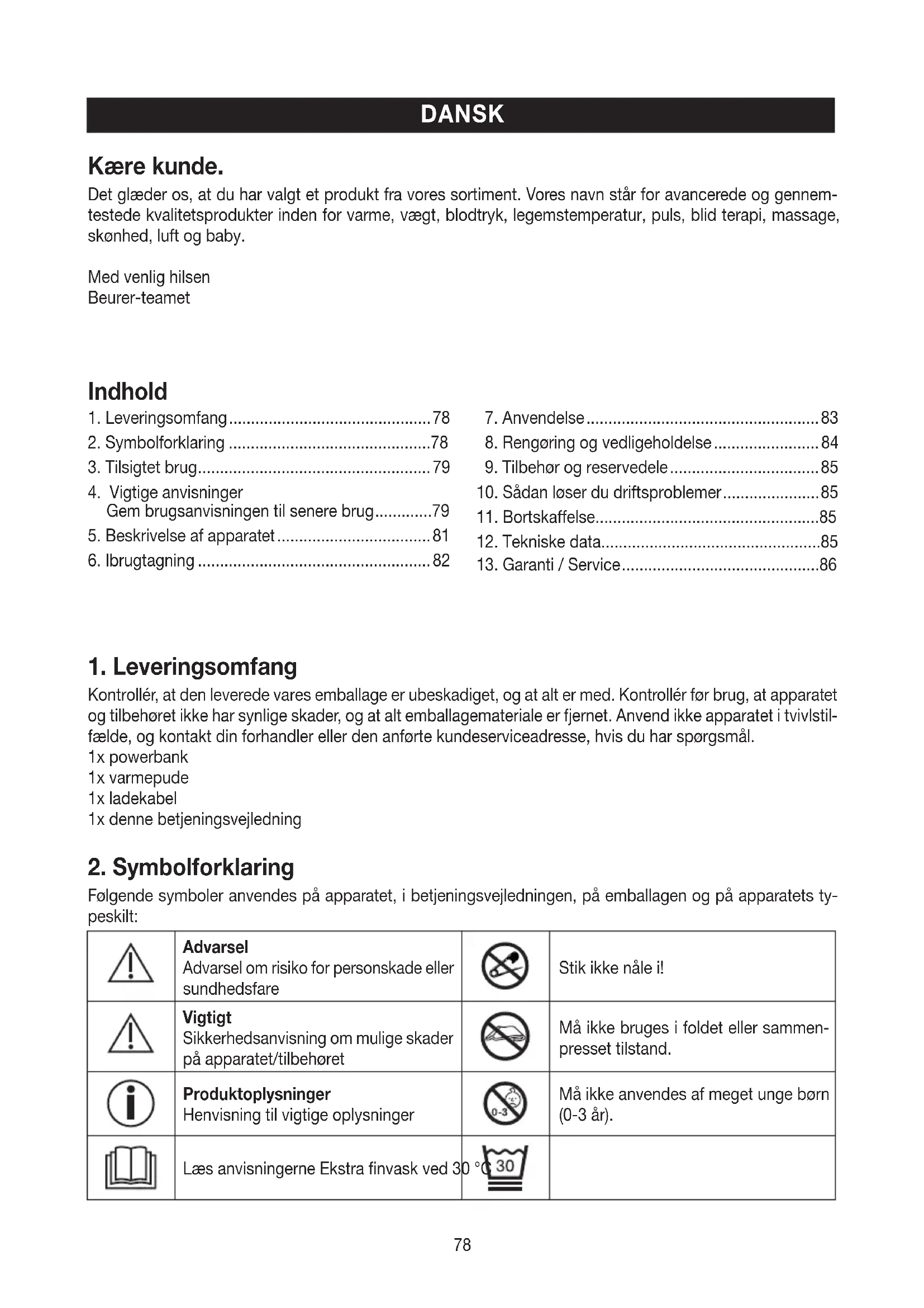 Følgende symboler anvendes på apparatet, i betjeningsvejledningen, på emballagen og på apparatets ty- peskilt: Advarsel Advarsel om risiko for personskade eller sundhedsfare Stik ikke nåle i! Vigtigt Sikkerhedsanvisning om mulige skader på apparatet/tilbehøret Må ikke bruges i foldet eller sammen- presset tilstand. Produktoplysninger Henvisning til vigtige oplysninger Må ikke anvendes af meget unge børn (0-3 år). Læs anvisningerne Ekstra finvask ved 30 °C Indhold Kære kunde. Det glæder os, at du har valgt et produkt fra vores sortiment. Vores navn står for avancerede og gennem- testede kvalitetsprodukter inden for varme, vægt, blodtryk, legemstemperatur, puls, blid terapi, massage, skønhed, luft og baby. Med venlig hilsen Beurer-teamet79 Bortskaffelse i henhold til EU-direktivet om affald fra elektrisk og elektronisk ud- styr WEEE (Waste Electrical and Elect- ronic Equipment) Må ikke bleges
