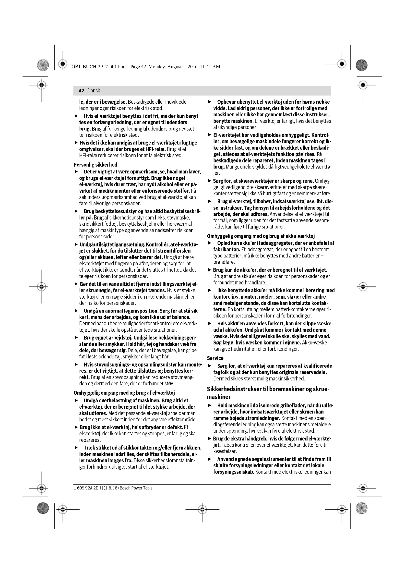 El-værktøjet bør vedligeholdes omhyggeligt. Kontrol- ler, om bevægelige maskindele fungerer korrekt og ik- ke sidder fast, og om delene er brækket eller beskadi- get, således at el-værktøjets funktion påvirkes. Få beskadigede dele repareret, inden maskinen tages i brug. Mange uheld skyldes dårligt vedligeholdte el-værktø- jer. Sørg for, at skæreværktøjer er skarpe og rene. Omhyg- geligt vedligeholdte skæreværktøjer med skarpe skære- kanter sætter sig ikke så hurtigt fast og er nemmere at føre. Brug el-værktøj, tilbehør, indsatsværktøj osv. iht. dis- se instrukser. Tag hensyn til arbejdsforholdene og det arbejde, der skal udføres. Anvendelse af el-værktøjet til formål, som ligger uden for det fastsatte anvendelsesom- råde, kan føre til farlige situationer. Omhyggelig omgang med og brug af akku-værktøj Oplad kun akku’er i ladeaggregater, der er anbefalet af fabrikanten. Et ladeaggregat, der er egnet til en bestemt type batterier, må ikke benyttes med andre batterier – brandfare. Brug kun de akku’er, der er beregnet til el-værktøjet. Brug af andre akku’er øger risikoen for personskader og er forbundet med brandfare. Ikke benyttede akku’er må ikke komme i berøring med kontorclips, mønter, nøgler, søm, skruer eller andre små metalgenstande, da disse kan kortslutte kontak- terne. En kortslutning mellem batteri-kontakterne øger ri- sikoen for personskader i form af forbrændinger. Hvis akku’en anvendes forkert, kan der slippe væske ud af akku’en. Undgå at komme i kontakt med denne væske. Hvis det alligevel skulle ske, skylles med vand. Søg læge, hvis væsken kommer i øjnene. Akku-væske kan give hudirritation eller forbrændinger. Service Sørg for, at el-værktøj kun repareres af kvalificerede fagfolk og at der kun benyttes originale reservedele. Dermed sikres størst mulig maskinsikkerhed. Sikkerhedsinstrukser til boremaskiner og skrue- maskiner Hold maskinen i de isolerede gribeflader, når du udfø- rer arbejde, hvor indsatsværktøjet eller skruen kan ramme bøjede strømledninger. Kontakt med en spæn- dingsførende ledning kan også sætte maskinens metaldele under spænding, hvilket kan føre til elektrisk stød. Brug de ekstra håndgreb, hvis de følger med el-værktø- jet. Tabes kontrollen over el-værktøjet, kan dette føre til kvæstelser. Anvend egnede søgeinstrumenter til at finde frem til skjulte forsyningsledninger eller kontakt det lokale forsyningsselskab. Kontakt med elektriske ledninger kan OBJ_BUCH-2917-001.book Page 42 Monday, August 1, 2016 11:41 AMDansk | 43 Bosch Power Tools 1 609 92A 2DH | (1.8.16) føre til brand og elektrisk stød. Beskadigelse af en gasled- ning kan føre til eksplosion. Beskadigelse af en vandled- ning kan føre til materiel skade. Sluk for el-værktøjet med det samme, hvis indsats- værktøjet blokerer. Vær klar, hvis maskinen arbejder med høje reaktionsmomenter, da dette kan føre til til- bageslag. Indsatsværktøjet blokerer, hvis: – el-værktøjet overbelastes eller – det sætter sig fast i det emne, der er ved at blive bear- bejdet. Hold el-værktøjet godt fast. Når skruer spændes og løs- nes, kan der opstå korte, høje reaktionsmomenter. Sikr emnet. Et emne holdes bedre fast med spændean- ordninger eller skruestik end med hånden. El-værktøjet må først lægges fra, når det står helt stil- le. Indsatsværktøjet kan sætte sig i klemme, hvilket kan medføre, at man taber kontrollen over el-værktøjet. Åben ikke akkuen. Fare for kortslutning. Beskyt akkuen mod varme (f.eks. også mod va- rige solstråler, brand, vand og fugtighed). Fare for eksplosion. Beskadiges akkuen eller bruges den forkert, kan der si- ve dampe ud. Tilfør frisk luft og søg læge, hvis du føler dig utilpas. Dampene kan irritere luftvejene. Anvend kun akkuen i forbindelse med dit Bosch el- værktøj. Kun på denne måde beskyttes akkuen mod farlig overbelastning. Akkuen kan blive beskadiget af spidse genstande som f.eks. søm eller skruetrækkere eller ydre kraftpåvirk- ning. Der kan opstå indvendig kortslutning, så akkuen kan antændes, ryge, eksplodere eller overophedes. Beskrivelse af produkt og ydelse Læs alle sikkerhedsinstrukser og anvisnin- ger. I tilfælde af manglende overholdelse af sikkerhedsinstrukserne og anvisningerne er der risiko for elektrisk stød, brand og/eller al- vorlige kvæstelser. Klap venligst foldesiden med illustration af produktet ud og lad denne side være foldet ud, mens du læser betjeningsvej- ledningen. Beregnet anvendelse El-værktøjet er beregnet til i- og udskruning af skruer samt til boring i træ, metal, keramik og kunststof, specielt på vanse- ligt tilgængelige steder. Illustrerede komponenter Nummereringen af de illustrerede komponenter refererer til illustrationen af el-værktøjet på illustrationssiden. 1 Låsekappe 2 Værktøjsholder 3 Skruebit* 4 Retningsomskifter 5 Start-stop-kontakt 6 Skubber til indstilling af drejningsmoment 7 Sikkerhedstaste til knækbart værktøjshoved 8 Ophængningsbøjle 9 Akku-udløserknap 10 Akku 11 Håndgreb (isoleret gribeflade) 12 Bor med sekskantet skaft* *Tilbehør, som er illustreret og beskrevet i brugsanvisningen, er ikke indeholdt i leveringen. Det fuldstændige tilbehør findes i vo- res tilbehørsprogram. Tekniske data Støj-/vibrationsinformation Støjemissionsværdier bestemt iht. EN 60745-2-1. Værktøjets A-vurderede lydtrykniveau er typisk mindre end 70 dB(A). Usikkerhed K =3 dB. Støjniveauet kan overstige 80 dB(A) under arbejdet. Brug høreværn! Samlede vibrationsværdier a