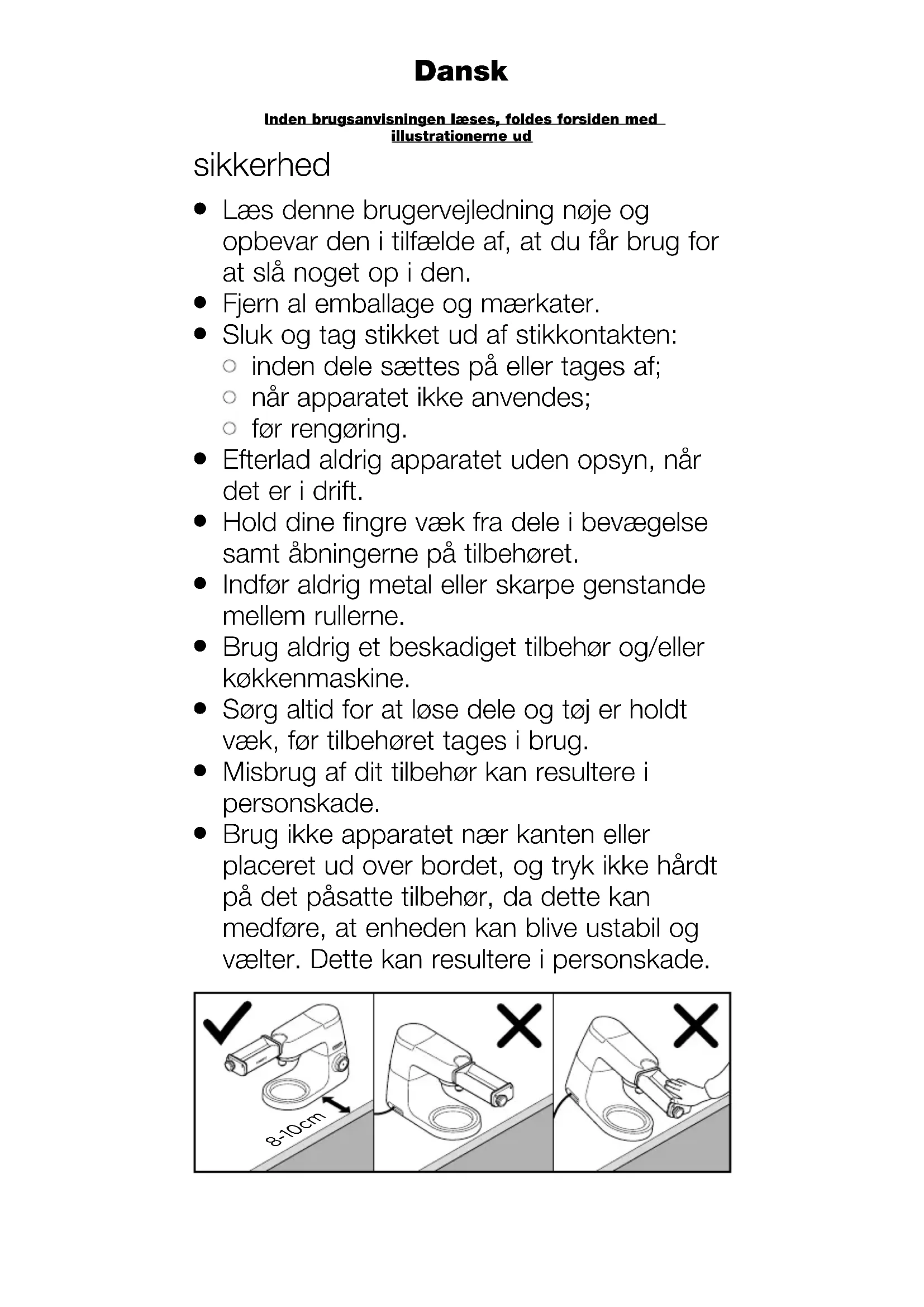 Brug ikke apparatet nær kanten eller placeret ud over bordet, og tryk ikke hårdt på det påsatte tilbehør, da dette kan medføre, at enheden kan blive ustabil og vælter. Dette kan resultere i personskade. 8-10cm Inden brugsanvisningen læses, foldes forsiden med illustrationerne ud Dansk31 32 Dette tilbehør har vridetilslutningssystem