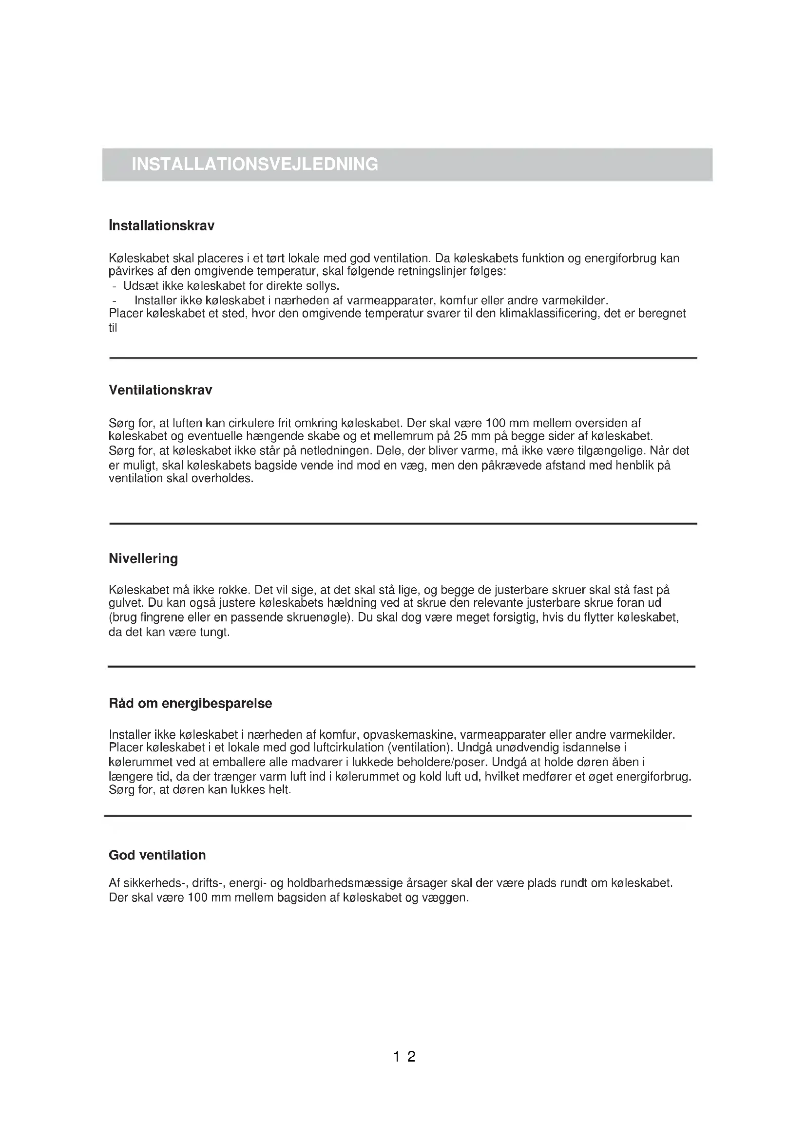 Installer ikke køleskabet i nærheden af komfur, opvaskemaskine, varmeapparater eller andre varmekilder. Placer køleskabet i et lokale med god luftcirkulation (ventilation). Undgå unødvendig isdannelse i kølerummet ved at emballere alle madvarer i lukkede beholdere/poser. Undgå at holde døren åben i længere tid, da der trænger varm luft ind i kølerummet og kold luft ud, hvilket medfører et øget energiforbrug. Sørg for, at døren kan lukkes helt.