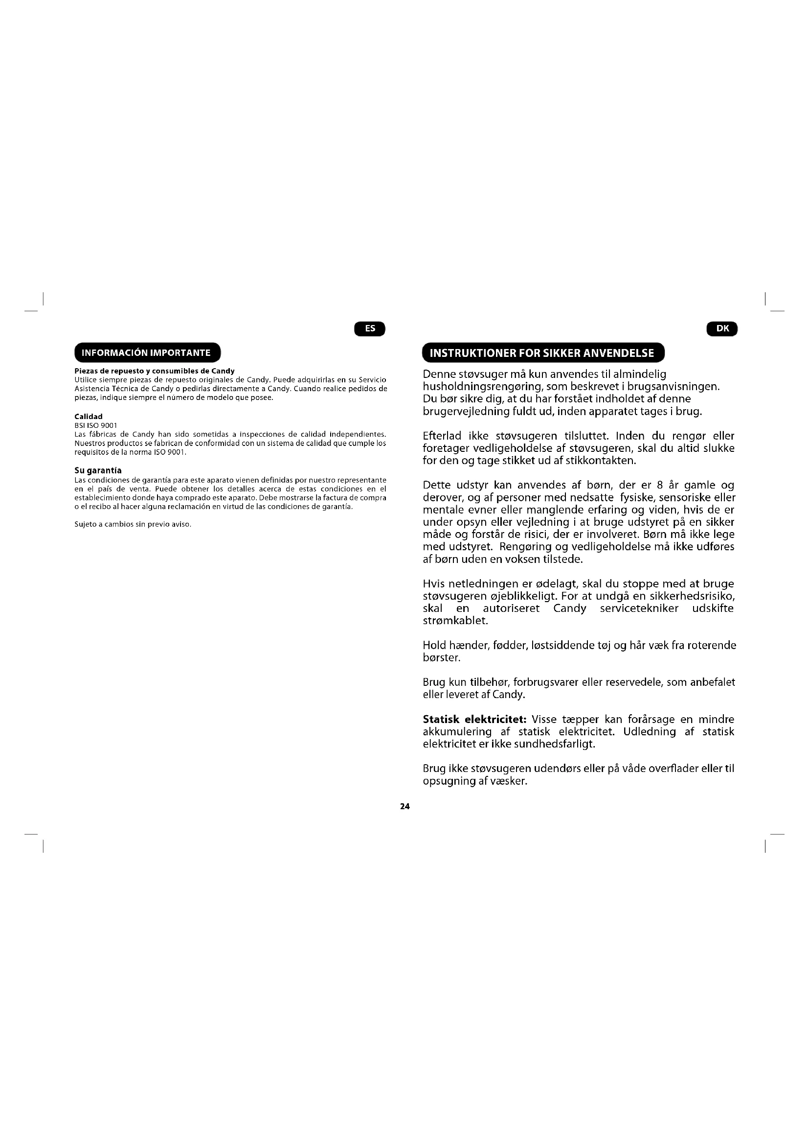 Denne støvsuger må kun anvendes til almindelig husholdningsrengøring, som beskrevet i brugsanvisningen. Du bør sikre dig, at du har forstået indholdet af denne brugervejledning fuldt ud, inden apparatet tages i brug. Efterlad ikke støvsugeren tilsluttet. Inden du rengør eller foretager vedligeholdelse af støvsugeren, skal du altid slukke for den og tage stikket ud af stikkontakten. Dette udstyr kan anvendes af børn, der er 8 år gamle og derover, og af personer med nedsatte fysiske, sensoriske eller mentale evner eller manglende erfaring og viden, hvis de er under opsyn eller vejledning i at bruge udstyret på en sikker måde og forstår de risici, der er involveret. Børn må ikke lege med udstyret. Rengøring og vedligeholdelse må ikke udføres af børn uden en voksen tilstede. Hvis netledningen er ødelagt, skal du stoppe med at bruge støvsugeren øjeblikkeligt. For at undgå en sikkerhedsrisiko, skal en autoriseret Candy servicetekniker udskifte strømkablet. Hold hænder, fødder, løstsiddende tøj og hår væk fra roterende børster. Brug kun tilbehør, forbrugsvarer eller reservedele, som anbefalet eller leveret af Candy. Statisk elektricitet: Visse tæpper kan forårsage en mindre akkumulering af statisk elektricitet. Udledning af statisk elektricitet er ikke sundhedsfarligt. Brug ikke støvsugeren udendørs eller på våde overader eller til opsugning af væsker.25
