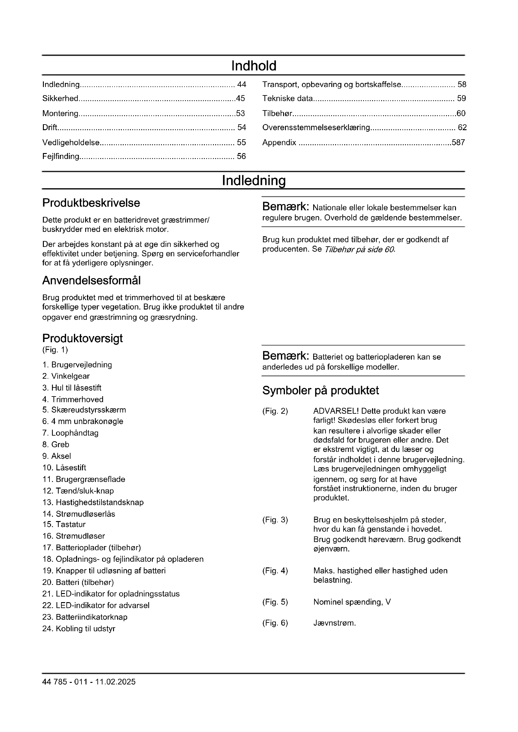Bemærk: Batteriet og batteriopladeren kan se anderledes ud på forskellige modeller. Symboler på produktet (Fig. 2) ADVARSEL! Dette produkt kan være farligt! Skødesløs eller forkert brug kan resultere i alvorlige skader eller dødsfald for brugeren eller andre. Det er ekstremt vigtigt, at du læser og forstår indholdet i denne brugervejledning. Læs brugervejledningen omhyggeligt igennem, og sørg for at have forstået instruktionerne, inden du bruger produktet. (Fig. 3) Brug en beskyttelseshjelm på steder, hvor du kan få genstande i hovedet. Brug godkendt høreværn. Brug godkendt øjenværn. (Fig. 4) Maks. hastighed eller hastighed uden belastning. (Fig. 5) Nominel spænding, V (Fig. 6) Jævnstrøm. 44 785 - 011 - 11.02.2025(Fig. 7) Produktet kan forårsage, at genstande slynges ud, hvilket kan forårsage personskade. (Fig. 8) Kun beregnet til ikke-metallisk, fleksibelt skæreudstyr, dvs. trimmerhoved med trimmerline. (Fig. 9) Produktet er i overensstemmelse med gældende EF-direktiver. (Fig. 10) Brug godkendte beskyttelseshandsker. (Fig. 11) Brug altid kraftige, skridsikre støvler. (Fig. 12) Frakobl batteriet før vedligeholdelse. (Fig. 13) Symbolerne på produktet og emballagen betyder, at produktet ikke må behandles som almindeligt husholdningsaffald. Dette produkt skal bortskaffes på et godkendt opsamlingssted. (Fig. 14) Produktet er beskyttet mod vandstænk. (Fig. 15) Hold alle dele af kroppen på sikker afstand af varme overflader. (Fig. 16) Emission af støj i overensstemmelse med miljømærket i henhold til EU (herunder New South Wales-lovgivning) samt britiske direktiver og forordninger. Produktets garanterede lydeffektniveau er angivet i Tekniske data på side 59 og på mærkaten. yyyywwxxxx Typeskiltet viser serienummeret. yyyy er produktionsåret, ww er produktions- ugen, og xxxx er det fortløbende num- mer. (Fig. 17) Hold en afstand på mindst 15 m til personer og dyr under brug af produktet. Bemærk: Andre symboler/mærkater på produktet henviser til certificeringskrav i andre handelsområder. Producent Husqvarna AB Drottninggatan 2, SE-561 82 Huskvarna, Sweden, tel: +46-36-146500 Skader på produktet Vi er ikke ansvarlige for skader på vores produkt, hvis: