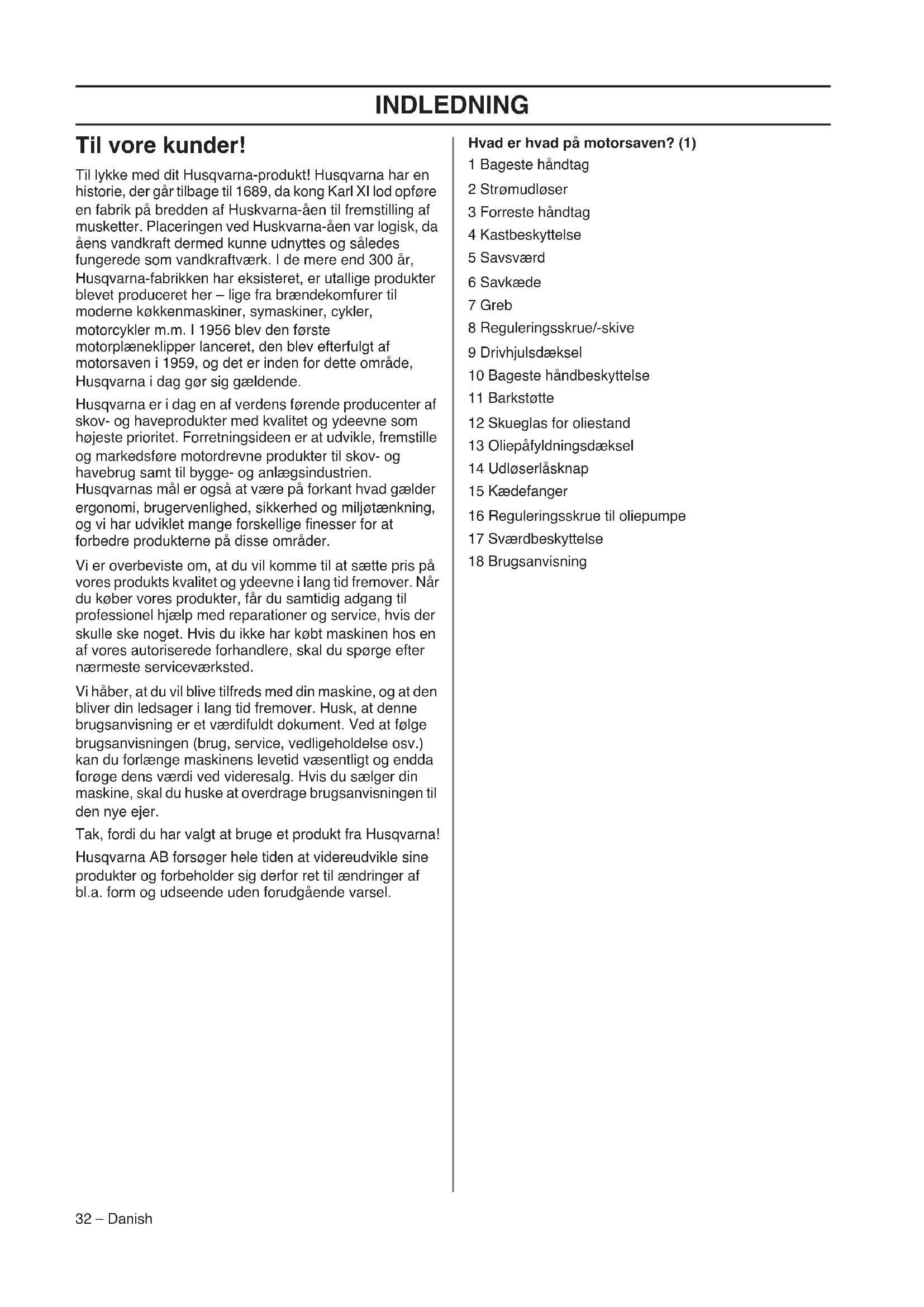 - EF-overensstemmelseserklæring INDLEDNING 32 – Danish Til vore kunder! Til lykke med dit Husqvarna-produkt! Husqvarna har en historie, der går tilbage til 1689, da kong Karl XI lod opføre en fabrik på bredden af Huskvarna-åen til fremstilling af musketter. Placeringen ved Huskvarna-åen var logisk, da åens vandkraft dermed kunne udnyttes og således fungerede som vandkraftværk. I de mere end 300 år, Husqvarna-fabrikken har eksisteret, er utallige produkter blevet produceret her – lige fra brændekomfurer til moderne køkkenmaskiner, symaskiner, cykler, motorcykler m.m. I 1956 blev den første motorplæneklipper lanceret, den blev efterfulgt af motorsaven i 1959, og det er inden for dette område, Husqvarna i dag gør sig gældende. Husqvarna er i dag en af verdens førende producenter af skov- og haveprodukter med kvalitet og ydeevne som højeste prioritet. Forretningsideen er at udvikle, fremstille og markedsføre motordrevne produkter til skov- og havebrug samt til bygge- og anlægsindustrien. Husqvarnas mål er også at være på forkant hvad gælder ergonomi, brugervenlighed, sikkerhed og miljøtænkning, og vi har udviklet mange forskellige finesser for at forbedre produkterne på disse områder. Vi er overbeviste om, at du vil komme til at sætte pris på vores produkts kvalitet og ydeevne i lang tid fremover. Når du køber vores produkter, får du samtidig adgang til professionel hjælp med reparationer og service, hvis der skulle ske noget. Hvis du ikke har købt maskinen hos en af vores autoriserede forhandlere, skal du spørge efter nærmeste serviceværksted. Vi håber, at du vil blive tilfreds med din maskine, og at den bliver din ledsager i lang tid fremover. Husk, at denne brugsanvisning er et værdifuldt dokument. Ved at følge brugsanvisningen (brug, service, vedligeholdelse osv.) kan du forlænge maskinens levetid væsentligt og endda forøge dens værdi ved videresalg. Hvis du sælger din maskine, skal du huske at overdrage brugsanvisningen til den nye ejer. Tak, fordi du har valgt at bruge et produkt fra Husqvarna! Husqvarna AB forsøger hele tiden at videreudvikle sine produkter og forbeholder sig derfor ret til ændringer af bl.a. form og udseende uden forudgående varsel. Hvad er hvad på motorsaven? (1) 1 Bageste håndtag 2 Strømudløser 3 Forreste håndtag 4 Kastbeskyttelse 5 Savsværd 6 Savkæde 7 Greb 8 Reguleringsskrue/-skive 9 Drivhjulsdæksel 10 Bageste håndbeskyttelse 11 Barkstøtte 12 Skueglas for oliestand 13 Oliepåfyldningsdæksel 14 Udløserlåsknap 15 Kædefanger 16 Reguleringsskrue til oliepumpe 17 Sværdbeskyttelse 18 BrugsanvisningGENERELLE SIKKERHEDSINSTRUKTIONER Danish – 33 Generelle sikkerhedsadvarsler om elektrisk værktøj Sikkerhed i arbejdsområdet p. 52