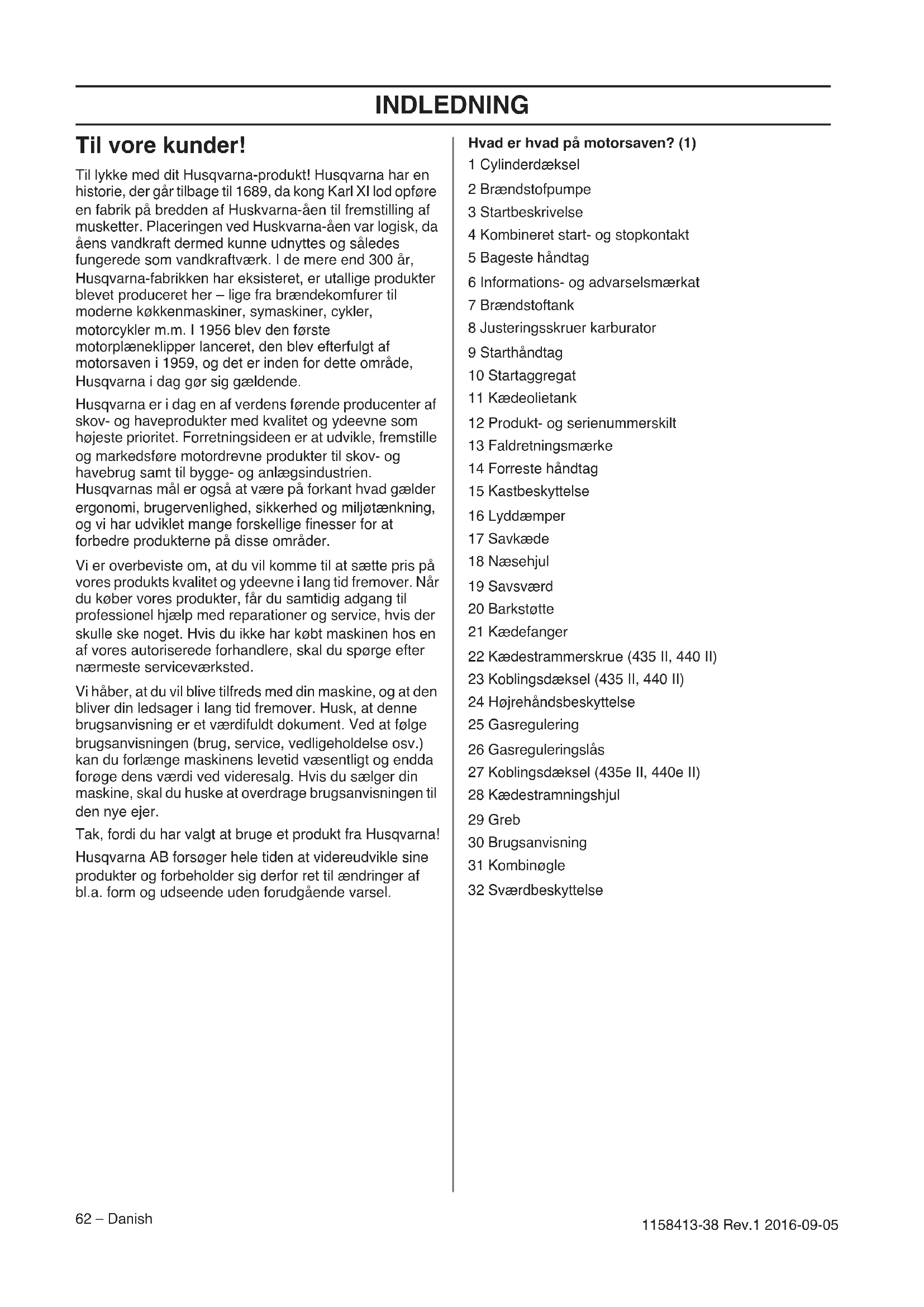 - EF-overensstemmelseserklæring INDLEDNING 62 – Danish 1158413-38 Rev.1 2016-09-05 Til vore kunder! Til lykke med dit Husqvarna-produkt! Husqvarna har en historie, der går tilbage til 1689, da kong Karl XI lod opføre en fabrik på bredden af Huskvarna-åen til fremstilling af musketter. Placeringen ved Huskvarna-åen var logisk, da åens vandkraft dermed kunne udnyttes og således fungerede som vandkraftværk. I de mere end 300 år, Husqvarna-fabrikken har eksisteret, er utallige produkter blevet produceret her – lige fra brændekomfurer til moderne køkkenmaskiner, symaskiner, cykler, motorcykler m.m. I 1956 blev den første motorplæneklipper lanceret, den blev efterfulgt af motorsaven i 1959, og det er inden for dette område, Husqvarna i dag gør sig gældende. Husqvarna er i dag en af verdens førende producenter af skov- og haveprodukter med kvalitet og ydeevne som højeste prioritet. Forretningsideen er at udvikle, fremstille og markedsføre motordrevne produkter til skov- og havebrug samt til bygge- og anlægsindustrien. Husqvarnas mål er også at være på forkant hvad gælder ergonomi, brugervenlighed, sikkerhed og miljøtænkning, og vi har udviklet mange forskellige finesser for at forbedre produkterne på disse områder. Vi er overbeviste om, at du vil komme til at sætte pris på vores produkts kvalitet og ydeevne i lang tid fremover. Når du køber vores produkter, får du samtidig adgang til professionel hjælp med reparationer og service, hvis der skulle ske noget. Hvis du ikke har købt maskinen hos en af vores autoriserede forhandlere, skal du spørge efter nærmeste serviceværksted. Vi håber, at du vil blive tilfreds med din maskine, og at den bliver din ledsager i lang tid fremover. Husk, at denne brugsanvisning er et værdifuldt dokument. Ved at følge brugsanvisningen (brug, service, vedligeholdelse osv.) kan du forlænge maskinens levetid væsentligt og endda forøge dens værdi ved videresalg. Hvis du sælger din maskine, skal du huske at overdrage brugsanvisningen til den nye ejer. Tak, fordi du har valgt at bruge et produkt fra Husqvarna! Husqvarna AB forsøger hele tiden at videreudvikle sine produkter og forbeholder sig derfor ret til ændringer af bl.a. form og udseende uden forudgående varsel. Hvad er hvad på motorsaven? (1) 1 Cylinderdæksel 2 Brændstofpumpe 3 Startbeskrivelse 4 Kombineret start- og stopkontakt 5 Bageste håndtag 6 Informations- og advarselsmærkat 7 Brændstoftank 8 Justeringsskruer karburator 9 Starthåndtag 10 Startaggregat 11 Kædeolietank 12 Produkt- og serienummerskilt 13 Faldretningsmærke 14 Forreste håndtag 15 Kastbeskyttelse 16 Lyddæmper 17 Savkæde 18 Næsehjul 19 Savsværd 20 Barkstøtte 21 Kædefanger 22 Kædestrammerskrue (435 II, 440 II) 23 Koblingsdæksel (435 II, 440 II) 24 Højrehåndsbeskyttelse 25 Gasregulering 26 Gasreguleringslås 27 Koblingsdæksel (435e II, 440e II) 28 Kædestramningshjul 29 Greb 30 Brugsanvisning 31 Kombinøgle 32 SværdbeskyttelseGENERELLE SIKKERHEDSINSTRUKTIONER Danish – 63 1158413-38 Rev.1 2016-09-05 Forberedelser, inden en ny motorsav tages i brug p. 87
