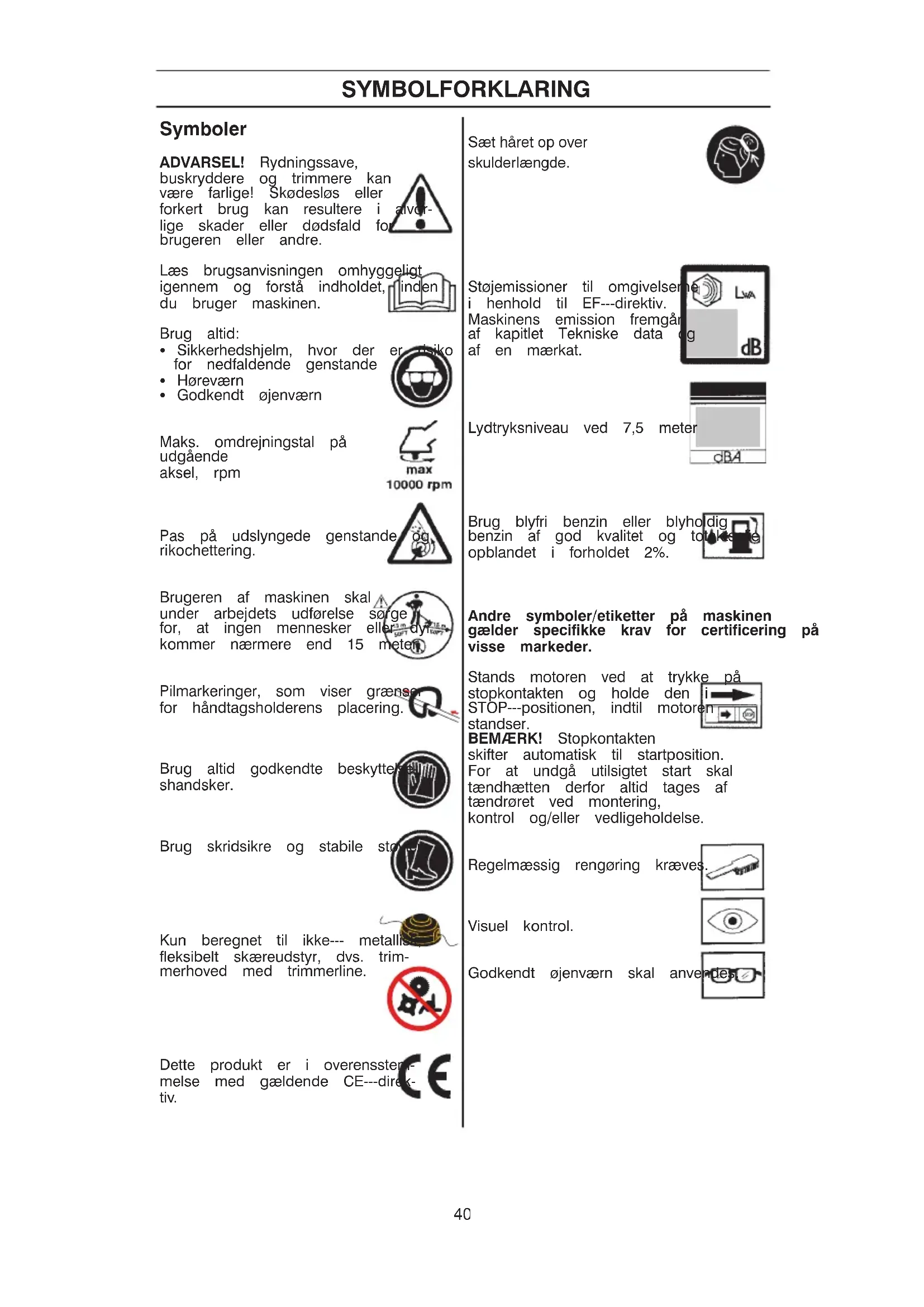 42GENERELLE SIKKERHEDSINSTRUKTIONER VIGTIGT! En rydningssav, buskrydder eller trimmer kan, hvis den bruges forkert eller skødesløst, være et farligt redskab, som kan forårsage alvorlige skader eller dødsfald for brugeren eller andre. Det er meget vigtigt, at du læser og forstår indholdet i denne brugsanvisning. Ved enhver anvendelse af maskinen skal der bruges godkendt personligt beskyttelse- sudstyr. Det personlige beskyttelsesudstyr udelukker ikke risikoen for skader, men det mindsker effekten af en skade ved en ulykke. Bed din forhandler om hjælp ved valg af udstyr.