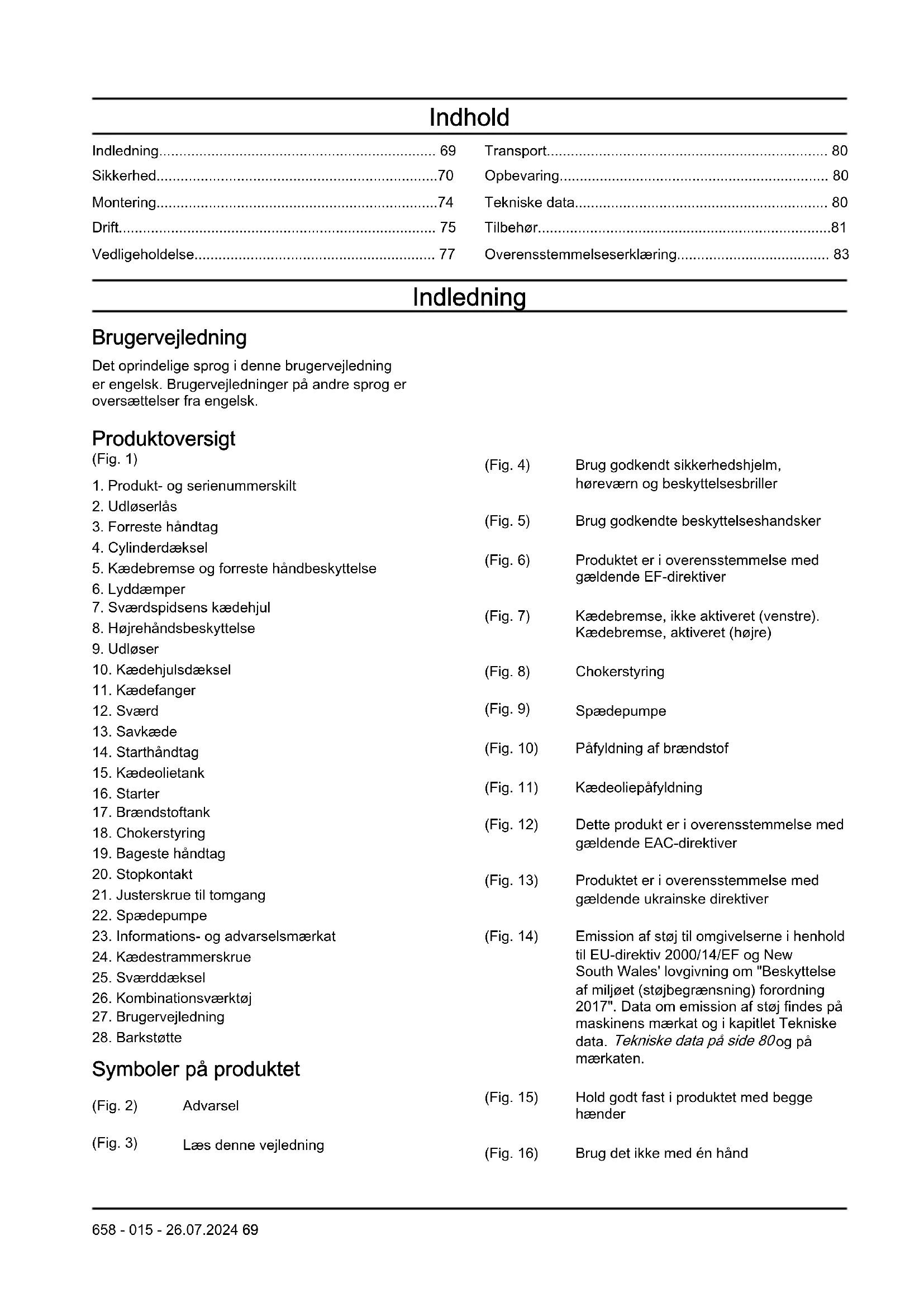 Symboler på produktet (Fig. 2) Advarsel (Fig. 3) Læs denne vejledning (Fig. 4) Brug godkendt sikkerhedshjelm, høreværn og beskyttelsesbriller (Fig. 5) Brug godkendte beskyttelseshandsker (Fig. 6) Produktet er i overensstemmelse med gældende EF-direktiver (Fig. 7) Kædebremse, ikke aktiveret (venstre). Kædebremse, aktiveret (højre) (Fig. 8) Chokerstyring (Fig. 9) Spædepumpe (Fig. 10) Påfyldning af brændstof (Fig. 11) Kædeoliepåfyldning (Fig. 12) Dette produkt er i overensstemmelse med gældende EAC-direktiver (Fig. 13) Produktet er i overensstemmelse med gældende ukrainske direktiver (Fig. 14) Emission af støj til omgivelserne i henhold til EU-direktiv 2000/14/EF og New South Wales' lovgivning om "Beskyttelse af miljøet (støjbegrænsning) forordning 2017". Data om emission af støj findes på maskinens mærkat og i kapitlet Tekniske data. Tekniske data på side 80 og på mærkaten. (Fig. 15) Hold godt fast i produktet med begge hænder (Fig. 16) Brug det ikke med én hånd
