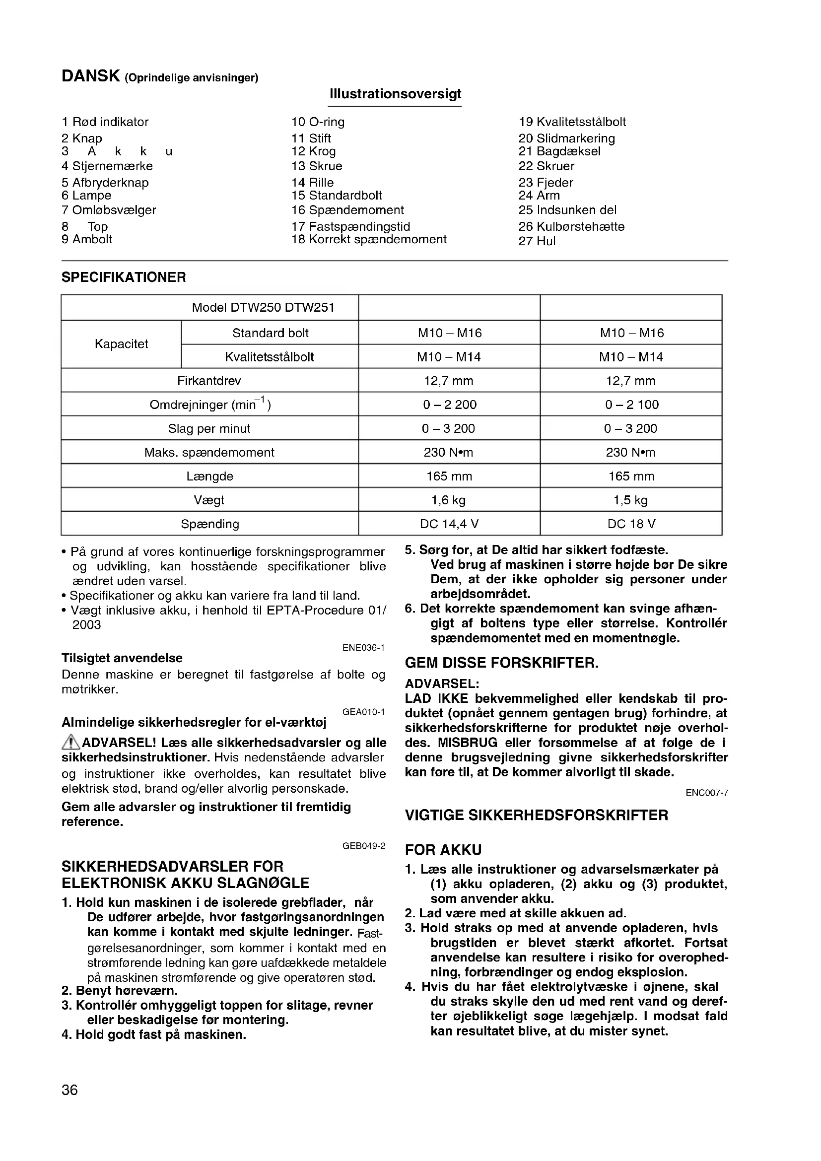 ENE036-1 Tilsigtet anvendelse Denne maskine er beregnet til fastgørelse af bolte og møtrikker. GEA010-1 Almindelige sikkerhedsregler for el-værktøj ADVARSEL! Læs alle sikkerhedsadvarsler og alle sikkerhedsinstruktioner. Hvis nedenstående advarsler og instruktioner ikke overholdes, kan resultatet blive elektrisk stød, brand og/eller alvorlig personskade. Gem alle advarsler og instruktioner til fremtidig reference. GEB049-2 SIKKERHEDSADVARSLER FOR