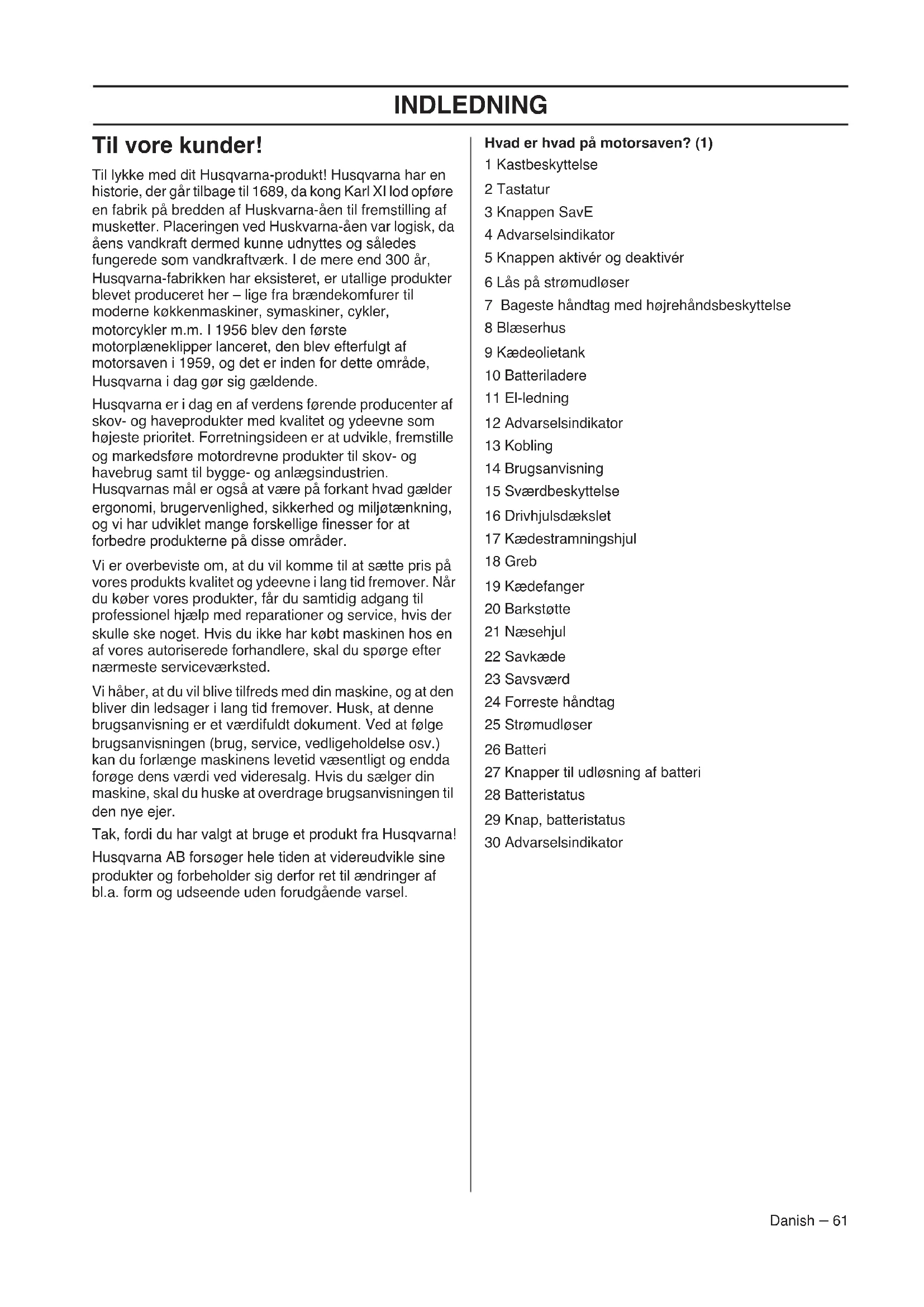 - EF-overensstemmelseserklæring INDLEDNING Danish – 61 Til vore kunder! Til lykke med dit Husqvarna-produkt! Husqvarna har en historie, der går tilbage til 1689, da kong Karl XI lod opføre en fabrik på bredden af Huskvarna-åen til fremstilling af musketter. Placeringen ved Huskvarna-åen var logisk, da åens vandkraft dermed kunne udnyttes og således fungerede som vandkraftværk. I de mere end 300 år, Husqvarna-fabrikken har eksisteret, er utallige produkter blevet produceret her – lige fra brændekomfurer til moderne køkkenmaskiner, symaskiner, cykler, motorcykler m.m. I 1956 blev den første motorplæneklipper lanceret, den blev efterfulgt af motorsaven i 1959, og det er inden for dette område, Husqvarna i dag gør sig gældende. Husqvarna er i dag en af verdens førende producenter af skov- og haveprodukter med kvalitet og ydeevne som højeste prioritet. Forretningsideen er at udvikle, fremstille og markedsføre motordrevne produkter til skov- og havebrug samt til bygge- og anlægsindustrien. Husqvarnas mål er også at være på forkant hvad gælder ergonomi, brugervenlighed, sikkerhed og miljøtænkning, og vi har udviklet mange forskellige finesser for at forbedre produkterne på disse områder. Vi er overbeviste om, at du vil komme til at sætte pris på vores produkts kvalitet og ydeevne i lang tid fremover. Når du køber vores produkter, får du samtidig adgang til professionel hjælp med reparationer og service, hvis der skulle ske noget. Hvis du ikke har købt maskinen hos en af vores autoriserede forhandlere, skal du spørge efter nærmeste serviceværksted. Vi håber, at du vil blive tilfreds med din maskine, og at den bliver din ledsager i lang tid fremover. Husk, at denne brugsanvisning er et værdifuldt dokument. Ved at følge brugsanvisningen (brug, service, vedligeholdelse osv.) kan du forlænge maskinens levetid væsentligt og endda forøge dens værdi ved videresalg. Hvis du sælger din maskine, skal du huske at overdrage brugsanvisningen til den nye ejer. Tak, fordi du har valgt at bruge et produkt fra Husqvarna! Husqvarna AB forsøger hele tiden at videreudvikle sine produkter og forbeholder sig derfor ret til ændringer af bl.a. form og udseende uden forudgående varsel. Hvad er hvad på motorsaven? (1) 1 Kastbeskyttelse 2 Tastatur 3 Knappen SavE 4 Advarselsindikator 5 Knappen aktivér og deaktivér 6 Lås på strømudløser 7 Bageste håndtag med højrehåndsbeskyttelse 8 Blæserhus 9 Kædeolietank 10 Batteriladere 11 El-ledning 12 Advarselsindikator 13 Kobling 14 Brugsanvisning 15 Sværdbeskyttelse 16 Drivhjulsdækslet 17 Kædestramningshjul 18 Greb 19 Kædefanger 20 Barkstøtte 21 Næsehjul 22 Savkæde 23 Savsværd 24 Forreste håndtag 25 Strømudløser 26 Batteri 27 Knapper til udløsning af batteri 28 Batteristatus 29 Knap, batteristatus 30 AdvarselsindikatorGENERELLE SIKKERHEDSINSTRUKTIONER 62 – Danish Generelle sikkerhedsadvarsler om elektrisk værktøj Sikkerhed i arbejdsområdet p. 84