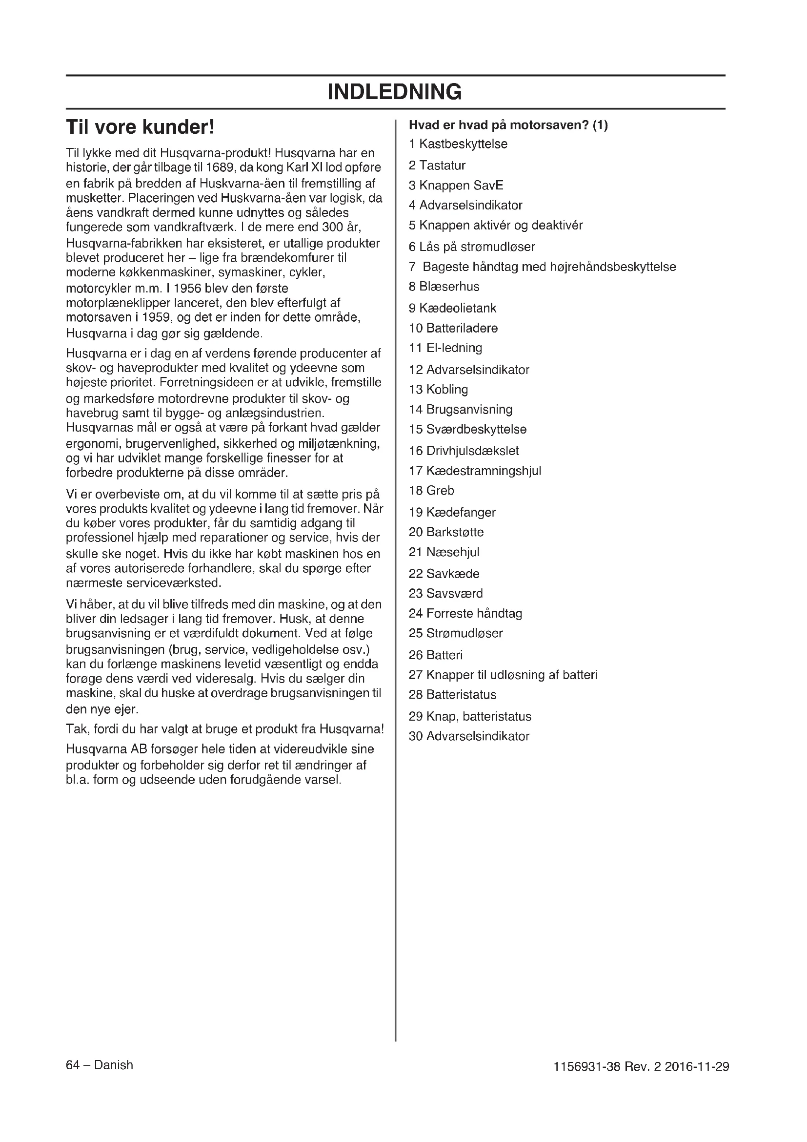 - EF-overensstemmelseserklæring INDLEDNING 64 – Danish 1156931-38 Rev. 2 2016-11-29 Til vore kunder! Til lykke med dit Husqvarna-produkt! Husqvarna har en historie, der går tilbage til 1689, da kong Karl XI lod opføre en fabrik på bredden af Huskvarna-åen til fremstilling af musketter. Placeringen ved Huskvarna-åen var logisk, da åens vandkraft dermed kunne udnyttes og således fungerede som vandkraftværk. I de mere end 300 år, Husqvarna-fabrikken har eksisteret, er utallige produkter blevet produceret her – lige fra brændekomfurer til moderne køkkenmaskiner, symaskiner, cykler, motorcykler m.m. I 1956 blev den første motorplæneklipper lanceret, den blev efterfulgt af motorsaven i 1959, og det er inden for dette område, Husqvarna i dag gør sig gældende. Husqvarna er i dag en af verdens førende producenter af skov- og haveprodukter med kvalitet og ydeevne som højeste prioritet. Forretningsideen er at udvikle, fremstille og markedsføre motordrevne produkter til skov- og havebrug samt til bygge- og anlægsindustrien. Husqvarnas mål er også at være på forkant hvad gælder ergonomi, brugervenlighed, sikkerhed og miljøtænkning, og vi har udviklet mange forskellige finesser for at forbedre produkterne på disse områder. Vi er overbeviste om, at du vil komme til at sætte pris på vores produkts kvalitet og ydeevne i lang tid fremover. Når du køber vores produkter, får du samtidig adgang til professionel hjælp med reparationer og service, hvis der skulle ske noget. Hvis du ikke har købt maskinen hos en af vores autoriserede forhandlere, skal du spørge efter nærmeste serviceværksted. Vi håber, at du vil blive tilfreds med din maskine, og at den bliver din ledsager i lang tid fremover. Husk, at denne brugsanvisning er et værdifuldt dokument. Ved at følge brugsanvisningen (brug, service, vedligeholdelse osv.) kan du forlænge maskinens levetid væsentligt og endda forøge dens værdi ved videresalg. Hvis du sælger din maskine, skal du huske at overdrage brugsanvisningen til den nye ejer. Tak, fordi du har valgt at bruge et produkt fra Husqvarna! Husqvarna AB forsøger hele tiden at videreudvikle sine produkter og forbeholder sig derfor ret til ændringer af bl.a. form og udseende uden forudgående varsel. Hvad er hvad på motorsaven? (1) 1 Kastbeskyttelse 2 Tastatur 3 Knappen SavE 4 Advarselsindikator 5 Knappen aktivér og deaktivér 6 Lås på strømudløser 7 Bageste håndtag med højrehåndsbeskyttelse 8 Blæserhus 9 Kædeolietank 10 Batteriladere 11 El-ledning 12 Advarselsindikator 13 Kobling 14 Brugsanvisning 15 Sværdbeskyttelse 16 Drivhjulsdækslet 17 Kædestramningshjul 18 Greb 19 Kædefanger 20 Barkstøtte 21 Næsehjul 22 Savkæde 23 Savsværd 24 Forreste håndtag 25 Strømudløser 26 Batteri 27 Knapper til udløsning af batteri 28 Batteristatus 29 Knap, batteristatus 30 AdvarselsindikatorGENERELLE SIKKERHEDSINSTRUKTIONER Danish – 651156931-38 Rev.2 2016-11-29 Generelle sikkerhedsadvarsler om elektrisk værktøj Sikkerhed i arbejdsområdet p. 87