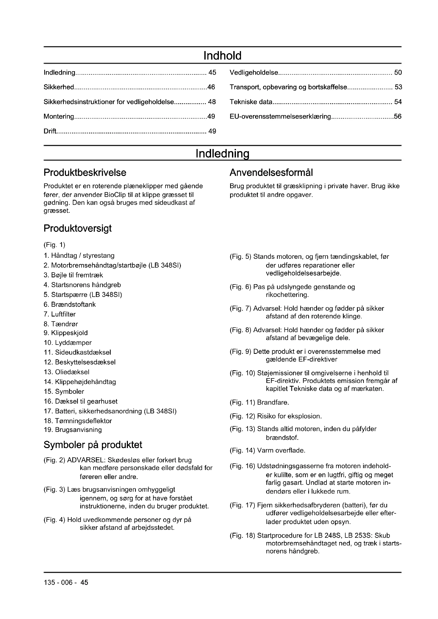 Symboler på produktet (Fig. 2) ADVARSEL: Skødesløs eller forkert brug kan medføre personskade eller dødsfald for føreren eller andre. (Fig. 3) Læs brugsanvisningen omhyggeligt igennem, og sørg for at have forstået instruktionerne, inden du bruger produktet. (Fig. 4) Hold uvedkommende personer og dyr på sikker afstand af arbejdsstedet. (Fig. 5) Stands motoren, og fjern tændingskablet, før der udføres reparationer eller vedligeholdelsesarbejde. (Fig. 6) Pas på udslyngede genstande og rikochettering. (Fig. 7) Advarsel: Hold hænder og fødder på sikker afstand af den roterende klinge. (Fig. 8) Advarsel: Hold hænder og fødder på sikker afstand af bevægelige dele. (Fig. 9) Dette produkt er i overensstemmelse med gældende EF-direktiver (Fig. 10) Støjemissioner til omgivelserne i henhold til EF-direktiv. Produktets emission fremgår af kapitlet Tekniske data og af mærkaten. (Fig. 11) Brandfare. (Fig. 12) Risiko for eksplosion. (Fig. 13) Stands altid motoren, inden du påfylder brændstof. (Fig. 14) Varm overflade. (Fig. 16) Udstødningsgasserne fra motoren indehold- er kulilte, som er en lugtfri, giftig og meget farlig gasart. Undlad at starte motoren in- dendørs eller i lukkede rum. (Fig. 17) Fjern sikkerhedsafbryderen (batteri), før du udfører vedligeholdelsesarbejde eller efter- lader produktet uden opsyn. (Fig. 18) Startprocedure for LB 248S, LB 253S: Skub motorbremsehåndtaget ned, og træk i starts- norens håndgreb.