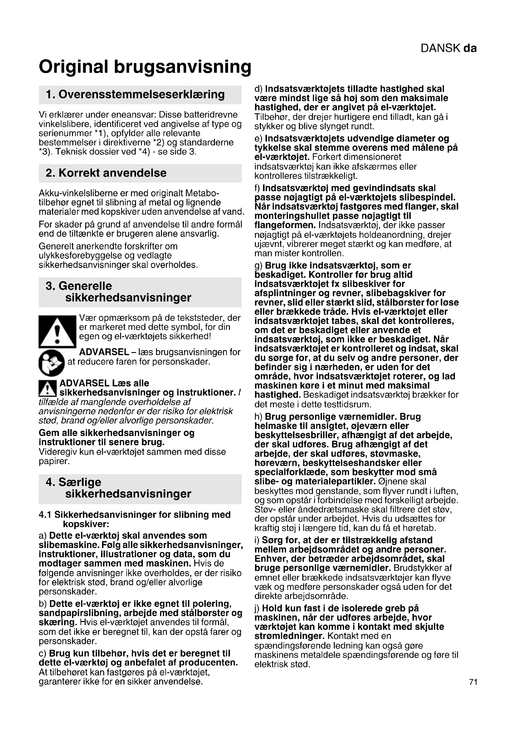 Original brugsanvisning Vi erklærer under eneansvar: Disse batteridrevne vinkelslibere, identificeret ved angivelse af type og serienummer *1), opfylder alle relevante bestemmelser i direktiverne *2) og standarderne *3). Teknisk dossier ved *4) - se side 3. Akku-vinkelsliberne er med originalt Metabo- tilbehør egnet til slibning af metal og lignende materialer med kopskiver uden anvendelse af vand. For skader på grund af anvendelse til andre formål end de tiltænkte er brugeren alene ansvarlig. Generelt anerkendte forskrifter om ulykkesforebyggelse og vedlagte sikkerhedsanvisninger skal overholdes. Vær opmærksom på de tekststeder, der er markeret med dette symbol, for din egen og el-værktøjets sikkerhed! ADVARSEL – læs brugsanvisningen for at reducere faren for personskader. ADVARSEL Læs alle sikkerhedsanvisninger og instruktioner. I tilfælde af manglende overholdelse af anvisningerne nedenfor er der risiko for elektrisk stød, brand og/eller alvorlige personskader. Gem alle sikkerhedsanvisninger og instruktioner til senere brug. Videregiv kun el-værktøjet sammen med disse papirer.