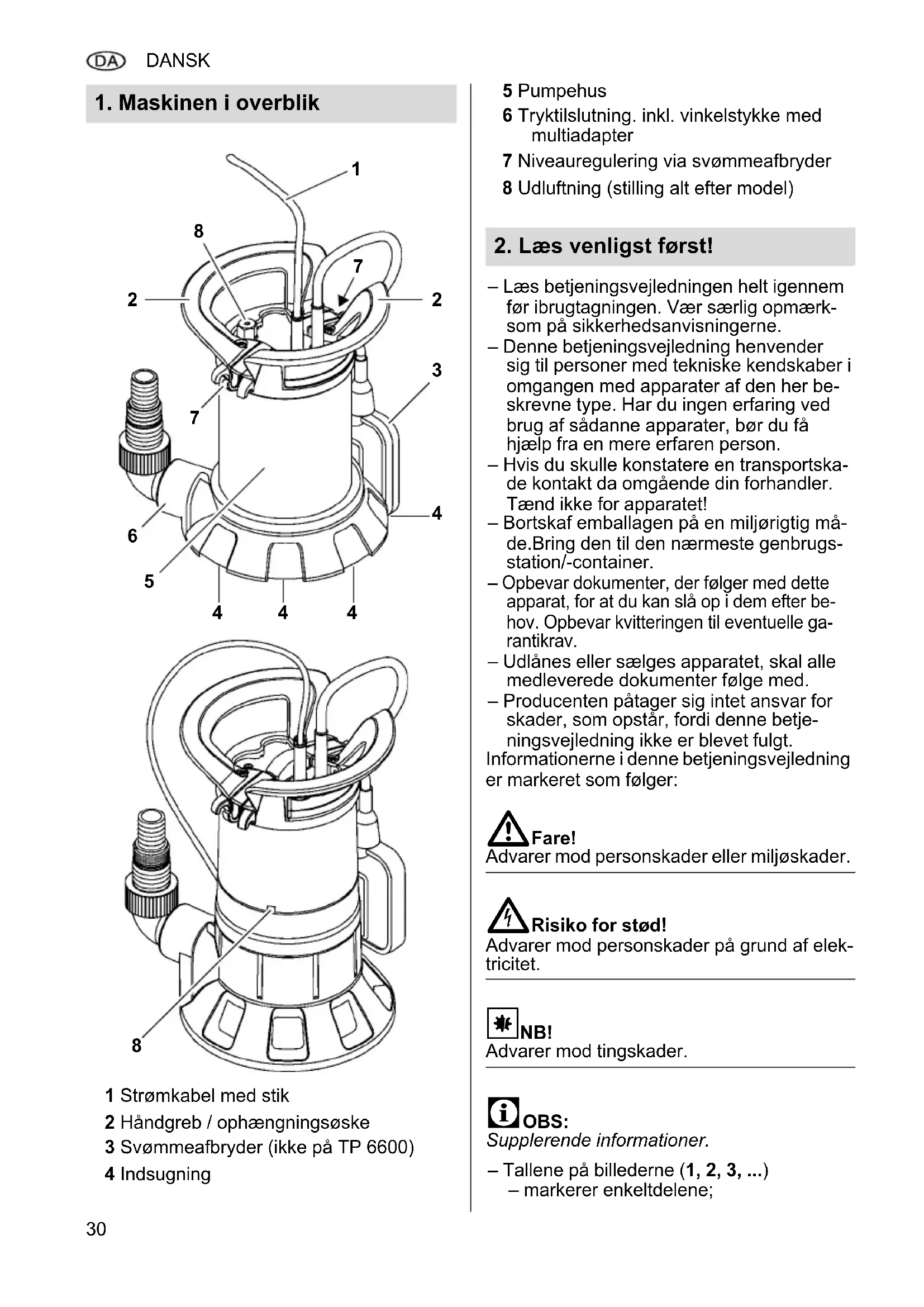 DANSK – Læs betjeningsvejledningen helt igennem før ibrugtagningen. Vær særlig opmærk- som på sikkerhedsanvisningerne. – Denne betjeningsvejledning henvender sig til personer med tekniske kendskaber i omgangen med apparater af den her be- skrevne type. Har du ingen erfaring ved brug af sådanne apparater, bør du få hjælp fra en mere erfaren person. – Hvis du skulle konstatere en transportska- de kontakt da omgående din forhandler. Tænd ikke for apparatet! – Bortskaf emballagen på en miljørigtig må- de.Bring den til den nærmeste genbrugs- station/-container. – Opbevar dokumenter, der følger med dette apparat, for at du kan slå op i dem efter be- hov. Opbevar kvitteringen til eventuelle ga- rantikrav. – Udlånes eller sælges apparatet, skal alle medleverede dokumenter følge med. – Producenten påtager sig intet ansvar for skader, som opstår, fordi denne betje- ningsvejledning ikke er blevet fulgt. Informationerne i denne betjeningsvejledning er markeret som følger: AFare! Advarer mod personskader eller miljøskader. BRisiko for stød! Advarer mod personskader på grund af elek- tricitet. A NB! Advarer mod tingskader. 3OBS: Supplerende informationer. – Tallene på billederne (1, 2, 3, ...) – markerer enkeltdelene;