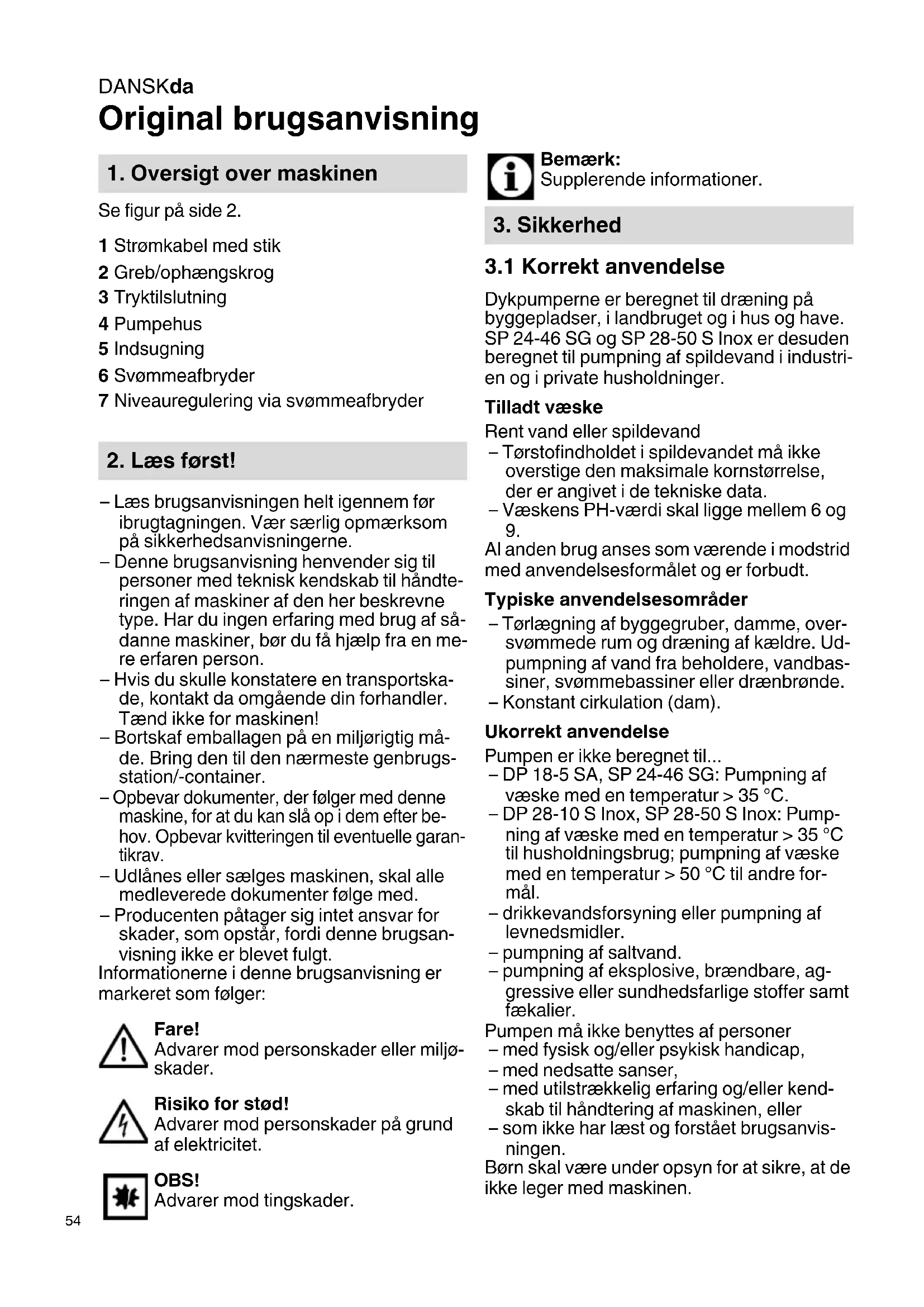 Dykpumperne er beregnet til dræning på byggepladser, i landbruget og i hus og have. SP 24-46 SG og SP 28-50 S Inox er desuden beregnet til pumpning af spildevand i industri- en og i private husholdninger. Tilladt væske Rent vand eller spildevand – Tørstofindholdet i spildevandet må ikke overstige den maksimale kornstørrelse, der er angivet i de tekniske data. – Væskens PH-værdi skal ligge mellem 6 og