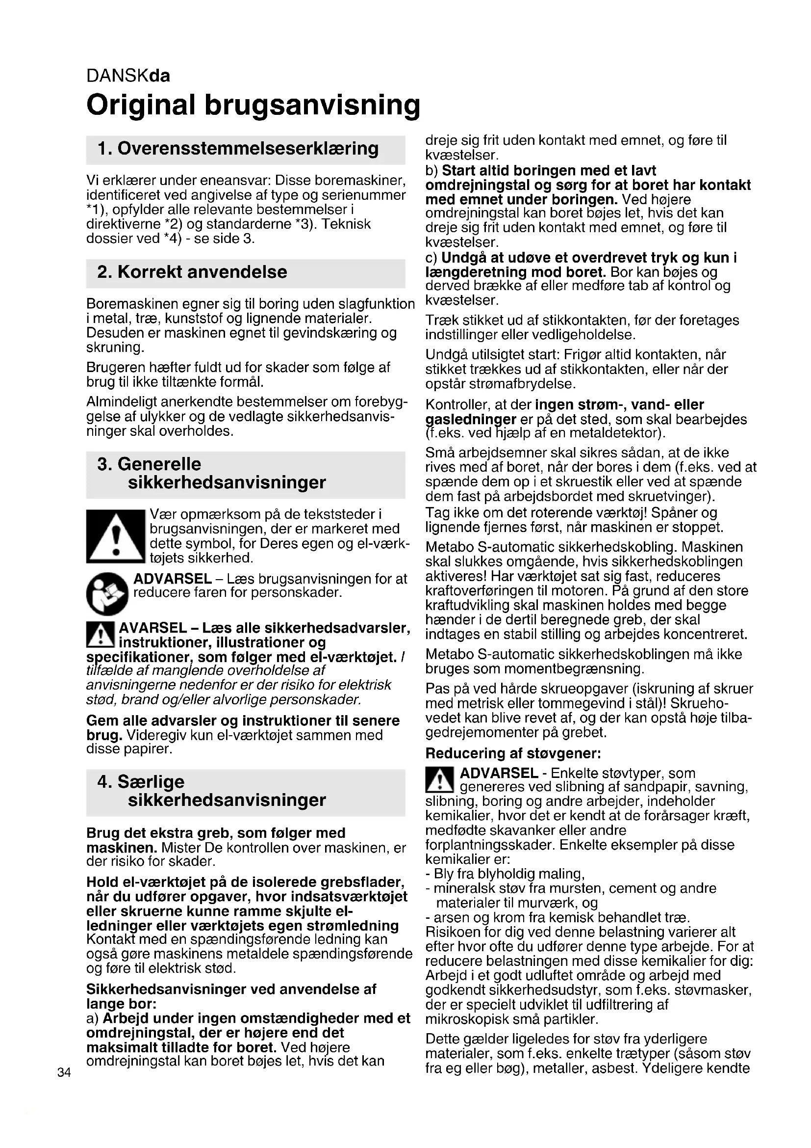 Original brugsanvisning Vi erklærer under eneansvar: Disse boremaskiner, identificeret ved angivelse af type og serienummer *1), opfylder alle relevante bestemmelser i direktiverne *2) og standarderne *3). Teknisk dossier ved *4) - se side 3. Boremaskinen egner sig til boring uden slagfunktion i metal, træ, kunststof og lignende materialer. Desuden er maskinen egnet til gevindskæring og skruning. Brugeren hæfter fuldt ud for skader som følge af brug til ikke tiltænkte formål. Almindeligt anerkendte bestemmelser om forebyg- gelse af ulykker og de vedlagte sikkerhedsanvis- ninger skal overholdes. Vær opmærksom på de tekststeder i brugsanvisningen, der er markeret med dette symbol, for Deres egen og el-værk- tøjets sikkerhed. ADVARSEL – Læs brugsanvisningen for at reducere faren for personskader. AVARSEL – Læs alle sikkerhedsadvarsler, instruktioner, illustrationer og specifikationer, som følger med el-værktøjet. I tilfælde af manglende overholdelse af anvisningerne nedenfor er der risiko for elektrisk stød, brand og/eller alvorlige personskader. Gem alle advarsler og instruktioner til senere brug. Videregiv kun el-værktøjet sammen med disse papirer. Brug det ekstra greb, som følger med maskinen. Mister De kontrollen over maskinen, er der risiko for skader. Hold el-værktøjet på de isolerede grebsflader, når du udfører opgaver, hvor indsatsværktøjet eller skruerne kunne ramme skjulte el- ledninger eller værktøjets egen strømledning Kontakt med en spændingsførende ledning kan også gøre maskinens metaldele spændingsførende og føre til elektrisk stød. Sikkerhedsanvisninger ved anvendelse af lange bor: a) Arbejd under ingen omstændigheder med et omdrejningstal, der er højere end det maksimalt tilladte for boret. Ved højere omdrejningstal kan boret bøjes let, hvis det kan dreje sig frit uden kontakt med emnet, og føre til kvæstelser. b) Start altid boringen med et lavt omdrejningstal og sørg for at boret har kontakt med emnet under boringen. Ved højere omdrejningstal kan boret bøjes let, hvis det kan dreje sig frit uden kontakt med emnet, og føre til kvæstelser. c) Undgå at udøve et overdrevet tryk og kun i længderetning mod boret. Bor kan bøjes og derved brække af eller medføre tab af kontrol og kvæstelser. Træk stikket ud af stikkontakten, før der foretages indstillinger eller vedligeholdelse. Undgå utilsigtet start: Frigør altid kontakten, når stikket trækkes ud af stikkontakten, eller når der opstår strømafbrydelse. Kontroller, at der ingen strøm-, vand- eller gasledninger er på det sted, som skal bearbejdes (f.eks. ved hjælp af en metaldetektor). Små arbejdsemner skal sikres sådan, at de ikke rives med af boret, når der bores i dem (f.eks. ved at spænde dem op i et skruestik eller ved at spænde dem fast på arbejdsbordet med skruetvinger). Tag ikke om det roterende værktøj! Spåner og lignende fjernes først, når maskinen er stoppet. Metabo S-automatic sikkerhedskobling. Maskinen skal slukkes omgående, hvis sikkerhedskoblingen aktiveres! Har værktøjet sat sig fast, reduceres kraftoverføringen til motoren. På grund af den store kraftudvikling skal maskinen holdes med begge hænder i de dertil beregnede greb, der skal indtages en stabil stilling og arbejdes koncentreret. Metabo S-automatic sikkerhedskoblingen må ikke bruges som momentbegrænsning. Pas på ved hårde skrueopgaver (iskruning af skruer med metrisk eller tommegevind i stål)! Skrueho- vedet kan blive revet af, og der kan opstå høje tilba- gedrejemomenter på grebet. Reducering af støvgener: ADVARSEL - Enkelte støvtyper, som genereres ved slibning af sandpapir, savning, slibning, boring og andre arbejder, indeholder kemikalier, hvor det er kendt at de forårsager kræft, medfødte skavanker eller andre forplantningsskader. Enkelte eksempler på disse kemikalier er: - Bly fra blyholdig maling, - mineralsk støv fra mursten, cement og andre materialer til murværk, og - arsen og krom fra kemisk behandlet træ. Risikoen for dig ved denne belastning varierer alt efter hvor ofte du udfører denne type arbejde. For at reducere belastningen med disse kemikalier for dig: Arbejd i et godt udluftet område og arbejd med godkendt sikkerhedsudstyr, som f.eks. støvmasker, der er specielt udviklet til udfiltrering af mikroskopisk små partikler. Dette gælder ligeledes for støv fra yderligere materialer, som f.eks. enkelte trætyper (såsom støv fra eg eller bøg), metaller, asbest. Ydeligere kendte