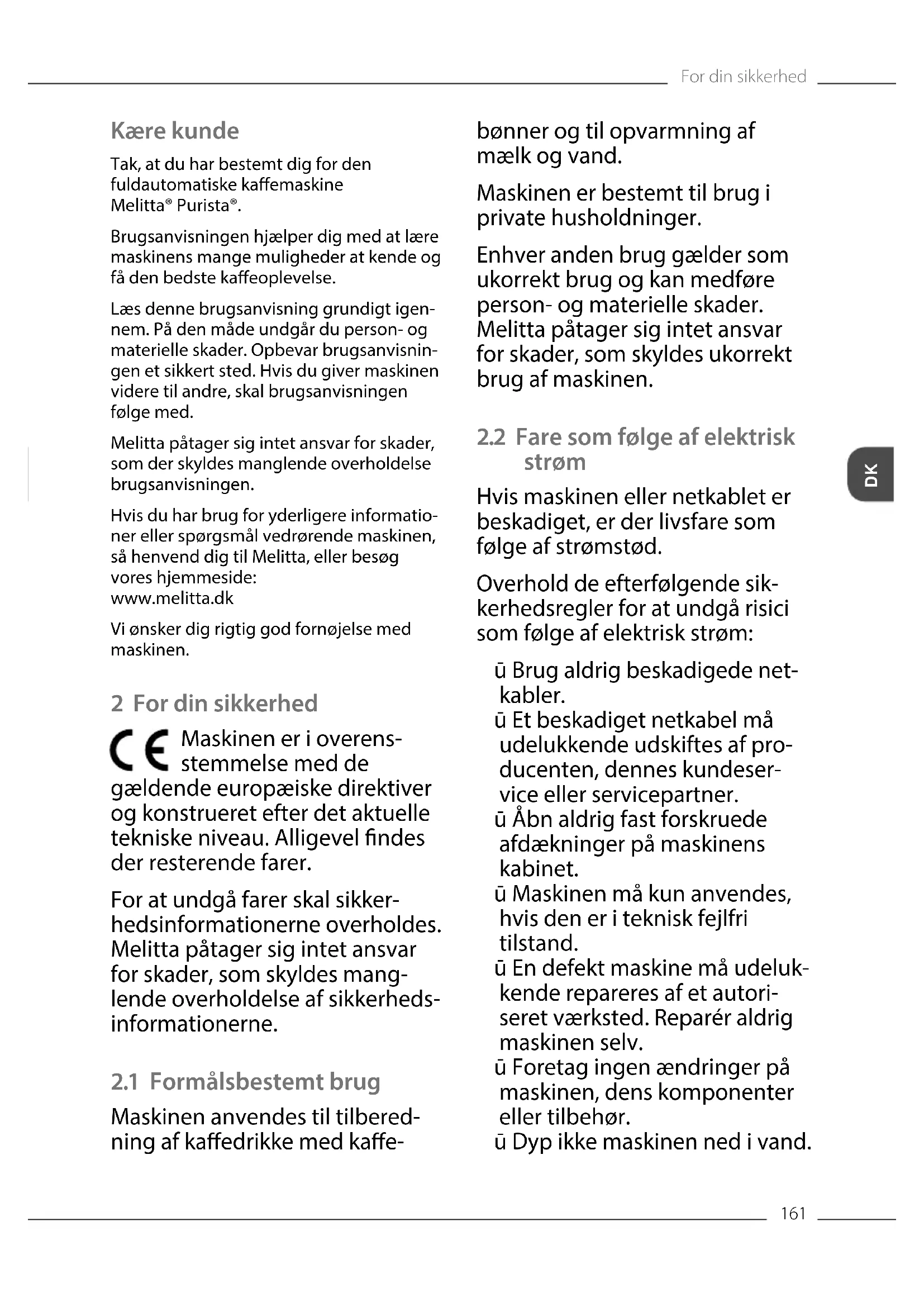 Kære kunde Tak, at du har bestemt dig for den fuldautomatiske kaemaskine Melitta® Purista®. Brugsanvisningen hjælper dig med at lære maskinens mange muligheder at kende og få den bedste kaeoplevelse. Læs denne brugsanvisning grundigt igen- nem. På den måde undgår du person- og materielle skader. Opbevar brugsanvisnin- gen et sikkert sted. Hvis du giver maskinen videre til andre, skal brugsanvisningen følge med. Melitta påtager sig intet ansvar for skader, som der skyldes manglende overholdelse brugsanvisningen. Hvis du har brug for yderligere informatio- ner eller spørgsmål vedrørende maskinen, så henvend dig til Melitta, eller besøg vores hjemmeside: www.melitta.dk Vi ønsker dig rigtig god fornøjelse med maskinen. 2 For din sikkerhed Maskinen er i overens- stemmelse med de gældende europæiske direktiver og konstrueret efter det aktuelle tekniske niveau. Alligevel ndes der resterende farer. For at undgå farer skal sikker- hedsinformationerne overholdes. Melitta påtager sig intet ansvar for skader, som skyldes mang- lende overholdelse af sikkerheds- informationerne.