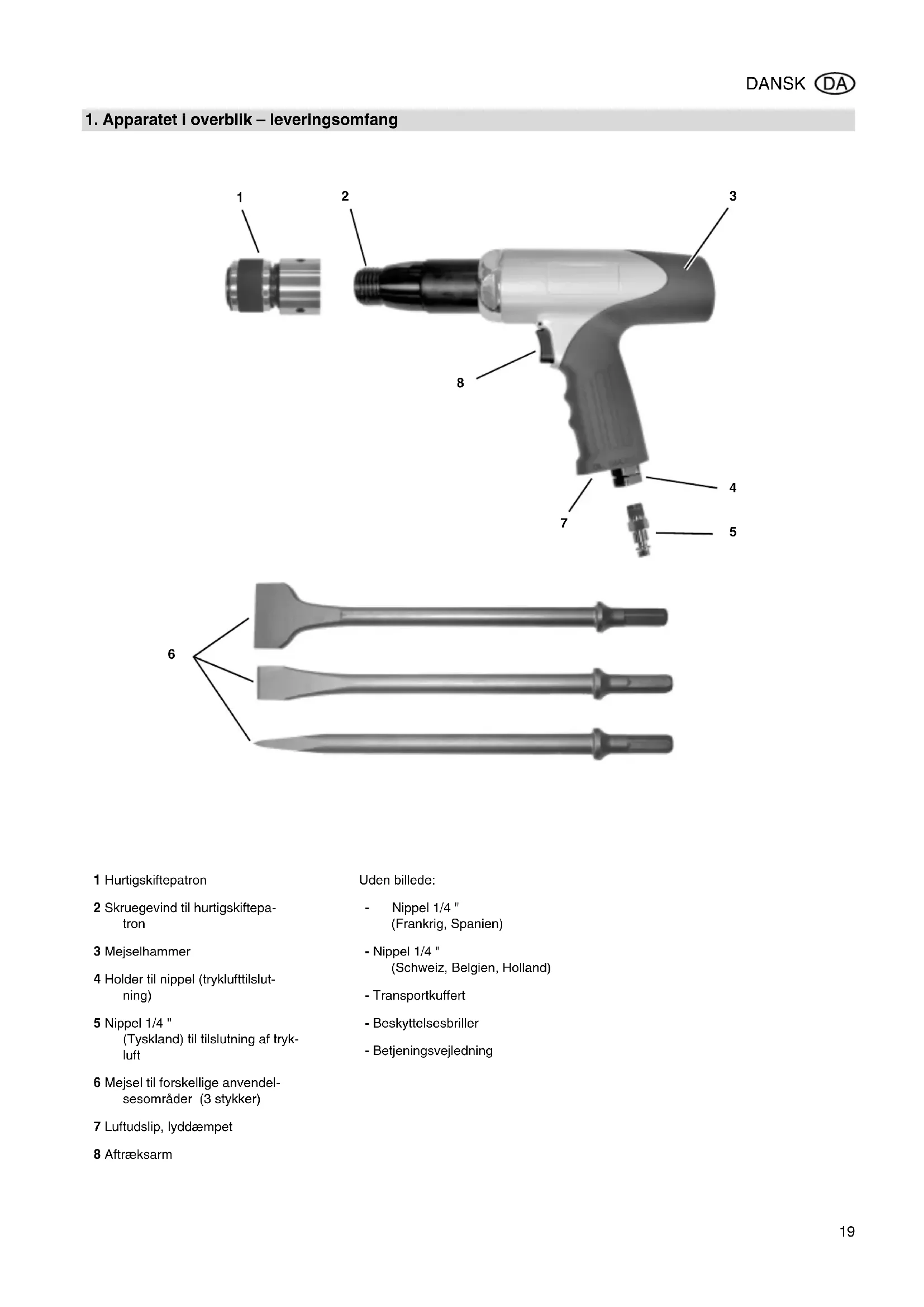 1 Hurtigskiftepatron 2 Skruegevind til hurtigskiftepa- tron 3 Mejselhammer 4 Holder til nippel (tryklufttilslut- ning) 5 Nippel 1/4 " (Tyskland) til tilslutning af tryk- luft 6 Mejsel til forskellige anvendel- sesområder (3 stykker) 7 Luftudslip, lyddæmpet 8 Aftræksarm Uden billede: - Nippel 1/4 " (Frankrig, Spanien) - Nippel 1/4 " (Schweiz, Belgien, Holland) - Transportkuffert - Beskyttelsesbriller - Betjeningsvejledning XK0044C2.fm Original brugsvejledning DANSK20 DANSK