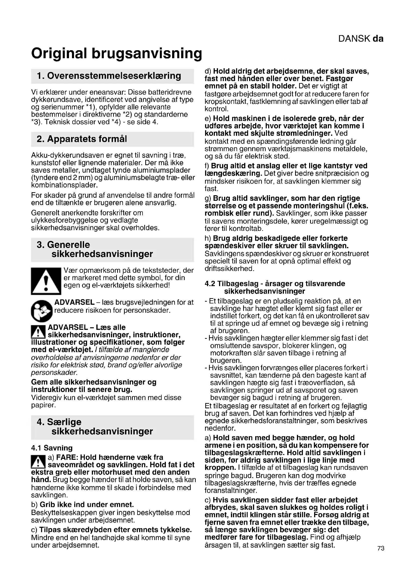 Original brugsanvisning Vi erklærer under eneansvar: Disse batteridrevne dykkerundsave, identificeret ved angivelse af type og serienummer *1), opfylder alle relevante bestemmelser i direktiverne *2) og standarderne *3). Teknisk dossier ved *4) - se side 4. Akku-dykkerundsaven er egnet til savning i træ, kunststof eller lignende materialer. Der må ikke saves metaller, undtaget tynde aluminiumsplader (tyndere end 2 mm) og aluminiumsbelagte træ- eller kombinationsplader. For skader på grund af anvendelse til andre formål end de tiltænkte er brugeren alene ansvarlig. Generelt anerkendte forskrifter om ulykkesforebyggelse og vedlagte sikkerhedsanvisninger skal overholdes. Vær opmærksom på de tekststeder, der er markeret med dette symbol, for din egen og el-værktøjets sikkerhed! ADVARSEL – læs brugsvejledningen for at reducere risikoen for personskader. ADVARSEL – Læs alle sikkerhedsanvisninger, instruktioner, illustrationer og specifikationer, som følger med el-værktøjet. I tilfælde af manglende overholdelse af anvisningerne nedenfor er der risiko for elektrisk stød, brand og/eller alvorlige personskader. Gem alle sikkerhedsanvisninger og instruktioner til senere brug. Videregiv kun el-værktøjet sammen med disse papirer.