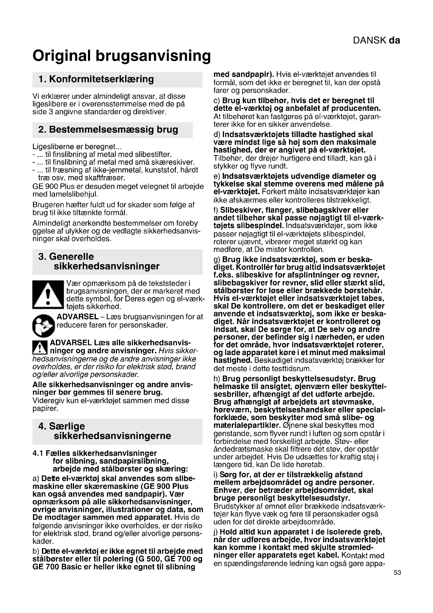 for slibning, sandpapirslibning, arbejde med stålbørster og skæring: a) Det te el-værktøj skal anvendes som slibe- maskine eller skæremaskine (GE 900 Plus kan også anvendes med sandpapir). Vær opmærk som på alle sikkerheds anvisninger, øvrige anvisninger, illustrationer og data, som De modtager sammen med apparatet. Hvis de følgende anvisninger ikke overholdes, er der risiko for elektrisk stød, brand og/eller alvorlige persons- kader. b) D ette el-værktøj er ikke egnet til arbejde med stålbørster eller til polering (G 500, GE 700 og GE 700 Basic er heller ikke egnet til slibning med sandpapir). Hvis el-værktøjet anvendes til formål, som det ikke er beregnet til, kan der opstå farer og personskader. c) Brug kun til behør, hvis det er beregnet til dette el-værktøj og anbefalet af producenten. At tilbehøret kan fastgøres på el-værktøjet, garan- terer ikke for en sikker anvendelse. d) Indsatsværktøjets tilladt e hastighed skal være mindst lige så høj som den maksimale hastighed, der er angivet på el-værktøjet. Tilbehør, der drejer hurtigere end tilladt, kan gå i stykker og flyve rundt. e) I ndsatsværktøjets udvendige diameter og tykkelse skal stemme overens med målene på el-værktøjet. Forkert målte indsatsværktøjer kan ikke afskærmes eller kontrolleres tilstrækkeligt. f) Slibeskiver, flanger, slibebag skiver eller andet tilbehør skal passe nøjagtigt til el-værk- tøjets slibespindel. Indsatsværktøjer, som ikke passer nøjagtigt til el-værktøjets slibespindel, roterer ujævnt, vibrerer meget stærkt og kan medføre, at De mister kontrollen. g) Bru g ikke indsatsværktøj, som er beska- diget. Kontrollér før brug altid indsatsværktøjet f.eks. slibeskive for afsplintninger og revner, slibebagskiver for revner, slid eller stærkt slid, stålbørster for løse eller brækkede børstehår. Hvis el-værktøjet eller indsatsværktøjet tabes, skal De kontrollere, om det er beskadiget eller anvende et indsatsværktøj, som ikke er beska- diget. Når indsatsværktøjet er kontrolleret og indsat, skal De sørge for, at De selv og andre