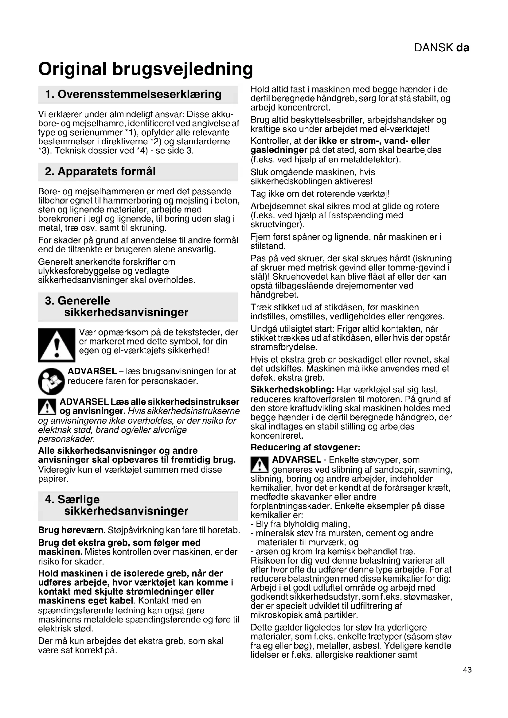 Vi erklærer under almindeligt ansvar: Disse akku- bore- og mejselhamre, identificeret ved angivelse af type og serienummer *1), opfylder alle relevante bestemmelser i direktiverne *2) og standarderne *3). Teknisk dossier ved *4) - se side 3. Bore- og mejselhammeren er med det passende tilbehør egnet til hammerboring og mejsling i beton, sten og lignende materialer, arbejde med borekroner i tegl og lignende, til boring uden slag i metal, træ osv. samt til skruning. For skader på grund af anvendelse til andre formål end de tiltænkte er brugeren alene ansvarlig. Generelt anerkendte forskrifter om ulykkesforebyggelse og vedlagte sikkerhedsanvisninger skal overholdes. Vær opmærksom på de tekststeder, der er markeret med dette symbol, for din egen og el-værktøjets sikkerhed! ADVARSEL – læs brugsanvisningen for at reducere faren for personskader. ADVARSEL Læs alle sikkerhedsinstrukser og anvisninger. Hvis sikkerhedsinstrukserne og anvisningerne ikke overholdes, er der risiko for elektrisk stød, brand og/eller alvorlige personskader. Alle sikkerhedsanvisninger og andre anvisninger skal opbevares til fremtidig brug. Videregiv kun el-værktøjet sammen med disse papirer. Brug høreværn. Støjpåvirkning kan føre til høretab. Brug det ekstra greb, som følger med maskinen. Mistes kontrollen over maskinen, er der risiko for skader. Hold maskinen i de isolerede greb, når der udføres arbejde, hvor værktøjet kan komme i kontakt med skjulte strømledninger eller maskinens eget kabel. Kontakt med en spændingsførende ledning kan også gøre maskinens metaldele spændingsførende og føre til elektrisk stød. Der må kun arbejdes det ekstra greb, som skal være sat korrekt på. Hold altid fast i maskinen med begge hænder i de dertil beregnede håndgreb, sørg for at stå stabilt, og arbejd koncentreret. Brug altid beskyttelsesbriller, arbejdshandsker og kraftige sko under arbejdet med el-værktøjet! Kontroller, at der ikke er strøm-, vand- eller gasledninger på det sted, som skal bearbejdes (f.eks. ved hjælp af en metaldetektor). Sluk omgående maskinen, hvis sikkerhedskoblingen aktiveres! Tag ikke om det roterende værktøj! Arbejdsemnet skal sikres mod at glide og rotere (f.eks. ved hjælp af fastspænding med skruetvinger). Fjern først spåner og lignende, når maskinen er i stilstand. Pas på ved skruer, der skal skrues hårdt (iskruning af skruer med metrisk gevind eller tomme-gevind i stål)! Skruehovedet kan blive flået af eller der kan opstå tilbageslående drejemomenter ved håndgrebet. Træk stikket ud af stikdåsen, før maskinen indstilles, omstilles, vedligeholdes eller rengøres. Undgå utilsigtet start: Frigør altid kontakten, når stikket trækkes ud af stikdåsen, eller hvis der opstår strømafbrydelse. Hvis et ekstra greb er beskadiget eller revnet, skal det udskiftes. Maskinen må ikke anvendes med et defekt ekstra greb. Sikkerhedskobling: Har værktøjet sat sig fast, reduceres kraftoverførslen til motoren. På grund af den store kraftudvikling skal maskinen holdes med begge hænder i de dertil beregnede håndgreb, der skal indtages en stabil stilling og arbejdes koncentreret. Reducering af støvgener: ADVARSEL - Enkelte støvtyper, som genereres ved slibning af sandpapir, savning, slibning, boring og andre arbejder, indeholder kemikalier, hvor det er kendt at de forårsager kræft, medfødte skavanker eller andre forplantningsskader. Enkelte eksempler på disse kemikalier er: - Bly fra blyholdig maling, - mineralsk støv fra mursten, cement og andre materialer til murværk, og - arsen og krom fra kemisk behandlet træ. Risikoen for dig ved denne belastning varierer alt efter hvor ofte du udfører denne type arbejde. For at reducere belastningen med disse kemikalier for dig: Arbejd i et godt udluftet område og arbejd med godkendt sikkerhedsudstyr, som f.eks. støvmasker, der er specielt udviklet til udfiltrering af mikroskopisk små partikler. Dette gælder ligeledes for støv fra yderligere materialer, som f.eks. enkelte trætyper (såsom støv fra eg eller bøg), metaller, asbest. Ydeligere kendte lidelser er f.eks. allergiske reaktioner samt Original brugsvejledning