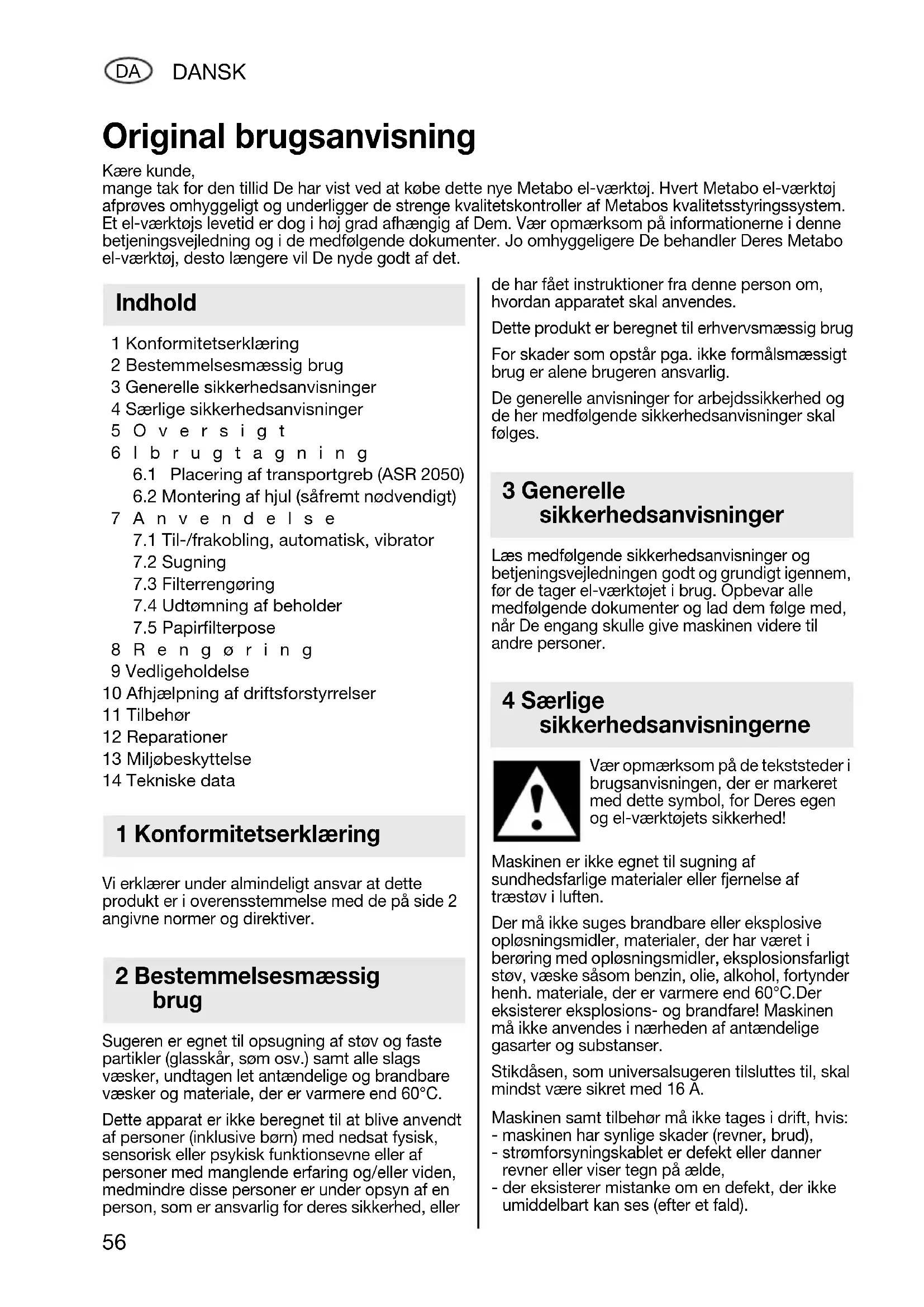 8Rengøring 9 Vedligeholdelse 10 Afhjælpning af driftsforstyrrelser 11 Tilbehør 12 Reparationer 13 Miljøbeskyttelse 14 Tekniske data Vi erklærer under almindeligt ansvar at dette produkt er i overensstemmelse med de på side 2 angivne normer og direktiver. Sugeren er egnet til opsugning af støv og faste partikler (glasskår, søm osv.) samt alle slags væsker, undtagen let antændelige og brandbare væsker og materiale, der er varmere end 60°C. Dette apparat er ikke beregnet til at blive anvendt af personer (inklusive børn) med nedsat fysisk, sensorisk eller psykisk funktionsevne eller af personer med manglende erfaring og/eller viden, medmindre disse personer er under opsyn af en person, som er ansvarlig for deres sikkerhed, eller de har fået instruktioner fra denne person om, hvordan apparatet skal anvendes. Dette produkt er beregnet til erhvervsmæssig brug For skader som opstår pga. ikke formålsmæssigt brug er alene brugeren ansvarlig. De generelle anvisninger for arbejdssikkerhed og de her medfølgende sikkerhedsanvisninger skal følges. Læs medfølgende sikkerhedsanvisninger og betjeningsvejledningen godt og grundigt igennem, før de tager el-værktøjet i brug. Opbevar alle medfølgende dokumenter og lad dem følge med, når De engang skulle give maskinen videre til andre personer. Vær opmærksom på de tekststeder i brugsanvisningen, der er markeret med dette symbol, for Deres egen og el-værktøjets sikkerhed! Maskinen er ikke egnet til sugning af sundhedsfarlige materialer eller fjernelse af træstøv i luften. Der må ikke suges brandbare eller eksplosive opløsningsmidler, materialer, der har været i berøring med opløsningsmidler, eksplosionsfarligt støv, væske såsom benzin, olie, alkohol, fortynder henh. materiale, der er varmere end 60°C.Der eksisterer eksplosions- og brandfare! Maskinen må ikke anvendes i nærheden af antændelige gasarter og substanser. Stikdåsen, som universalsugeren tilsluttes til, skal mindst være sikret med 16 A. Maskinen samt tilbehør må ikke tages i drift, hvis: - maskinen har synlige skader (revner, brud), - strømforsyningskablet er defekt eller danner revner eller viser tegn på ælde, - der eksisterer mistanke om en defekt, der ikke umiddelbart kan ses (efter et fald). Original brugsanvisning Kære kunde, mange tak for den tillid De har vist ved at købe dette nye Metabo el-værktøj. Hvert Metabo el-værktøj afprøves omhyggeligt og underligger de strenge kvalitetskontroller af Metabos kvalitetsstyringssystem. Et el-værktøjs levetid er dog i høj grad afhængig af Dem. Vær opmærksom på informationerne i denne betjeningsvejledning og i de medfølgende dokumenter. Jo omhyggeligere De behandler Deres Metabo el-værktøj, desto længere vil De nyde godt af det. Indhold 1 Konformitetserklæring 2 Bestemmelsesmæssig brug 3 Generelle sikkerhedsanvisninger 4 Særlige sikkerhedsanvisningerne 17026696_0810 ASR 2025 und ASR 2050.book Seite 56 Mittwoch, 18. August 2010 5:10 17DANSK