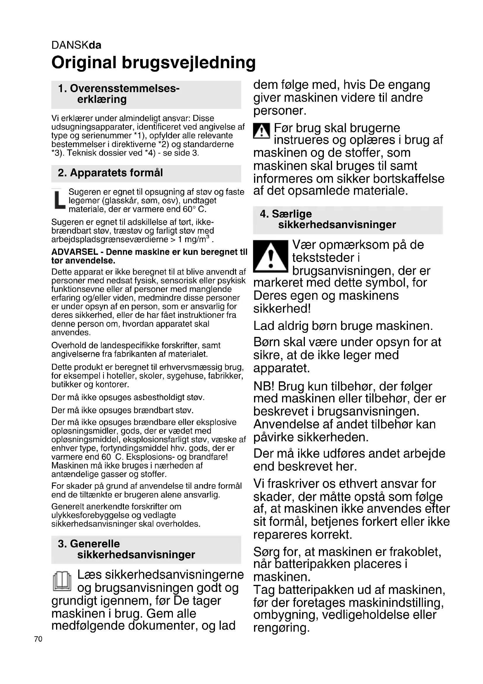 Original brugsvejledning Vi erklærer under almindeligt ansvar: Disse udsugningsapparater, identificeret ved angivelse af type og serienummer *1), opfylder alle relevante bestemmelser i direktiverne *2) og standarderne *3). Teknisk dossier ved *4) - se side 3. Sugeren er egnet til opsugning af støv og faste legemer (glasskår, søm, osv), undtaget materiale, der er varmere end 60° C. Sugeren er egnet til adskillelse af tørt, ikke- brændbart støv, træstøv og farligt støv med arbejdspladsgrænseværdierne > 1 mg/m³ . ADVARSEL - Denne maskine er kun beregnet til tør anvendelse. Dette apparat er ikke beregnet til at blive anvendt af personer med nedsat fysisk, sensorisk eller psykisk funktionsevne eller af personer med manglende erfaring og/eller viden, medmindre disse personer er under opsyn af en person, som er ansvarlig for deres sikkerhed, eller de har fået instruktioner fra denne person om, hvordan apparatet skal anvendes. Overhold de landespecifikke forskrifter, samt angivelserne fra fabrikanten af materialet. Dette produkt er beregnet til erhvervsmæssig brug, for eksempel i hoteller, skoler, sygehuse, fabrikker, butikker og kontorer. Der må ikke opsuges asbestholdigt støv. Der må ikke opsuges brændbart støv. Der må ikke opsuges brændbare eller eksplosive opløsningsmidler, gods, der er vædet med opløsningsmiddel, eksplosionsfarligt støv, væske af enhver type, fortyndingsmiddel hhv. gods, der er varmere end 60 C. Eksplosions- og brandfare! Maskinen må ikke bruges i nærheden af antændelige gasser og stoffer. For skader på grund af anvendelse til andre formål end de tiltænkte er brugeren alene ansvarlig. Generelt anerkendte forskrifter om ulykkesforebyggelse og vedlagte sikkerhedsanvisninger skal overholdes. Læs sikkerhedsanvisningerne og brugsanvisningen godt og grundigt igennem, før De tager maskinen i brug. Gem alle medfølgende dokumenter, og lad dem følge med, hvis De engang giver maskinen videre til andre personer. Før brug skal brugerne instrueres og oplæres i brug af maskinen og de stoffer, som maskinen skal bruges til samt informeres om sikker bortskaffelse af det opsamlede materiale. Vær opmærksom på de tekststeder i brugsanvisningen, der er markeret med dette symbol, for Deres egen og maskinens sikkerhed! Lad aldrig børn bruge maskinen. Børn skal være under opsyn for at sikre, at de ikke leger med apparatet. NB! Brug kun tilbehør, der følger med maskinen eller tilbehør, der er beskrevet i brugsanvisningen. Anvendelse af andet tilbehør kan påvirke sikkerheden. Der må ikke udføres andet arbejde end beskrevet her. Vi fraskriver os ethvert ansvar for skader, der måtte opstå som følge af, at maskinen ikke anvendes efter sit formål, betjenes forkert eller ikke repareres korrekt. Sørg for, at maskinen er frakoblet, når batteripakken placeres i maskinen. Tag batteripakken ud af maskinen, før der foretages maskinindstilling, ombygning, vedligeholdelse eller rengøring.