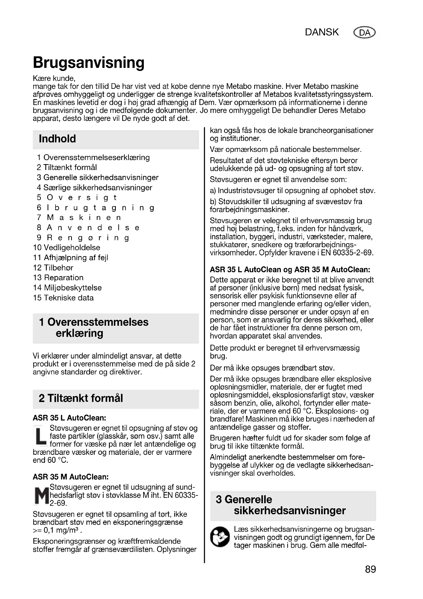 1 Overensstemmelseserklæring 2 Tiltænkt formål 3 Generelle sikkerhedsanvisninger 4 Særlige sikkerhedsanvisninger 5Oversigt 6Ibrugtagning 7Maskinen 8Anvendelse 9Rengøring 10 Vedligeholdelse 11 Afhjælpning af fejl 12 Tilbehør 13 Reparation 14 Miljøbeskyttelse 15 Tekniske data Vi erklærer under almindeligt ansvar, at dette produkt er i overensstemmelse med de på side 2 angivne standarder og direktiver. ASR 35 L AutoClean: Støvsugeren er egnet til opsugning af støv og faste partikler (glasskår, søm osv.) samt alle former for væske på nær let antændelige og brændbare væsker og materiale, der er varmere end 60 °C. ASR 35 M AutoClean: Støvsugeren er egnet til udsugning af sund- hedsfarligt støv i støvklasse M iht. EN 60335- 2-69. Støvsugeren er egnet til opsamling af tørt, ikke brændbart støv med en eksponeringsgrænse >= 0,1 mg/m³ . Eksponeringsgrænser og kræftfremkaldende stoffer fremgår af grænseværdilisten. Oplysninger kan også fås hos de lokale brancheorganisationer og institutioner. Vær opmærksom på nationale bestemmelser. Resultatet af det støvtekniske eftersyn beror udelukkende på ud- og opsugning af tørt støv. Støvsugeren er egnet til anvendelse som: a) Industristøvsuger til opsugning af ophobet støv. b) Støvudskiller til udsugning af svævestøv fra forarbejdningsmaskiner. Støvsugeren er velegnet til erhvervsmæssig brug med høj belastning, f.eks. inden for håndværk, installation, byggeri, industri, værksteder, malere, stukkatører, snedkere og træforarbejdnings- virksomheder. Opfylder kravene i EN 60335-2-69. ASR 35 L AutoClean og ASR 35 M AutoClean: Dette apparat er ikke beregnet til at blive anvendt af personer (inklusive børn) med nedsat fysisk, sensorisk eller psykisk funktionsevne eller af personer med manglende erfaring og/eller viden, medmindre disse personer er under opsyn af en person, som er ansvarlig for deres sikkerhed, eller de har fået instruktioner fra denne person om, hvordan apparatet skal anvendes. Dette produkt er beregnet til erhvervsmæssig brug. Der må ikke opsuges brændbart støv. Der må ikke opsuges brændbare eller eksplosive opløsningsmidler, materiale, der er fugtet med opløsningsmiddel, eksplosionsfarligt støv, væsker såsom benzin, olie, alkohol, fortynder eller mate- riale, der er varmere end 60 °C. Eksplosions- og brandfare! Maskinen må ikke bruges i nærheden af antændelige gasser og stoffer. Brugeren hæfter fuldt ud for skader som følge af brug til ikke tiltænkte formål. Almindeligt anerkendte bestemmelser om fore- byggelse af ulykker og de vedlagte sikkerhedsan- visninger skal overholdes. Læs sikkerhedsanvisningerne og brugsan- visningen godt og grundigt igennem, før De tager maskinen i brug. Gem alle medføl- Brugsanvisning Kære kunde, mange tak for den tillid De har vist ved at købe denne nye Metabo maskine. Hver Metabo maskine afprøves omhyggeligt og underligger de strenge kvalitetskontroller af Metabos kvalitetsstyringssystem. En maskines levetid er dog i høj grad afhængig af Dem. Vær opmærksom på informationerne i denne brugsanvisning og i de medfølgende dokumenter. Jo mere omhyggeligt De behandler Deres Metabo apparat, desto længere vil De nyde godt af det. Indhold 1 Overensstemmelses erklæring 2 Tiltænkt formål 3 Generelle sikkerhedsanvisninger 17027067_0711 ASR 35 L_M AutoClean ENTWURF.book Seite 89 Montag, 25. Juli 2011 4:46 1690 DANSK