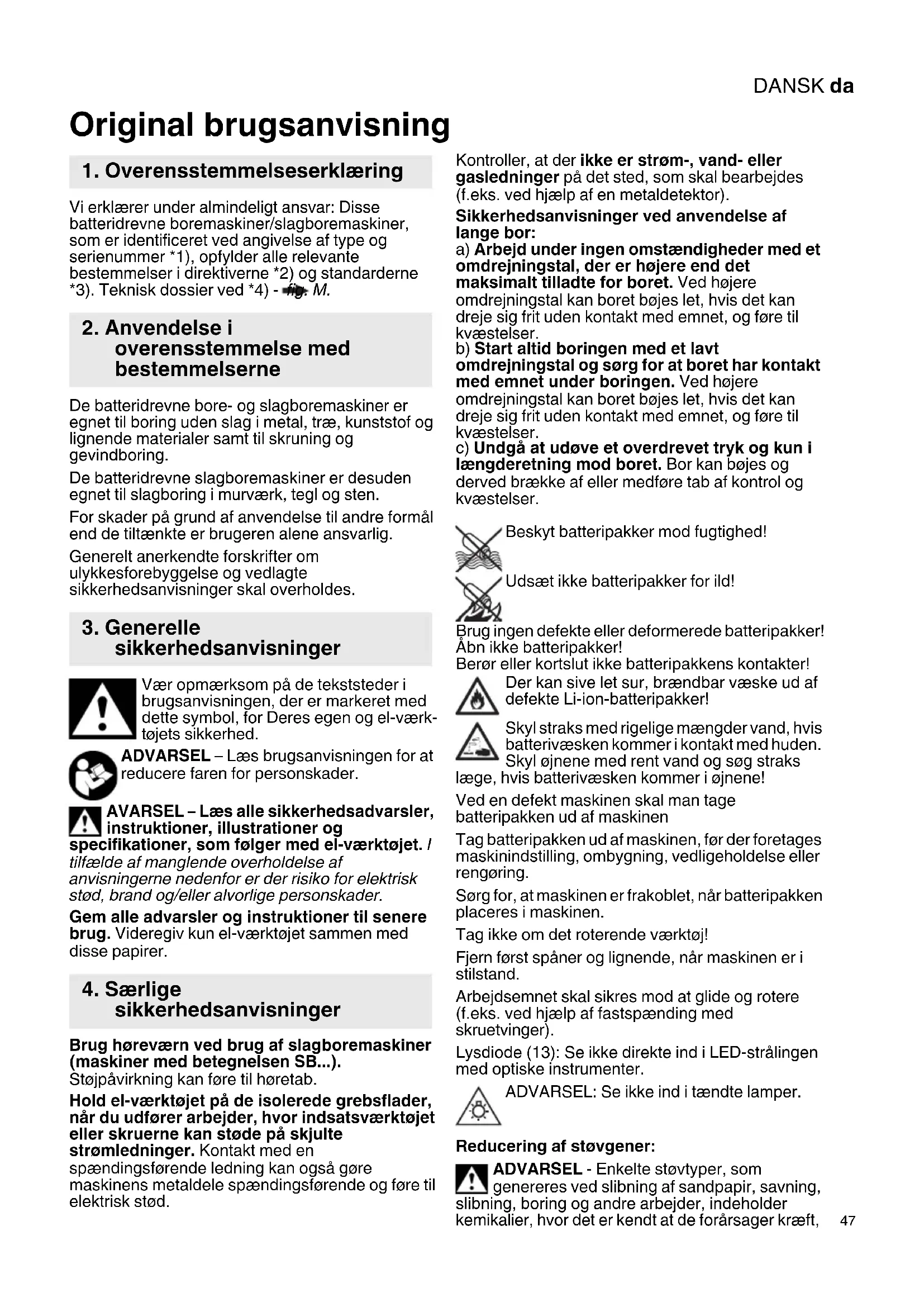 Vi erklærer under almindeligt ansvar: Disse batteridrevne boremaskiner/slagboremaskiner, som er identificeret ved angivelse af type og serienummer *1), opfylder alle relevante bestemmelser i direktiverne *2) og standarderne *3). Teknisk dossier ved *4) - fig. M. De batteridrevne bore- og slagboremaskiner er egnet til boring uden slag i metal, træ, kunststof og lignende materialer samt til skruning og gevindboring. De batteridrevne slagboremaskiner er desuden egnet til slagboring i murværk, tegl og sten. For skader på grund af anvendelse til andre formål end de tiltænkte er brugeren alene ansvarlig. Generelt anerkendte forskrifter om ulykkesforebyggelse og vedlagte sikkerhedsanvisninger skal overholdes. Vær opmærksom på de tekststeder i brugsanvisningen, der er markeret med dette symbol, for Deres egen og el-værk- tøjets sikkerhed. ADVARSEL – Læs brugsanvisningen for at reducere faren for personskader. AVARSEL – Læs alle sikkerhedsadvarsler, instruktioner, illustrationer og specifikationer, som følger med el-værktøjet. I tilfælde af manglende overholdelse af anvisningerne nedenfor er der risiko for elektrisk stød, brand og/eller alvorlige personskader. Gem alle advarsler og instruktioner til senere brug. Videregiv kun el-værktøjet sammen med disse papirer. Brug høreværn ved brug af slagboremaskiner (maskiner med betegnelsen SB...). Støjpåvirkning kan føre til høretab. Hold el-værktøjet på de isolerede grebsflader, når du udfører arbejder, hvor indsatsværktøjet eller skruerne kan støde på skjulte strømledninger. Kontakt med en spændingsførende ledning kan også gøre maskinens metaldele spændingsførende og føre til elektrisk stød. Kontroller, at der ikke er strøm-, vand- eller gasledninger på det sted, som skal bearbejdes (f.eks. ved hjælp af en metaldetektor). Sikkerhedsanvisninger ved anvendelse af lange bor: a) Arbejd under ingen omstændigheder med et omdrejningstal, der er højere end det maksimalt tilladte for boret. Ved højere omdrejningstal kan boret bøjes let, hvis det kan dreje sig frit uden kontakt med emnet, og føre til kvæstelser. b) Start altid boringen med et lavt omdrejningstal og sørg for at boret har kontakt med emnet under boringen. Ved højere omdrejningstal kan boret bøjes let, hvis det kan dreje sig frit uden kontakt med emnet, og føre til kvæstelser. c) Undgå at udøve et overdrevet tryk og kun i længderetning mod boret. Bor kan bøjes og derved brække af eller medføre tab af kontrol og kvæstelser. Beskyt batteripakker mod fugtighed! Udsæt ikke batteripakker for ild! Brug ingen defekte eller deformerede batteripakker! Åbn ikke batteripakker! Berør eller kortslut ikke batteripakkens kontakter! Der kan sive let sur, brændbar væske ud af defekte Li-ion-batteripakker! Skyl straks med rigelige mængder vand, hvis batterivæsken kommer i kontakt med huden. Skyl øjnene med rent vand og søg straks læge, hvis batterivæsken kommer i øjnene! Ved en defekt maskinen skal man tage batteripakken ud af maskinen Tag batteripakken ud af maskinen, før der foretages maskinindstilling, ombygning, vedligeholdelse eller rengøring. Sørg for, at maskinen er frakoblet, når batteripakken placeres i maskinen. Tag ikke om det roterende værktøj! Fjern først spåner og lignende, når maskinen er i stilstand. Arbejdsemnet skal sikres mod at glide og rotere (f.eks. ved hjælp af fastspænding med skruetvinger). Lysdiode (13): Se ikke direkte ind i LED-strålingen med optiske instrumenter. ADVARSEL: Se ikke ind i tændte lamper. Reducering af støvgener: ADVARSEL - Enkelte støvtyper, som genereres ved slibning af sandpapir, savning, slibning, boring og andre arbejder, indeholder kemikalier, hvor det er kendt at de forårsager kræft, Original brugsanvisning