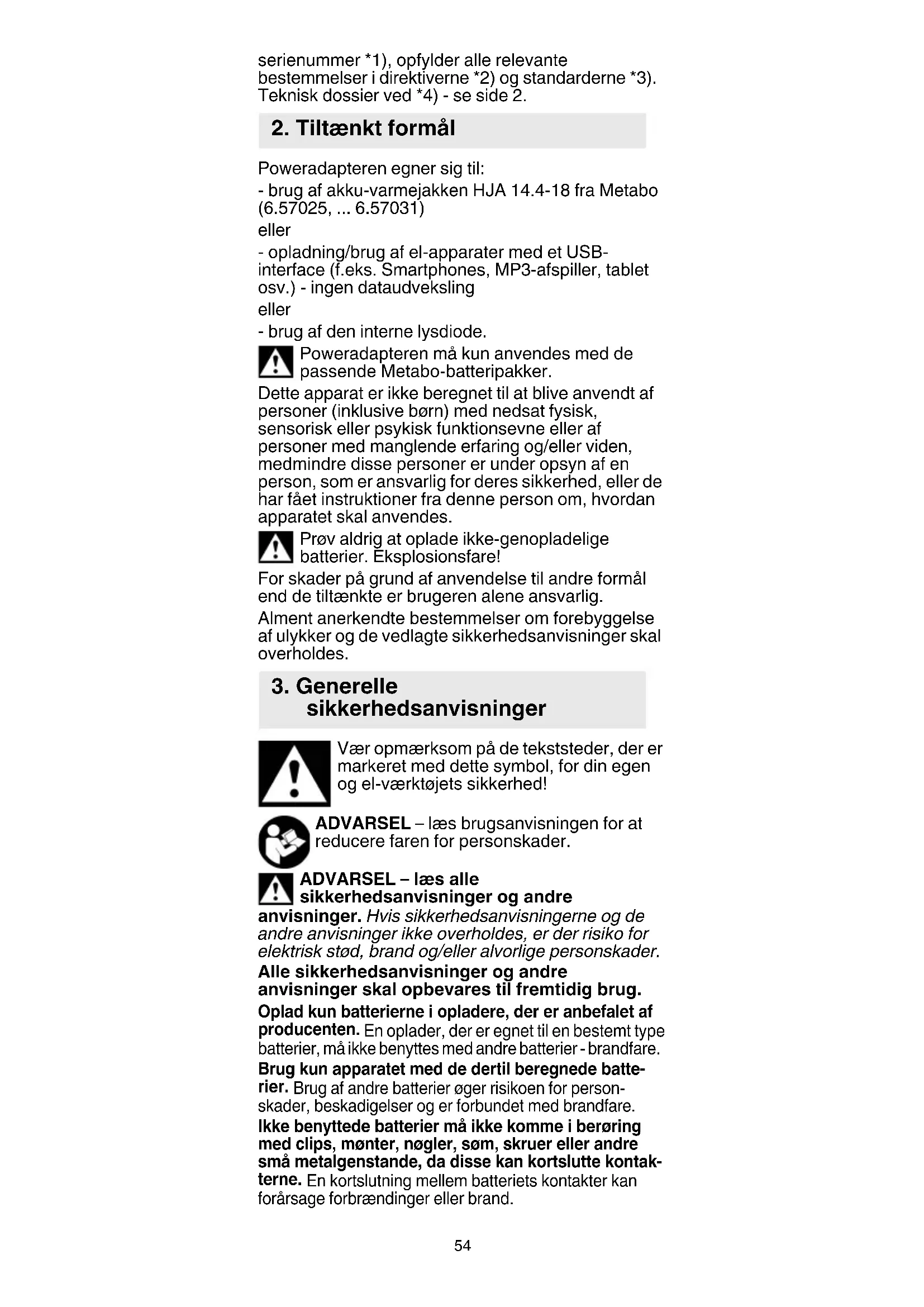 serienummer *1), opfylder alle relevante bestemmelser i direktiverne *2) og standarderne *3). Teknisk dossier ved *4) - se side 2. Poweradapteren egner sig til: - brug af akku-varmejakken HJA 14.4-18 fra Metabo (6.57025, ... 6.57031) eller - opladning/brug af el-apparater med et USB- interface (f.eks. Smartphones, MP3-afspiller, tablet osv.) - ingen dataudveksling eller - brug af den interne lysdiode. Poweradapteren må kun anvendes med de passende Metabo-batteripakker. Dette apparat er ikke beregnet til at blive anvendt af personer (inklusive børn) med nedsat fysisk, sensorisk eller psykisk funktionsevne eller af personer med manglende erfaring og/eller viden, medmindre disse personer er under opsyn af en person, som er ansvarlig for deres sikkerhed, eller de har fået instruktioner fra denne person om, hvordan apparatet skal anvendes. Prøv aldrig at oplade ikke-genopladelige batterier. Eksplosionsfare! For skader på grund af anvendelse til andre formål end de tiltænkte er brugeren alene ansvarlig. Alment anerkendte bestemmelser om forebyggelse af ulykker og de vedlagte sikkerhedsanvisninger skal overholdes. Vær opmærksom på de tekststeder, der er markeret med dette symbol, for din egen og el-værktøjets sikkerhed! ADVARSEL – læs brugsanvisningen for at reducere faren for personskader. ADVARSEL – læs alle sikkerhedsanvisninger og andre anvisninger. Hvis sikkerhedsanvisningerne og de andre anvisninger ikke overholdes, er der risiko for elektrisk stød, brand og/eller alvorlige personskader. Alle sikkerhedsanvisninger og andre anvisninger skal opbevares til fremtidig brug. Oplad kun batterierne i opladere, der er anbefalet af producenten. En oplader, der er egnet til en bestemt type batterier, må ikke benyttes med andre batterier - brandfare. Brug kun apparatet med de dertil beregnede batte- rier. Brug af andre batterier øger risikoen for person- skader, beskadigelser og er forbundet med brandfare. Ikke benyttede batterier må ikke komme i berøring med clips, mønter, nøgler, søm, skruer eller andre små metalgenstande, da disse kan kortslutte kontak- terne. En kortslutning mellem batteriets kontakter kan forårsage forbrændinger eller brand.