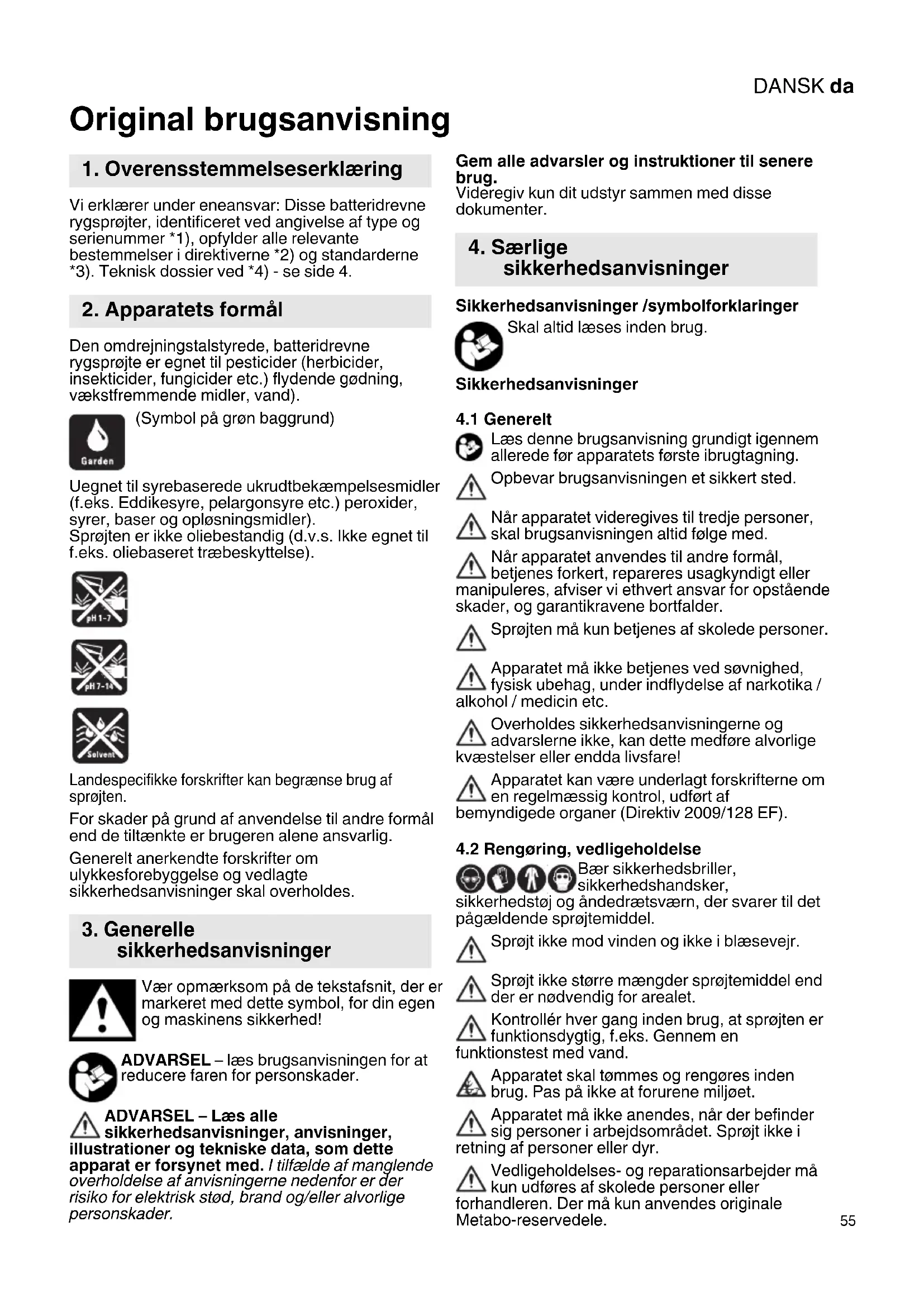 Original brugsanvisning Vi erklærer under eneansvar: Disse batteridrevne rygsprøjter, identificeret ved angivelse af type og serienummer *1), opfylder alle relevante bestemmelser i direktiverne *2) og standarderne *3). Teknisk dossier ved *4) - se side 4. Den omdrejningstalstyrede, batteridrevne rygsprøjte er egnet til pesticider (herbicider, insekticider, fungicider etc.) flydende gødning, vækstfremmende midler, vand). (Symbol på grøn baggrund) Uegnet til syrebaserede ukrudtbekæmpelsesmidler (f.eks. Eddikesyre, pelargonsyre etc.) peroxider, syrer, baser og opløsningsmidler). Sprøjten er ikke oliebestandig (d.v.s. Ikke egnet til f.eks. oliebaseret træbeskyttelse). Landespecifikke forskrifter kan begrænse brug af sprøjten. For skader på grund af anvendelse til andre formål end de tiltænkte er brugeren alene ansvarlig. Generelt anerkendte forskrifter om ulykkesforebyggelse og vedlagte sikkerhedsanvisninger skal overholdes. Vær opmærksom på de tekstafsnit, der er markeret med dette symbol, for din egen og maskinens sikkerhed! ADVARSEL – læs brugsanvisningen for at reducere faren for personskader. ADVARSEL – Læs alle sikkerhedsanvisninger, anvisninger, illustrationer og tekniske data, som dette apparat er forsynet med. I tilfælde af manglende overholdelse af anvisningerne nedenfor er der risiko for elektrisk stød, brand og/eller alvorlige personskader. Gem alle advarsler og instruktioner til senere brug. Videregiv kun dit udstyr sammen med disse dokumenter. Sikkerhedsanvisninger /symbolforklaringer Skal altid læses inden brug. Sikkerhedsanvisninger