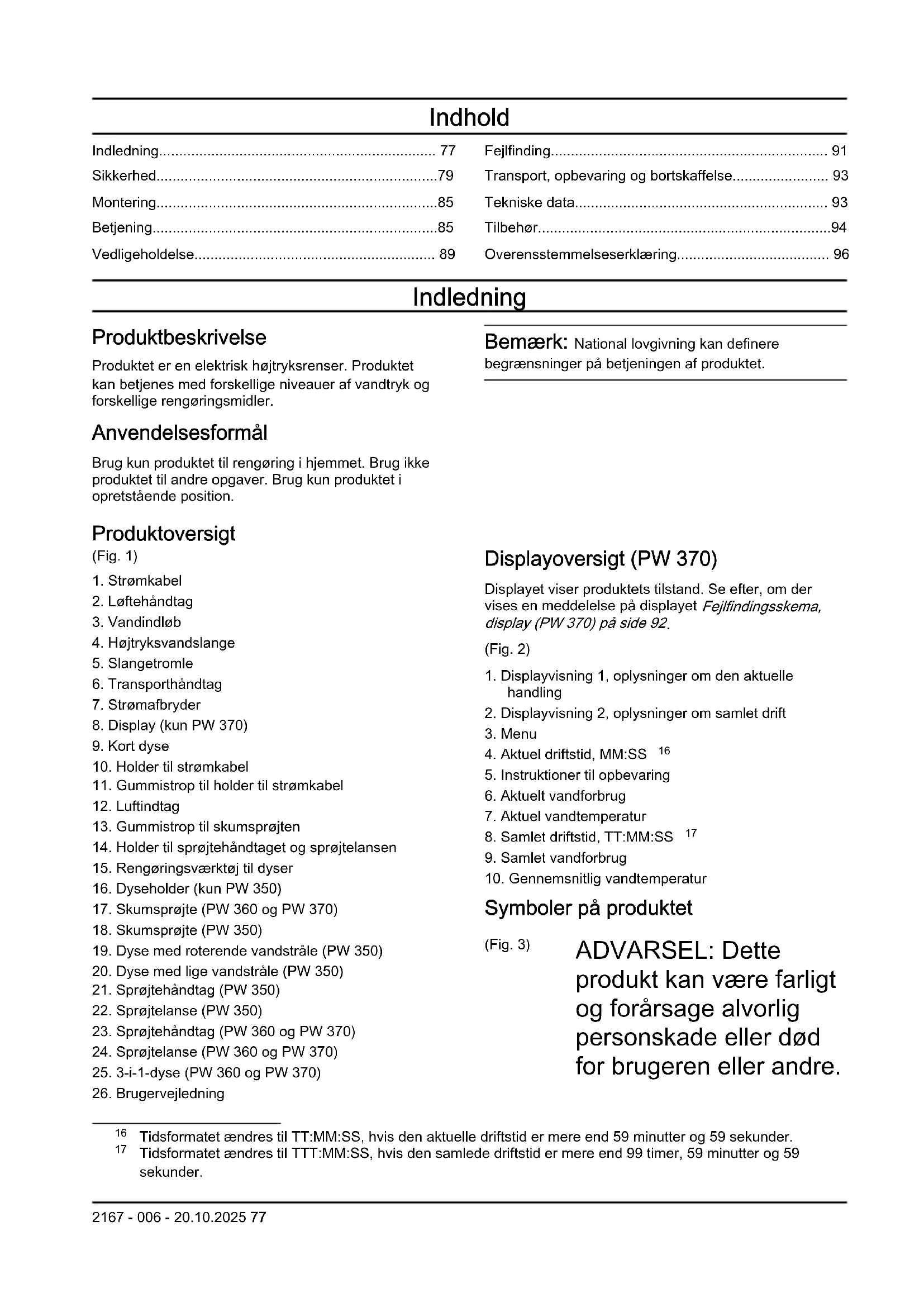 Tidsformatet ændres til TTT:MM:SS, hvis den samlede driftstid er mere end 99 timer, 59 minutter og 59 sekunder. 2167 - 006 - 20.10.2025 77Vær forsigtig, og brug produktet korrekt. (Fig. 4) Læs brugervejledningen, og sørg for at have forstået indholdet, inden du bruger dette produkt. (Fig. 5) Produktet er ikke egnet til tilslutning til drikkevandsforsyningen. (Fig. 6) Højtryksvandstråler kan være farlige, hvis de bruges forkert. Strålen må ikke rettes mod personer, elektrisk udstyr eller produktet. (Fig. 7) Miljømærke. Produktet og produktemballagen er ikke almindeligt husholdningsaffald. Aflever det på en godkendt genbrugsstation til elektrisk og elektronisk udstyr. (Fig. 8) Klasse II-værktøj. (Fig. 9) Mærkat vedrørende støjemission til omgivelserne i henhold til direktiver og regulativer i EU og Storbritannien og New South Wales' lovgivning om "Beskyttelse af miljøet (støjbegrænsning) forordning 2017". Produktets garanterede lydeffektniveau er angivet i Tekniske data på side 93 og på mærkaten. (Fig. 10) Beskyttet mod lavtryksvandstrøm fra alle vinkler. (Fig. 11) Skal holdes væk fra frost. (Fig. 12) Produktet er i overensstemmelse med de gældende EF- direktiver. Bemærk: Andre symboler/mærkater på produktet henviser til certificeringskrav på visse markeder. Skader på produktet Vi er ikke ansvarlige for skader på vores produkt, hvis:
