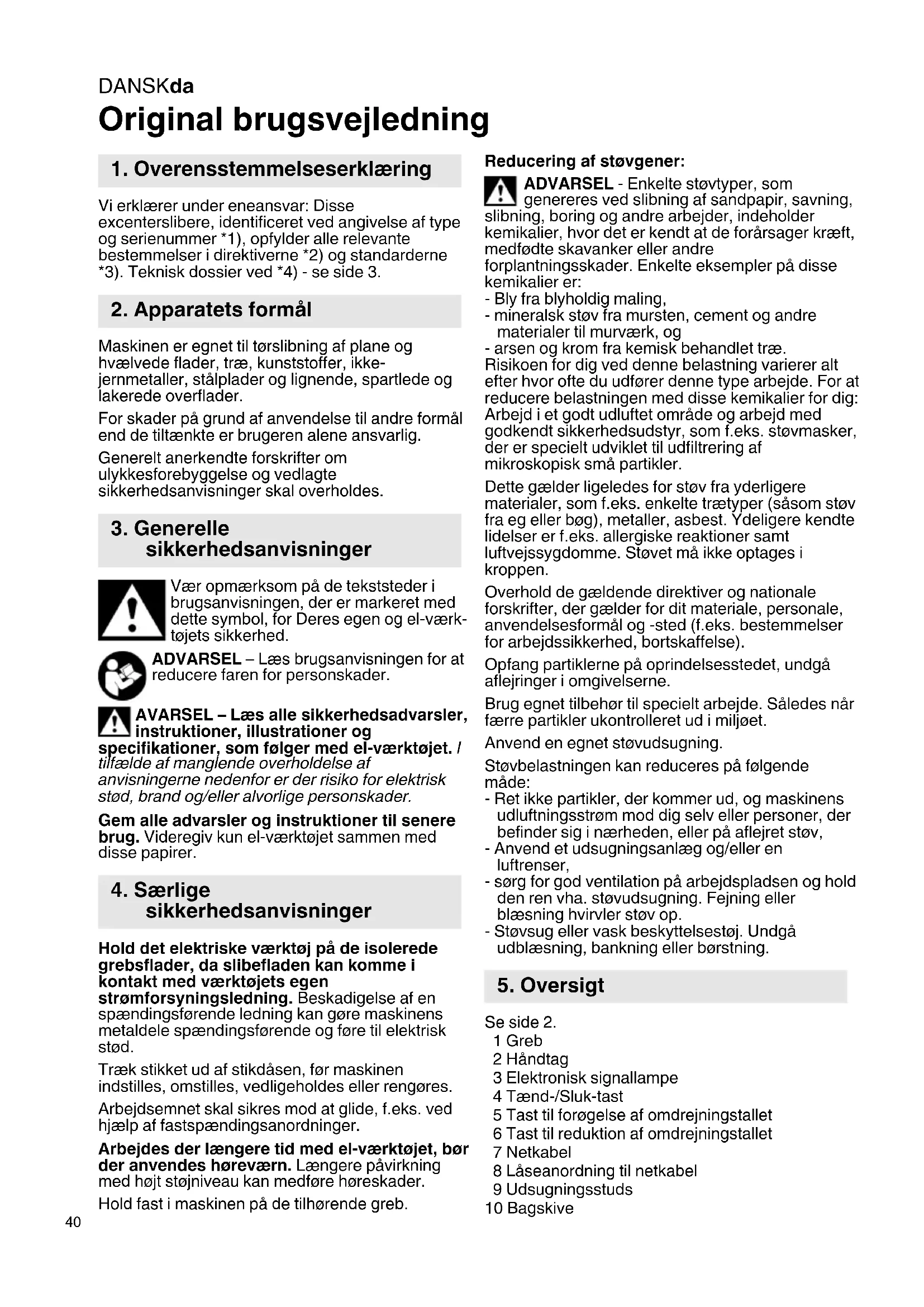 Original brugsvejledning Vi erklærer under eneansvar: Disse excenterslibere, identificeret ved angivelse af type og serienummer *1), opfylder alle relevante bestemmelser i direktiverne *2) og standarderne *3). Teknisk dossier ved *4) - se side 3. Maskinen er egnet til tørslibning af plane og hvælvede flader, træ, kunststoffer, ikke- jernmetaller, stålplader og lignende, spartlede og lakerede overflader. For skader på grund af anvendelse til andre formål end de tiltænkte er brugeren alene ansvarlig. Generelt anerkendte forskrifter om ulykkesforebyggelse og vedlagte sikkerhedsanvisninger skal overholdes. Vær opmærksom på de tekststeder i brugsanvisningen, der er markeret med dette symbol, for Deres egen og el-værk- tøjets sikkerhed. ADVARSEL – Læs brugsanvisningen for at reducere faren for personskader. AVARSEL – Læs alle sikkerhedsadvarsler, instruktioner, illustrationer og specifikationer, som følger med el-værktøjet. I tilfælde af manglende overholdelse af anvisningerne nedenfor er der risiko for elektrisk stød, brand og/eller alvorlige personskader. Gem alle advarsler og instruktioner til senere brug. Videregiv kun el-værktøjet sammen med disse papirer. Hold det elektriske værktøj på de isolerede grebsflader, da slibefladen kan komme i kontakt med værktøjets egen strømforsyningsledning. Beskadigelse af en spændingsførende ledning kan gøre maskinens metaldele spændingsførende og føre til elektrisk stød. Træk stikket ud af stikdåsen, før maskinen indstilles, omstilles, vedligeholdes eller rengøres. Arbejdsemnet skal sikres mod at glide, f.eks. ved hjælp af fastspændingsanordninger. Arbejdes der længere tid med el-værktøjet, bør der anvendes høreværn. Længere påvirkning med højt støjniveau kan medføre høreskader. Hold fast i maskinen på de tilhørende greb. Reducering af støvgener: ADVARSEL - Enkelte støvtyper, som genereres ved slibning af sandpapir, savning, slibning, boring og andre arbejder, indeholder kemikalier, hvor det er kendt at de forårsager kræft, medfødte skavanker eller andre forplantningsskader. Enkelte eksempler på disse kemikalier er: - Bly fra blyholdig maling, - mineralsk støv fra mursten, cement og andre materialer til murværk, og - arsen og krom fra kemisk behandlet træ. Risikoen for dig ved denne belastning varierer alt efter hvor ofte du udfører denne type arbejde. For at reducere belastningen med disse kemikalier for dig: Arbejd i et godt udluftet område og arbejd med godkendt sikkerhedsudstyr, som f.eks. støvmasker, der er specielt udviklet til udfiltrering af mikroskopisk små partikler. Dette gælder ligeledes for støv fra yderligere materialer, som f.eks. enkelte trætyper (såsom støv fra eg eller bøg), metaller, asbest. Ydeligere kendte lidelser er f.eks. allergiske reaktioner samt luftvejssygdomme. Støvet må ikke optages i kroppen. Overhold de gældende direktiver og nationale forskrifter, der gælder for dit materiale, personale, anvendelsesformål og -sted (f.eks. bestemmelser for arbejdssikkerhed, bortskaffelse). Opfang partiklerne på oprindelsesstedet, undgå aflejringer i omgivelserne. Brug egnet tilbehør til specielt arbejde. Således når færre partikler ukontrolleret ud i miljøet. Anvend en egnet støvudsugning. Støvbelastningen kan reduceres på følgende måde: - Ret ikke partikler, der kommer ud, og maskinens udluftningsstrøm mod dig selv eller personer, der befinder sig i nærheden, eller på aflejret støv, - Anvend et udsugningsanlæg og/eller en luftrenser, - sørg for god ventilation på arbejdspladsen og hold den ren vha. støvudsugning. Fejning eller blæsning hvirvler støv op. - Støvsug eller vask beskyttelsestøj. Undgå udblæsning, bankning eller børstning. Se side 2. 1 Greb 2 Håndtag 3 Elektronisk signallampe 4 Tænd-/Sluk-tast 5 Tast til forøgelse af omdrejningstallet 6 Tast til reduktion af omdrejningstallet 7 Netkabel 8 Låseanordning til netkabel 9 Udsugningsstuds 10 Bagskive
