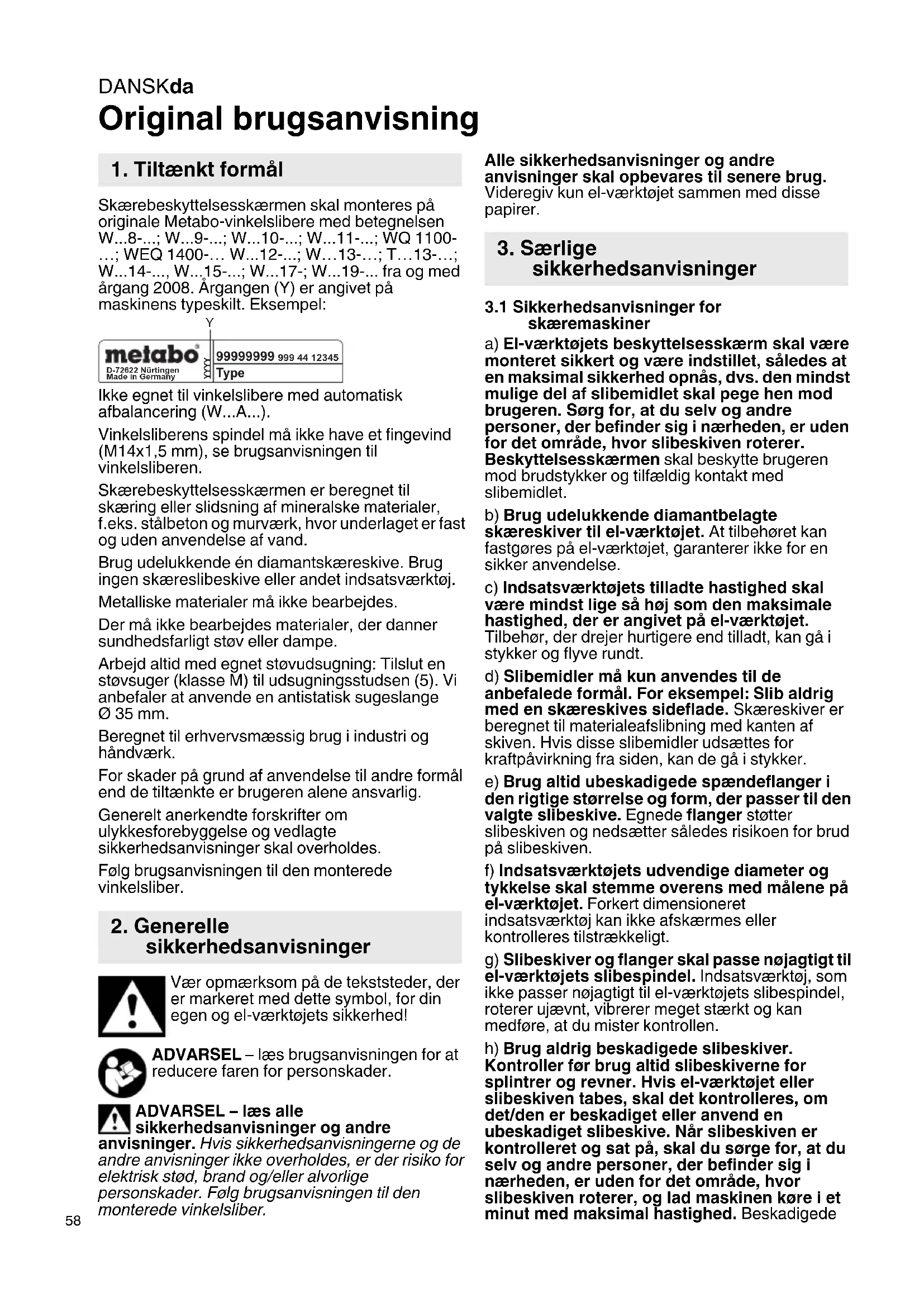 - Original brugsanvisning Skærebeskyttelsesskærmen skal monteres på originale Metabo-vinkelslibere med betegnelsen W - p. 8