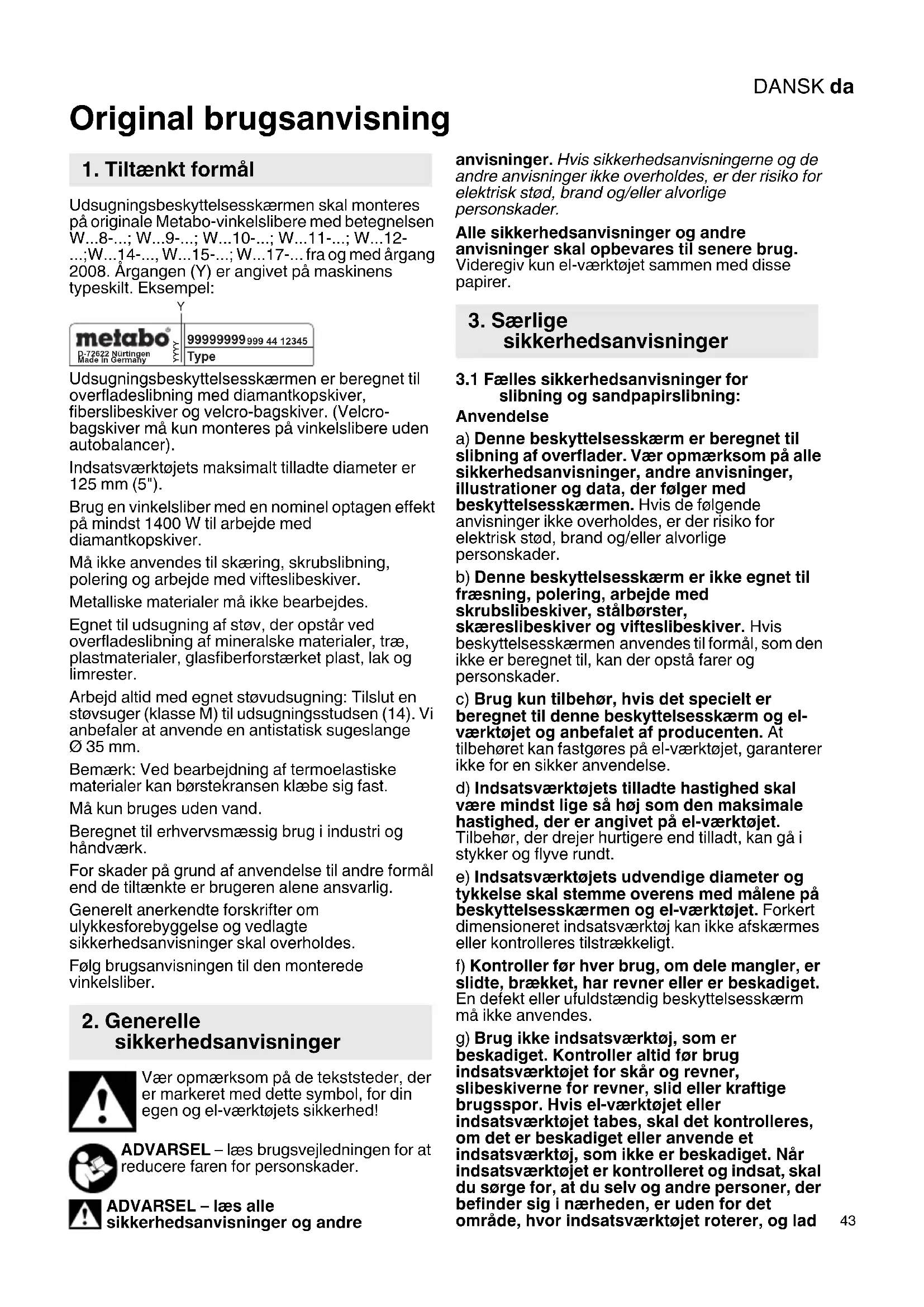- ; W - fra og med årgang 2008. Årgangen (Y) er angivet på maskinens typeskilt. Eksempel: Udsugningsbeskyttelsesskærmen er beregnet til overfladeslibning med diamantkopskiver, fiberslibeskiver og velcro-bagskiver. (Velcro- bagskiver må kun monteres på vinkelslibere uden autobalancer). Indsatsværktøjets maksimalt tilladte diameter er 125 mm (5"). Brug en vinkelsliber med en nominel optagen effekt på mindst 1400 W til arbejde med diamantkopskiver. Må ikke anvendes til skæring, skrubslibning, polering og arbejde med vifteslibeskiver. Metalliske materialer må ikke bearbejdes. Egnet til udsugning af støv, der opstår ved overfladeslibning af mineralske materialer, træ, plastmaterialer, glasfiberforstærket plast, lak og limrester. Arbejd altid med egnet støvudsugning: Tilslut en støvsuger (klasse M) til udsugningsstudsen (14). Vi anbefaler at anvende en antistatisk sugeslange Ø 35 mm. Bemærk: Ved bearbejdning af termoelastiske materialer kan børstekransen klæbe sig fast. Må kun bruges uden vand. Beregnet til erhvervsmæssig brug i industri og håndværk. For skader på grund af anvendelse til andre formål end de tiltænkte er brugeren alene ansvarlig. Generelt anerkendte forskrifter om ulykkesforebyggelse og vedlagte sikkerhedsanvisninger skal overholdes. Følg brugsanvisningen til den monterede vinkelsliber. Vær opmærksom på de tekststeder, der er markeret med dette symbol, for din egen og el-værktøjets sikkerhed! ADVARSEL – læs brugsvejledningen for at reducere faren for personskader. ADVARSEL – læs alle sikkerhedsanvisninger og andre anvisninger. Hvis sikkerhedsanvisningerne og de andre anvisninger ikke overholdes, er der risiko for elektrisk stød, brand og/eller alvorlige personskader. Alle sikkerhedsanvisninger og andre anvisninger skal opbevares til senere brug. Videregiv kun el-værktøjet sammen med disse papirer. p. 17