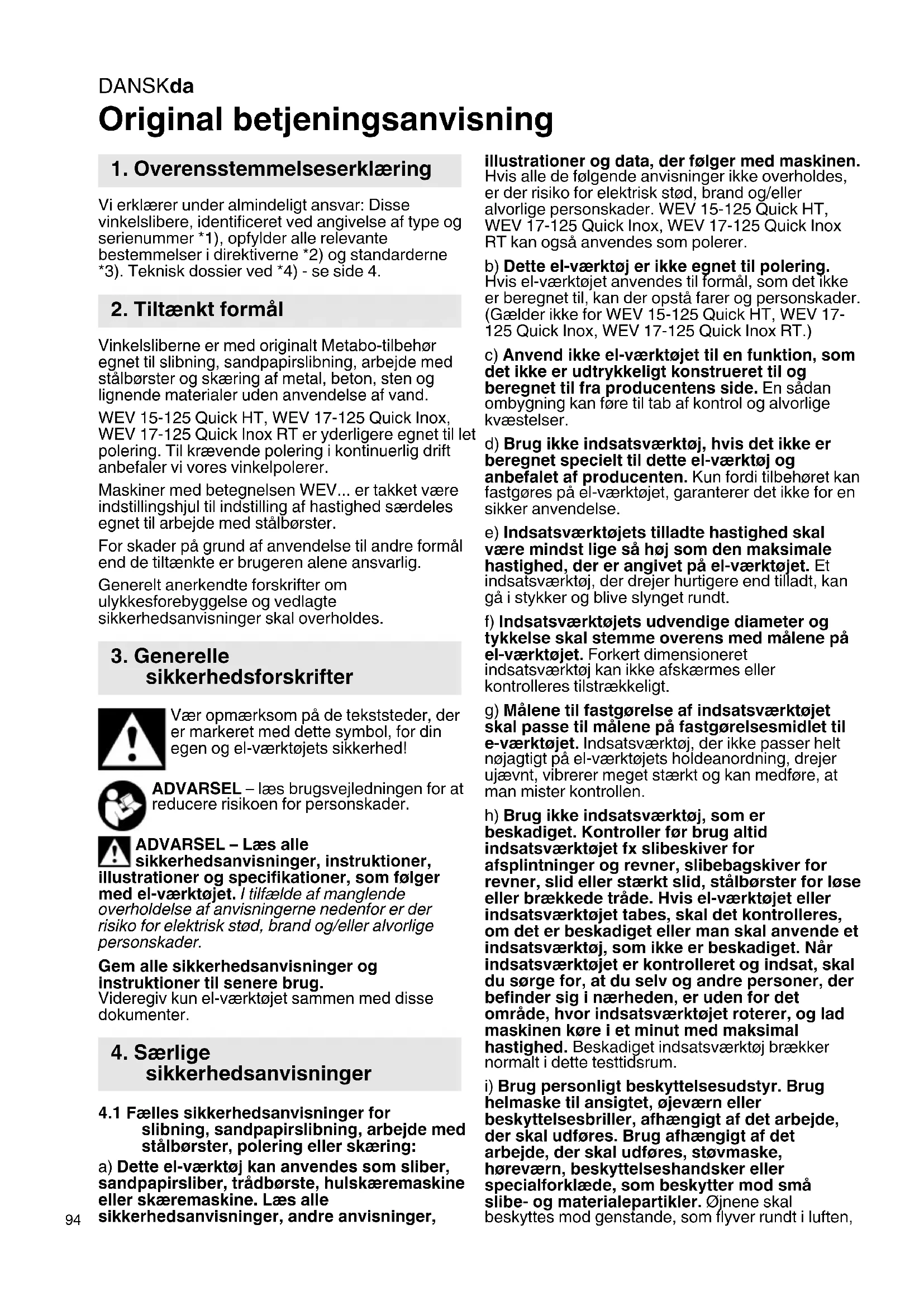 Original betjeningsanvisning Vi erklærer under almindeligt ansvar: Disse vinkelslibere, identificeret ved angivelse af type og serienummer *1), opfylder alle relevante bestemmelser i direktiverne *2) og standarderne *3). Teknisk dossier ved *4) - se side 4. Vinkelsliberne er med originalt Metabo-tilbehør egnet til slibning, sandpapirslibning, arbejde med stålbørster og skæring af metal, beton, sten og lignende materialer uden anvendelse af vand. WEV 15-125 Quick HT, WEV 17-125 Quick Inox, WEV 17-125 Quick Inox RT er yderligere egnet til let polering. Til krævende polering i kontinuerlig drift anbefaler vi vores vinkelpolerer. Maskiner med betegnelsen WEV... er takket være indstillingshjul til indstilling af hastighed særdeles egnet til arbejde med stålbørster. For skader på grund af anvendelse til andre formål end de tiltænkte er brugeren alene ansvarlig. Generelt anerkendte forskrifter om ulykkesforebyggelse og vedlagte sikkerhedsanvisninger skal overholdes. Vær opmærksom på de tekststeder, der er markeret med dette symbol, for din egen og el-værktøjets sikkerhed! ADVARSEL – læs brugsvejledningen for at reducere risikoen for personskader. ADVARSEL – Læs alle sikkerhedsanvisninger, instruktioner, illustrationer og specifikationer, som følger med el-værktøjet. I tilfælde af manglende overholdelse af anvisningerne nedenfor er der risiko for elektrisk stød, brand og/eller alvorlige personskader. Gem alle sikkerhedsanvisninger og instruktioner til senere brug. Videregiv kun el-værktøjet sammen med disse dokumenter.