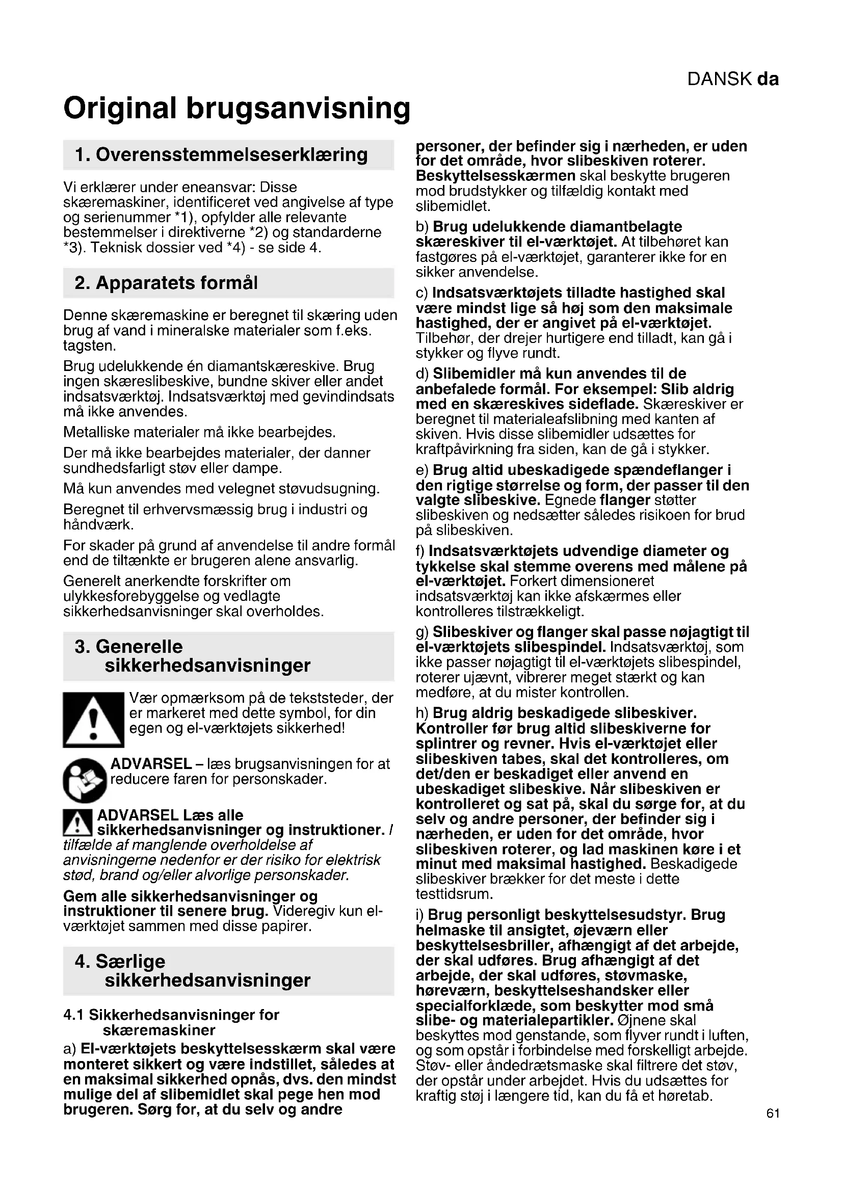 Original brugsanvisning Vi erklærer under eneansvar: Disse skæremaskiner, identificeret ved angivelse af type og serienummer *1), opfylder alle relevante bestemmelser i direktiverne *2) og standarderne *3). Teknisk dossier ved *4) - se side 4. Denne skæremaskine er beregnet til skæring uden brug af vand i mineralske materialer som f.eks. tagsten. Brug udelukkende én diamantskæreskive. Brug ingen skæreslibeskive, bundne skiver eller andet indsatsværktøj. Indsatsværktøj med gevindindsats må ikke anvendes. Metalliske materialer må ikke bearbejdes. Der må ikke bearbejdes materialer, der danner sundhedsfarligt støv eller dampe. Må kun anvendes med velegnet støvudsugning. Beregnet til erhvervsmæssig brug i industri og håndværk. For skader på grund af anvendelse til andre formål end de tiltænkte er brugeren alene ansvarlig. Generelt anerkendte forskrifter om ulykkesforebyggelse og vedlagte sikkerhedsanvisninger skal overholdes. Vær opmærksom på de tekststeder, der er markeret med dette symbol, for din egen og el-værktøjets sikkerhed! ADVARSEL – læs brugsanvisningen for at reducere faren for personskader. ADVARSEL Læs alle sikkerhedsanvisninger og instruktioner. I tilfælde af manglende overholdelse af anvisningerne nedenfor er der risiko for elektrisk stød, brand og/eller alvorlige personskader. Gem alle sikkerhedsanvisninger og instruktioner til senere brug. Videregiv kun el- værktøjet sammen med disse papirer.