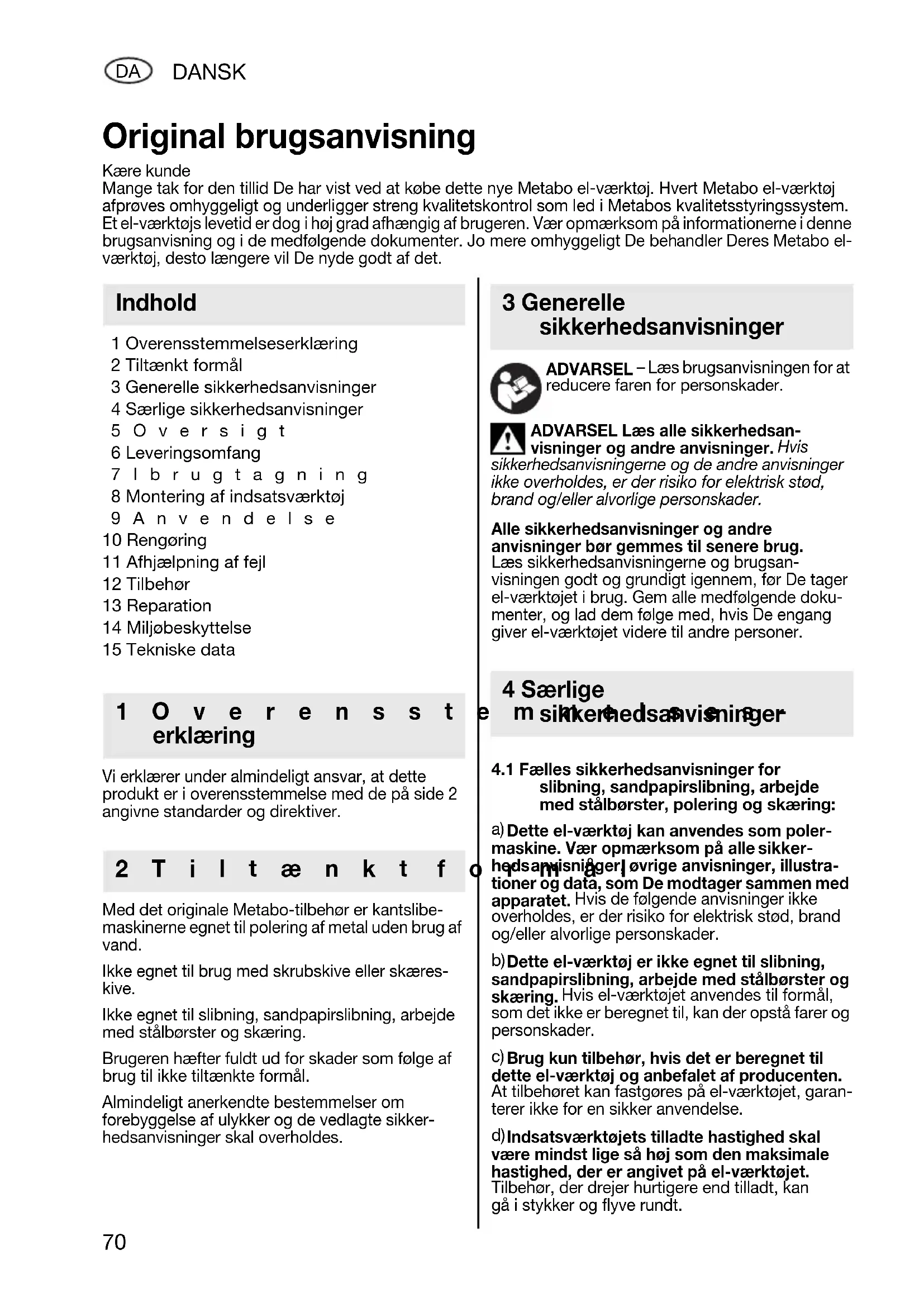1 Overensstemmelseserklæring 2 Tiltænkt formål 3 Generelle sikkerhedsanvisninger 4 Særlige sikkerhedsanvisninger 5Oversigt 6 Leveringsomfang 7Ibrugtagning 8 Montering af indsatsværktøj 9Anvendelse 10 Rengøring 11 Afhjælpning af fejl 12 Tilbehør 13 Reparation 14 Miljøbeskyttelse 15 Tekniske data Vi erklærer under almindeligt ansvar, at dette produkt er i overensstemmelse med de på side 2 angivne standarder og direktiver. Med det originale Metabo-tilbehør er kantslibe- maskinerne egnet til polering af metal uden brug af vand. Ikke egnet til brug med skrubskive eller skæres- kive. Ikke egnet til slibning, sandpapirslibning, arbejde med stålbørster og skæring. Brugeren hæfter fuldt ud for skader som følge af brug til ikke tiltænkte formål. Almindeligt anerkendte bestemmelser om forebyggelse af ulykker og de vedlagte sikker- hedsanvisninger skal overholdes. ADVARSEL – Læs brugsanvisningen for at reducere faren for personskader. ADVARSEL Læs alle sikkerhedsan- visninger og andre anvisninger. Hvis sikkerhedsanvisningerne og de andre anvisninger ikke overholdes, er der risiko for elektrisk stød, brand og/eller alvorlige personskader. Alle sikkerhedsanvisninger og andre anvisninger bør gemmes til senere brug. Læs sikkerhedsanvisningerne og brugsan- visningen godt og grundigt igennem, før De tager el-værktøjet i brug. Gem alle medfølgende doku- menter, og lad dem følge med, hvis De engang giver el-værktøjet videre til andre personer.
