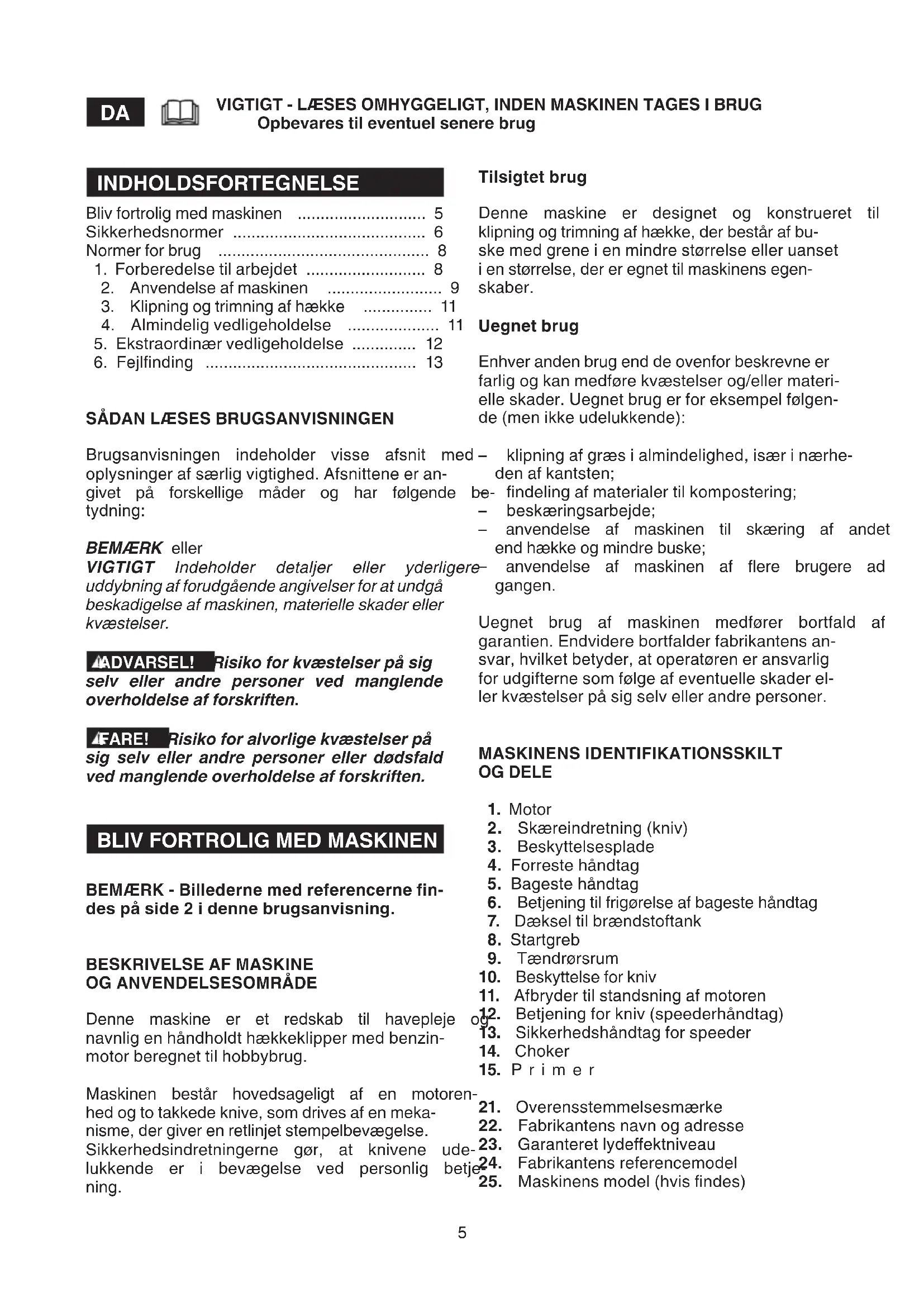 VIGTIGT - LÆSES OMHYGGELIGT, INDEN MASKINEN TAGES I BRUG Opbevares til eventuel senere brug Tilsigtet brug Denne maskine er designet og konstrueret til klipning og trimning af hække, der består af bu- ske med grene i en mindre størrelse eller uanset i en størrelse, der er egnet til maskinens egen- skaber. Uegnet brug Enhver anden brug end de ovenfor beskrevne er farlig og kan medføre kvæstelser og/eller materi- elle skader. Uegnet brug er for eksempel følgen- de (men ikke udelukkende): – klipning af græs i almindelighed, især i nærhe- den af kantsten; – ndeling af materialer til kompostering; – beskæringsarbejde; – anvendelse af maskinen til skæring af andet end hække og mindre buske; – anvendelse af maskinen af ere brugere ad gangen. Uegnet brug af maskinen medfører bortfald af garantien. Endvidere bortfalder fabrikantens an- svar, hvilket betyder, at operatøren er ansvarlig for udgifterne som følge af eventuelle skader el- ler kvæstelser på sig selv eller andre personer. MASKINENS IDENTIFIKATIONSSKILT OG DELE