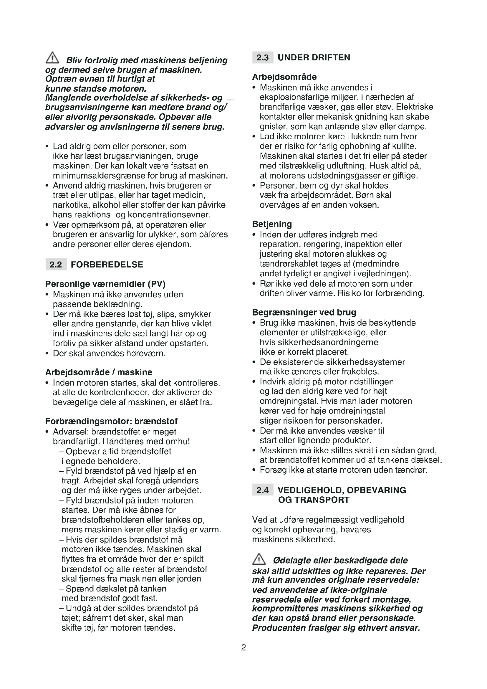 Denne maskine er en forbrændingsmotor. En motors ydelse, korrekte funktion og levetid afhænger af mange faktorer. Det kan være ydre omstændigheder eller omstændigheder der afhænger af kvaliteten på de anvendte produkter og det regelmæssige vedligehold. Nedenfor er anført nogle supplerende oplysninger, der muliggør en mere kvaliceret brug af maskinen. Enhver anden brug end de ovenfor beskrevne kan være farlig og risikere at medføre kvæstelser og/eller materielle skader. VIGTIGT Uegnet brug af maskinen medfører, at garantien bortfalder. Endvidere ophører producentens ansvar, hvilket betyder, at brugeren selv er ansvarlig for eventuelle udgifter som følge af skader eller kvæstelser på sig selv eller andre personer.