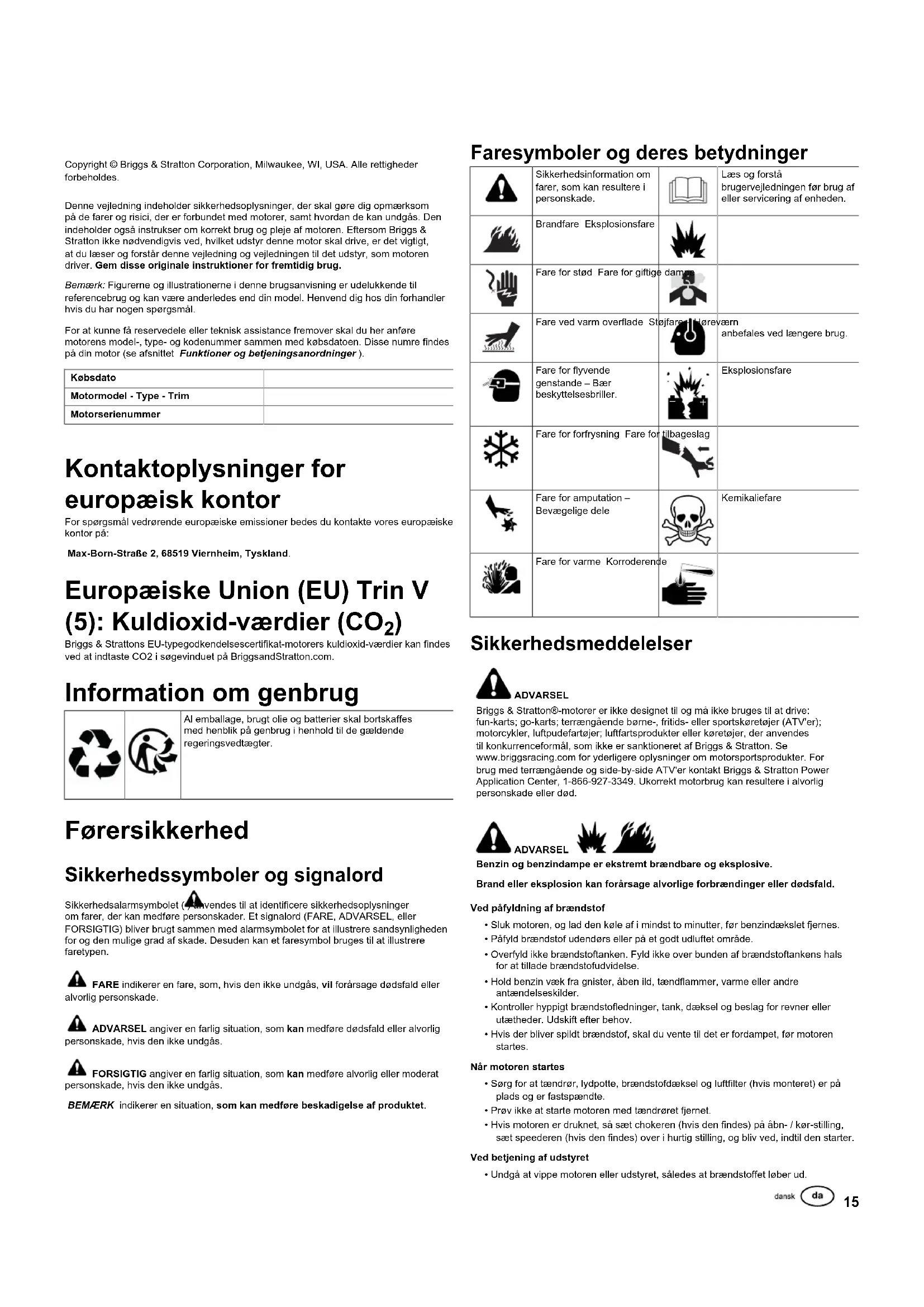Al emballage, brugt olie og batterier skal bortskaffes med henblik på genbrug i henhold til de gældende regeringsvedtægter. Førersikkerhed Sikkerhedssymboler og signalord Sikkerhedsalarmsymbolet ( ) anvendes til at identificere sikkerhedsoplysninger om farer, der kan medføre personskader. Et signalord (FARE, ADVARSEL, eller FORSIGTIG) bliver brugt sammen med alarmsymbolet for at illustrere sandsynligheden for og den mulige grad af skade. Desuden kan et faresymbol bruges til at illustrere faretypen. FARE indikerer en fare, som, hvis den ikke undgås, vil forårsage dødsfald eller alvorlig personskade. ADVARSEL angiver en farlig situation, som kan medføre dødsfald eller alvorlig personskade, hvis den ikke undgås. FORSIGTIG angiver en farlig situation, som kan medføre alvorlig eller moderat personskade, hvis den ikke undgås. BEMÆRKindikerer en situation,som kan medføre beskadigelse af produktet. Faresymboler og deres betydninger Sikkerhedsinformation om farer, som kan resultere i personskade. Læs og forstå brugervejledningen før brug af eller servicering af enheden. Brandfare Eksplosionsfare Fare for stød Fare for giftige dampe Fare ved varm overflade Støjfare – Høreværn anbefales ved længere brug. Fare for flyvende genstande – Bær beskyttelsesbriller. Eksplosionsfare Fare for forfrysning Fare for tilbageslag Fare for amputation – Bevægelige dele Kemikaliefare Fare for varme Korroderende Sikkerhedsmeddelelser ADVARSEL Briggs & Stratton®-motorer er ikke designet til og må ikke bruges til at drive: fun-karts; go-karts; terrængående børne-, fritids- eller sportskøretøjer (ATV'er); motorcykler, luftpudefartøjer; luftfartsprodukter eller køretøjer, der anvendes til konkurrenceformål, som ikke er sanktioneret af Briggs & Stratton. Se www.briggsracing.com for yderligere oplysninger om motorsportsprodukter. For brug med terrængående og side-by-side ATV'er kontakt Briggs & Stratton Power Application Center, 1-866-927-3349. Ukorrekt motorbrug kan resultere i alvorlig personskade eller død. ADVARSEL Benzin og benzindampe er ekstremt brændbare og eksplosive. Brand eller eksplosion kan forårsage alvorlige forbrændinger eller dødsfald. Ved påfyldning af brændstof