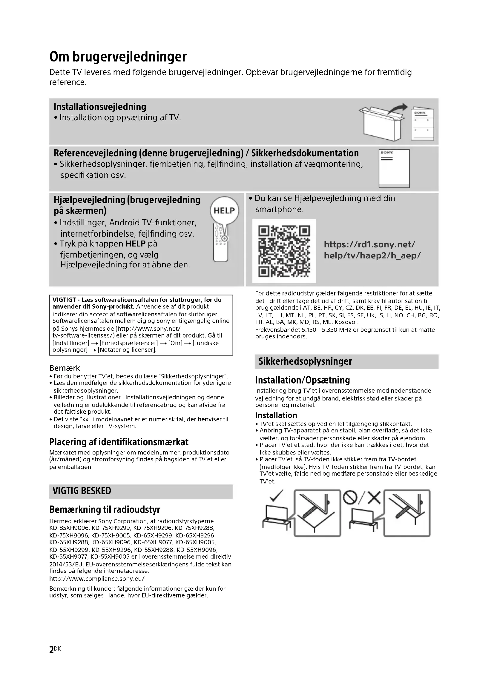- Før du benytter TV'et, bedes du læse "Sikkerhedsoplysninger".• Læs den medfølgende sikkerhedsdokumentation for yderligere sikkerhedsoplysninger.• Billeder og illustrationer i Installationsvejledningen og denne vejledning er udelukkende til referencebrug og kan afvige fra det faktiske produkt.• Det viste "xx" i modelnavnet er et numerisk tal, der henviser til design, farve eller TV-system. Placering af identifikationsmærkat Mærkatet med oplysninger om modelnummer, produktionsdato (år/måned) og strømforsyning findes på bagsiden af TV'et eller på emballagen. VIGTIG BESKED Bemærkning til radioudstyr Hermed erklærer Sony Corporation, at radioudstyrstyperne KD-85XH9096, KD-75XH9299, KD-75XH9296, KD-75XH9288, KD-75XH9096, KD-75XH9005, KD-65XH9299, KD-65XH9296, KD-65XH9288, KD-65XH9096, KD-65XH9077, KD-65XH9005, KD-55XH9299, KD-55XH9296, KD-55XH9288, KD-55XH9096, KD-55XH9077, KD-55XH9005 er i overensstemmelse med direktiv 2014/53/EU. EU-overensstemmelseserklæringens fulde tekst kan findes på følgende internetadresse: http://www.compliance.sony.eu/Bemærkning til kunder: følgende informationer gælder kun for udstyr, som sælges i lande, hvor EU-direktiverne gælder.For dette radioudstyr gælder følgende restriktioner for at sætte det i drift eller tage det ud af drift, samt krav til autorisation til brug gældende i AT, BE, HR, CY, CZ, DK, EE, FI, FR, DE, EL, HU, IE, IT, LV, LT, LU, MT, NL, PL, PT, SK, SI, ES, SE, UK, IS, LI, NO, CH, BG, RO, TR, AL, BA, MK, MD, RS, ME, Kosovo :Frekvensbåndet 5.150 - 5.350 MHz er begrænset til kun at måtte bruges indendørs. Sikkerhedsoplysninger Installation/Opsætning Installer og brug TV'et i overensstemmelse med nedenstående vejledning for at undgå brand, elektrisk stød eller skader på personer og materiel. Installation